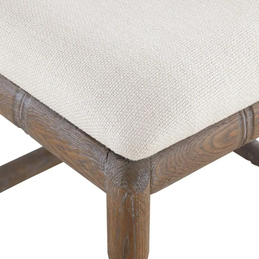 Our Hampton Collection interprets lavish Chinoiserie design through the lens of beachy relaxation. The result? Fabulous furnishings which take you away to a pacific paradise. The limed oak frame of the Hampton Counter Stool is carved to resemble bamboo, underscoring the piece’s inherently organic impression. Subtle nods to its Asian inspiration could be found in the elegant fretwork of its back and the slight curves of its front legs. A simple linen drop-in cushion completes its laid-back appeal. A lovely set for a kitchen in a breezy beach home or modern country cottage. Our counter stools are the perfect height and proportions for a kitchen island or bar.
