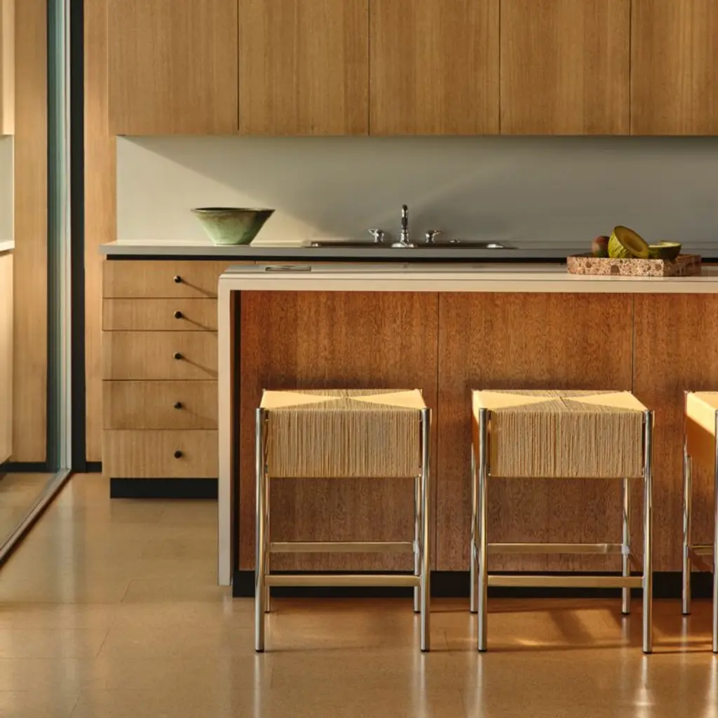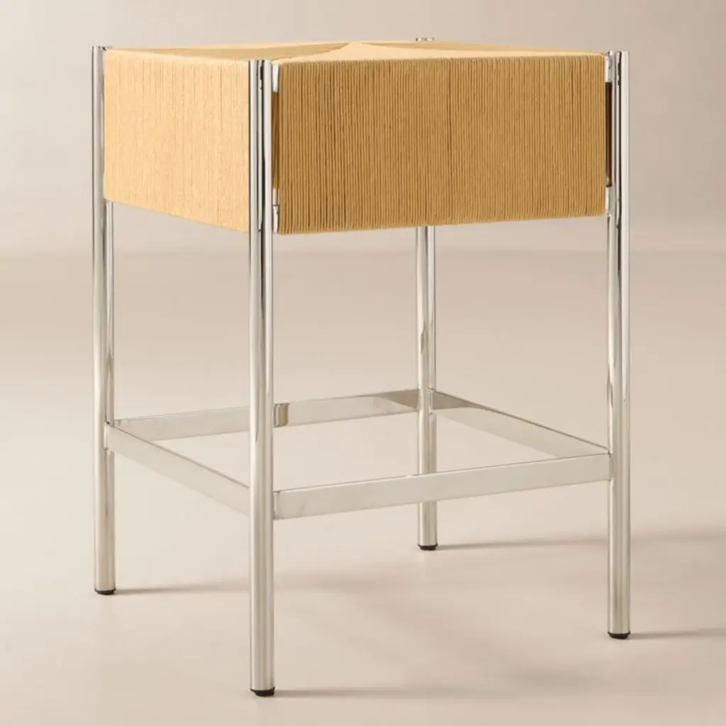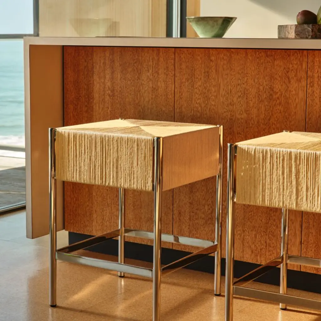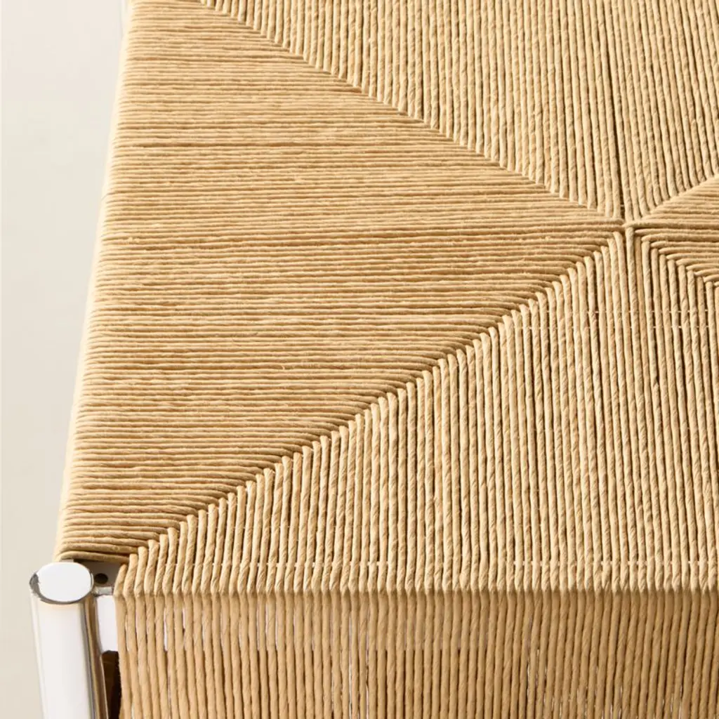 Counter stool by Kravitz Design channels the restrained elegance of Danish modernism. Crafted with a handwoven natural cord seat, its precise geometric pattern offers subtle texture and visual interest that contrasts against the minimalist metal frame. CB2 exclusive.