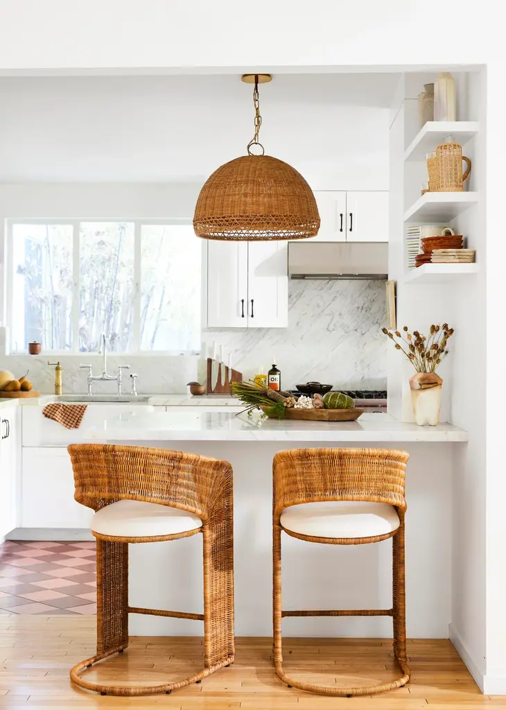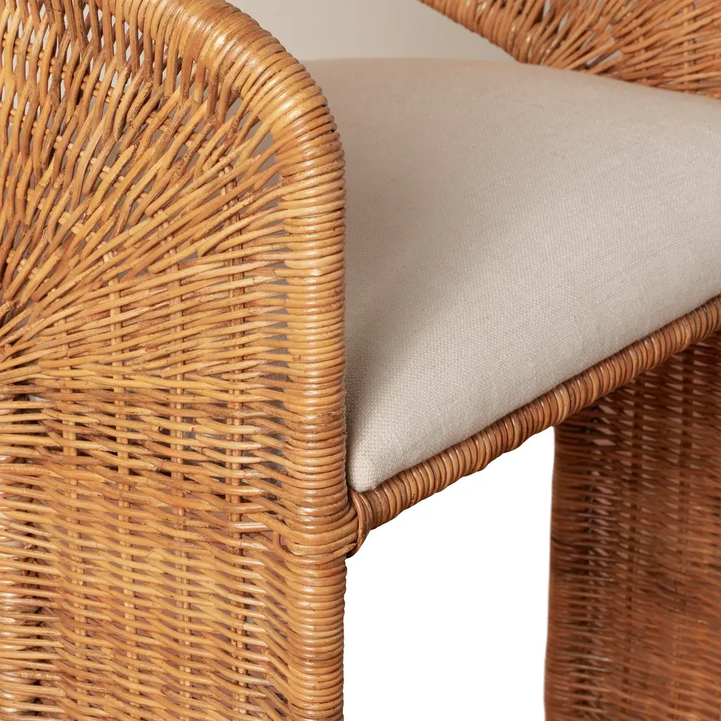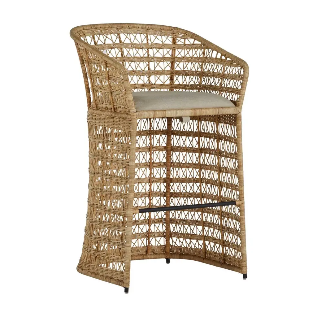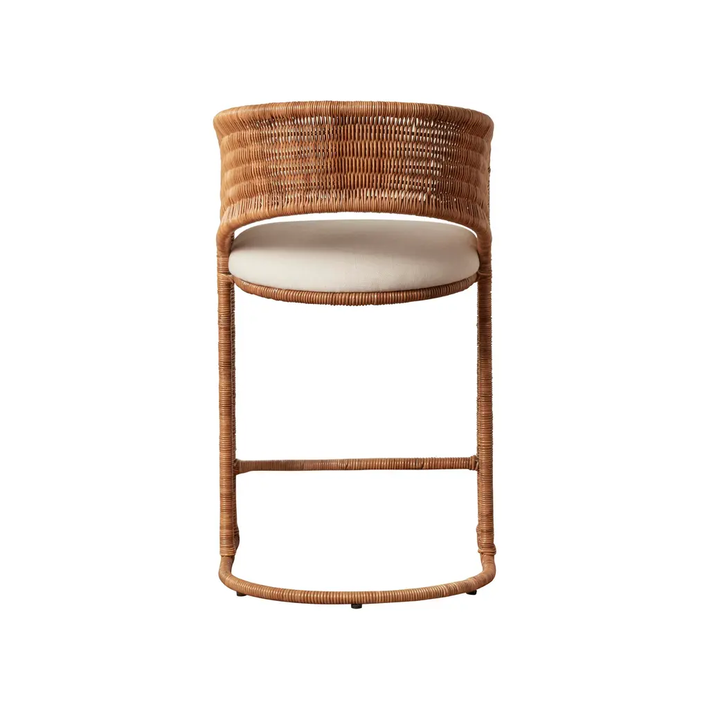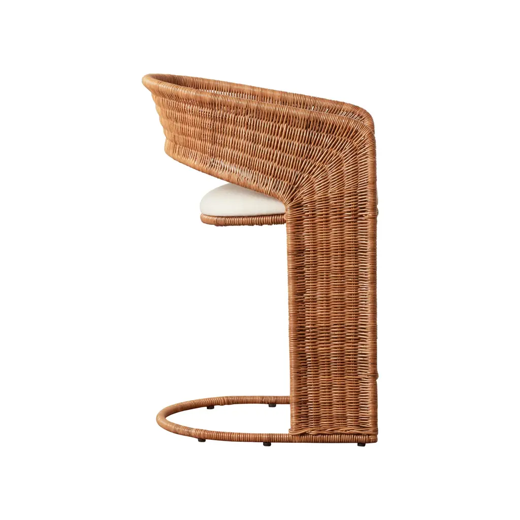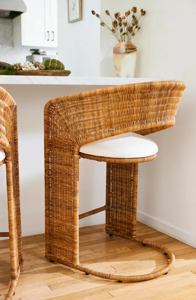 Inspired by a particularly special vintage find, this architectural curved-back counter stool unites organic textures and sculptural clean lines thanks to expertly shaped and woven rattan. Completed with an upholstered linen or boucle cushion, this chair effortlessly elevates kitchen spaces with a touch of relaxed refinement. Wipe rattan clean with a soft, dry microfiber cloth. Avoid the use of cleaners and abrasives, as these will damage the material. Avoid standing or kneeling on woven furniture to prevent breakage. If you live in a dry climate, woven furniture can be lightly misted with a spray bottle once a month and hydrated annually with boiled linseed oil.