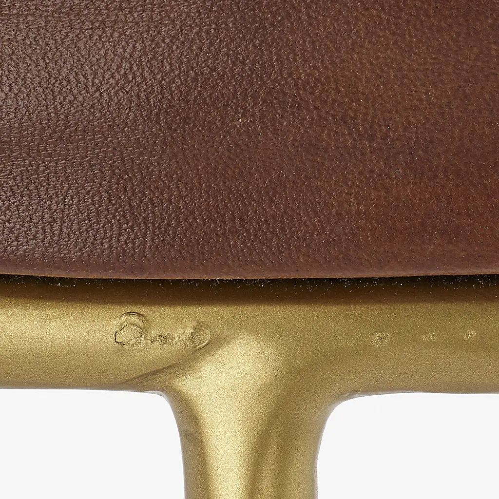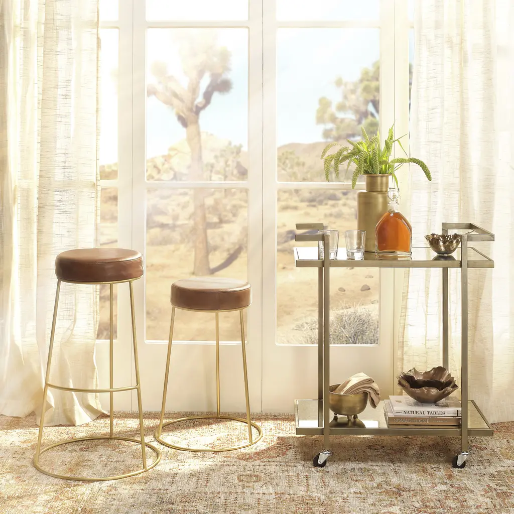These unique stools are available in bar or counter height. Each features a comfortably padded round seat in top-quality matte brown leather that tops an asymmetrical tri-legged base in a modern metallic finish. The contrast between the sleek, slim brass base and the substantial seat is elegant and unexpected, and results in the perfect perch for home bar or kitchen counter!