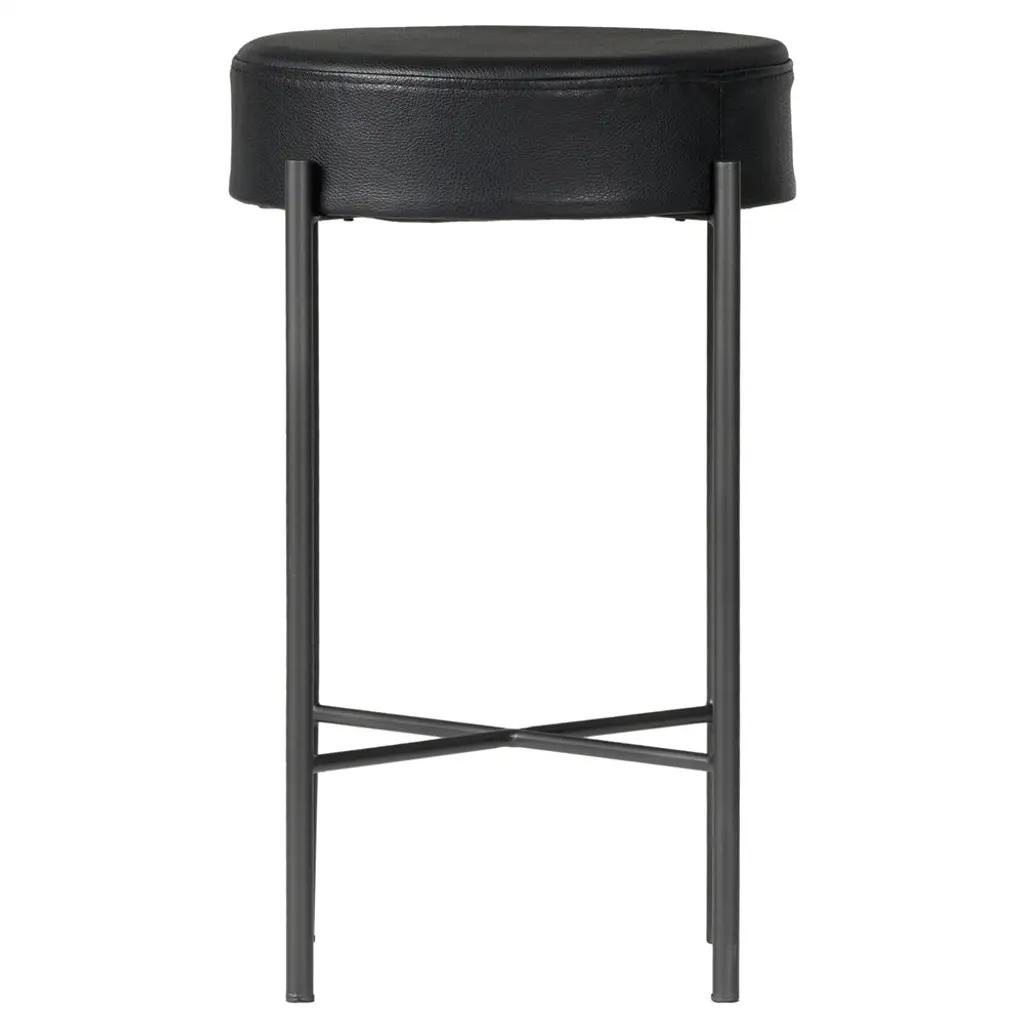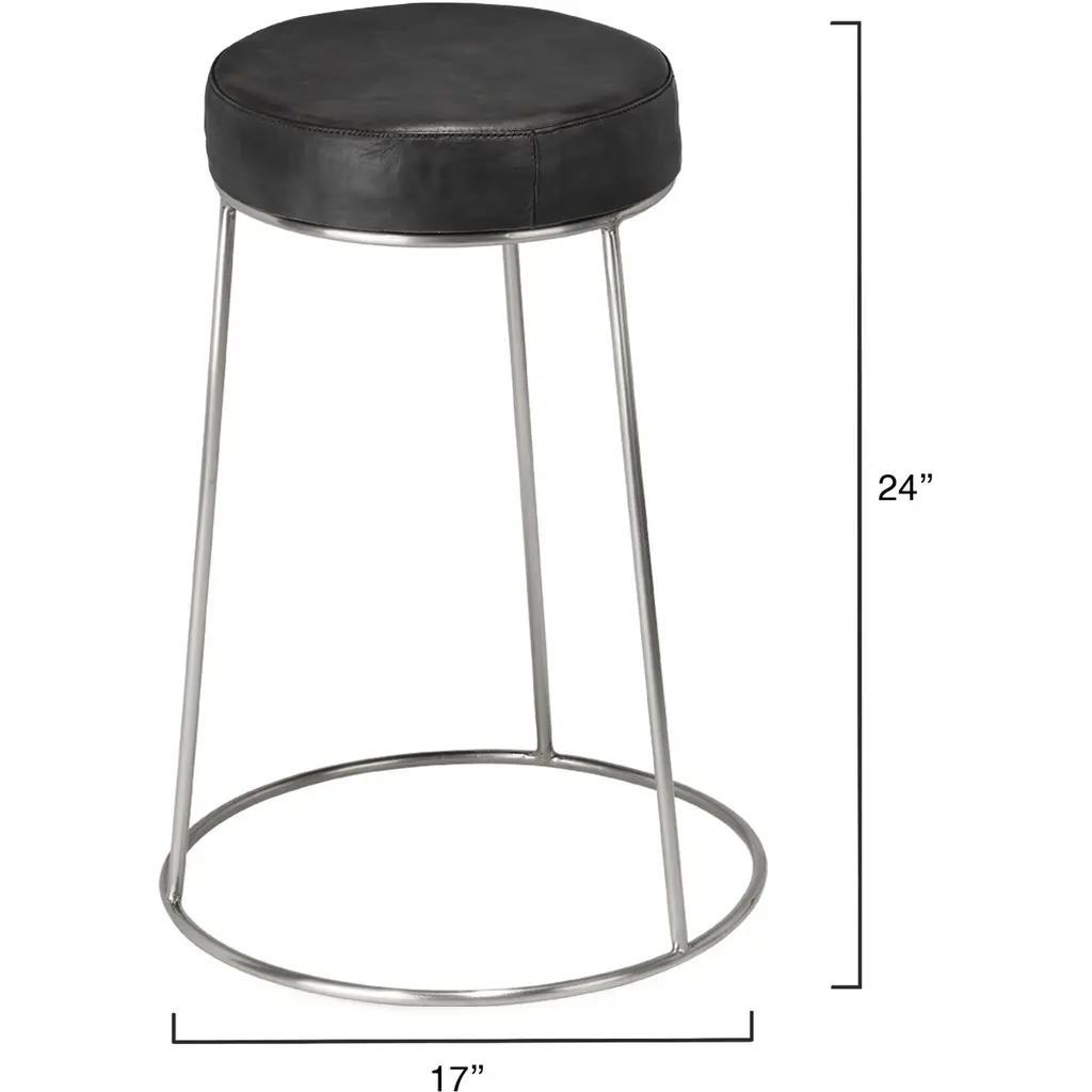 These unique stools are available in bar or counter height. Each features a comfortably padded round seat in top-quality matte charcoal leather that tops an asymmetrical tri-legged base in a modern metallic finish. The contrast between the sleek, slim pewter base and the substantial seat is elegant and unexpected, and results in the perfect perch for home bar or kitchen counter!