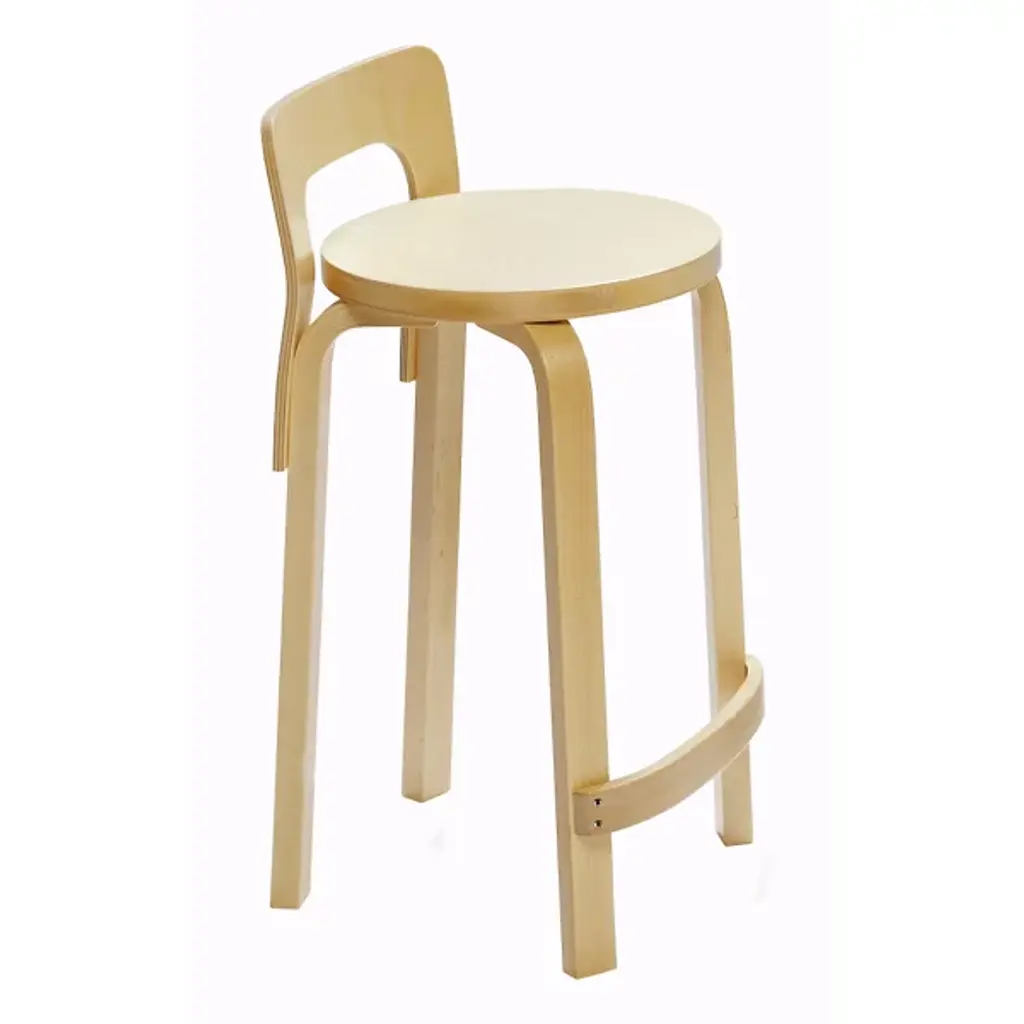 The Artek High Chair K65 takes its design cue from Aalto's Stool 60. That innovative original features a round birch slab seat and bent birch legs. The High Chair K65 has the same basic structure, but elongated several inches. A short bent plywood back adds visual interest as well as support to this counter height stool.