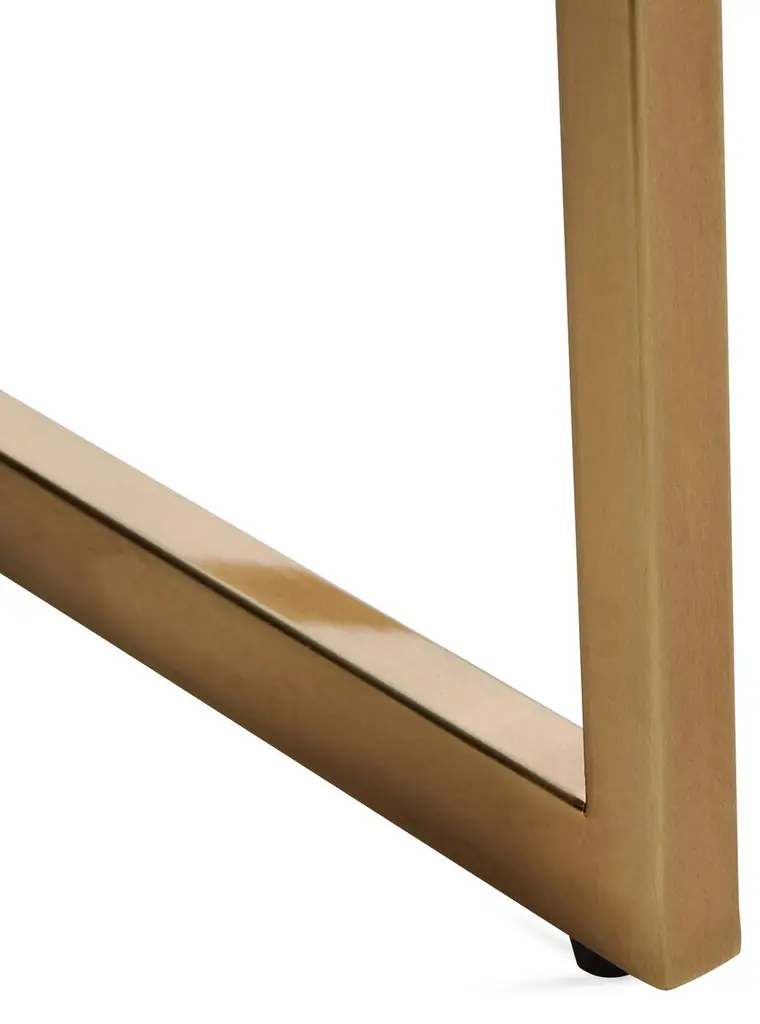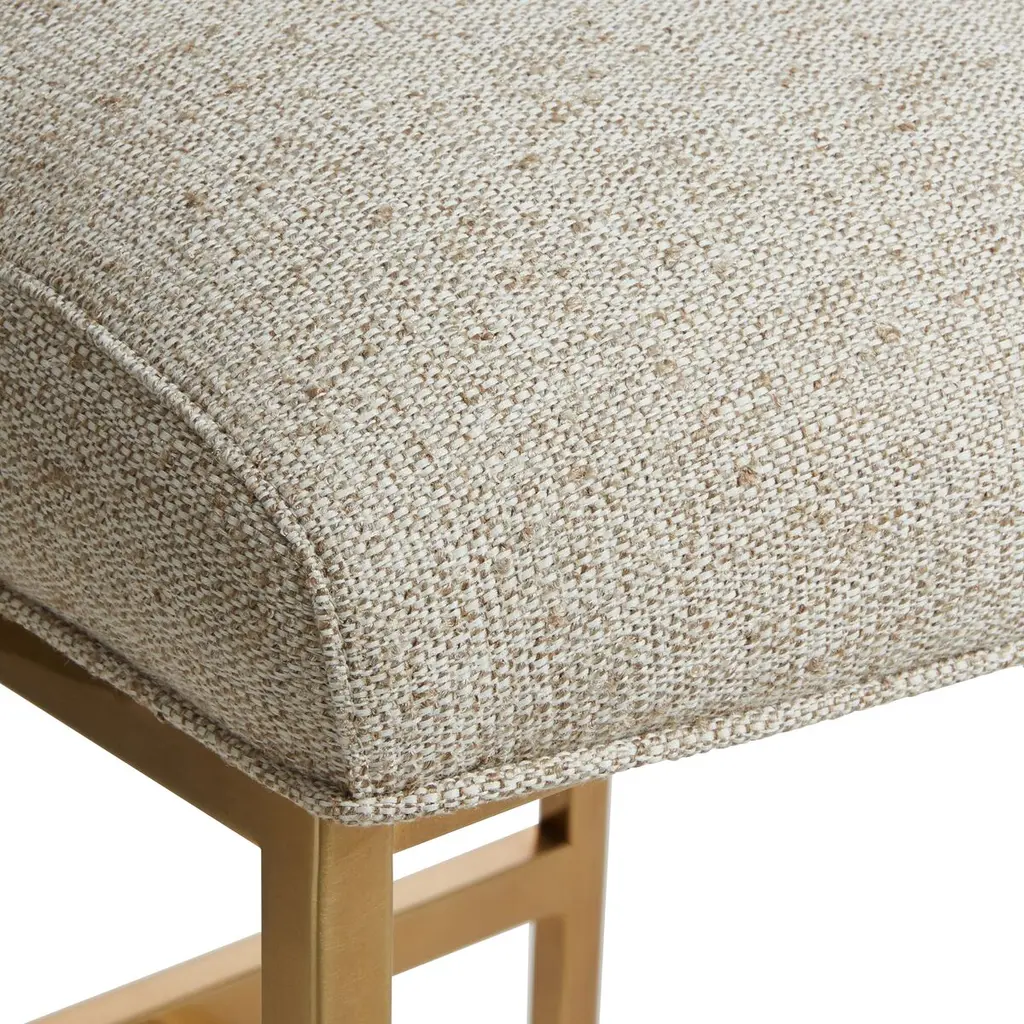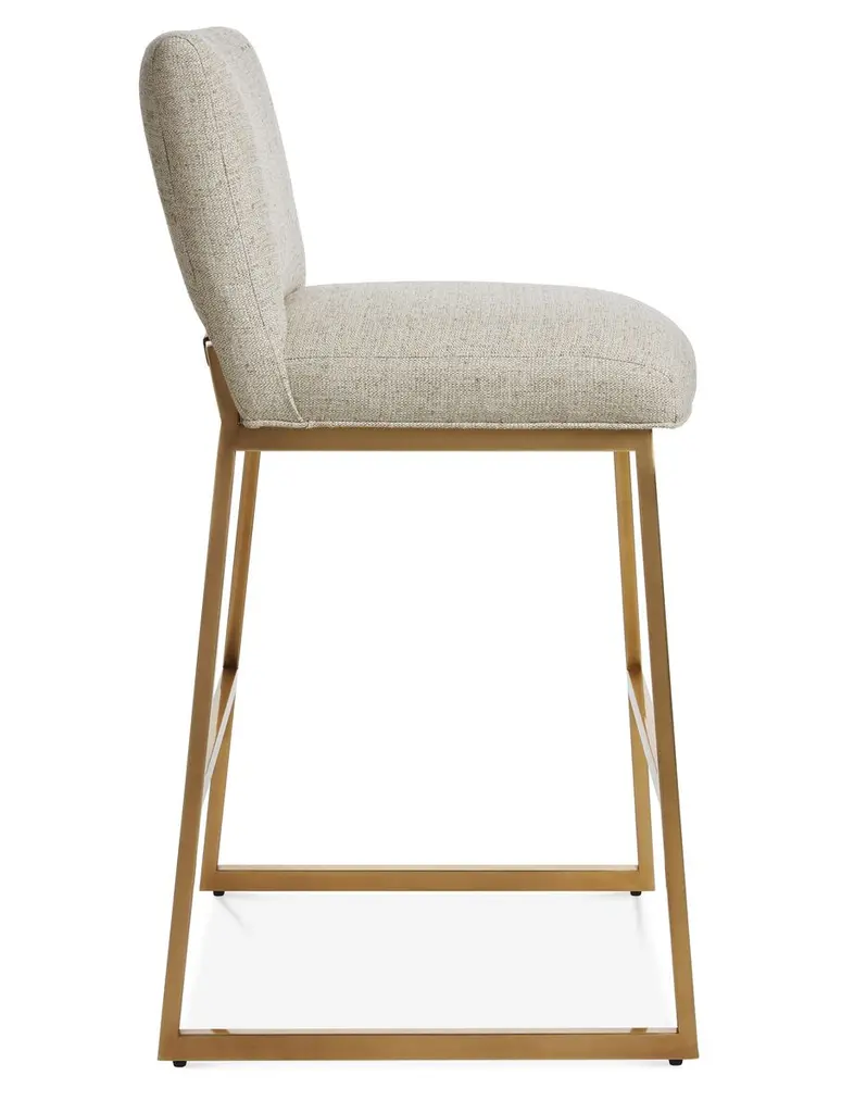 Exclusive to One Kings Lane: Set on a gleaming brass base, this modern counter stool is topped with an upholstered seat covered in Crypton--an eco-friendly high-performance fabric that repels stains, spills, bacteria, and mold--and filled with down-wrapped foam with a cotton duck core. A handle on the back of the stool is wrapped in coordinating leather for added flair.