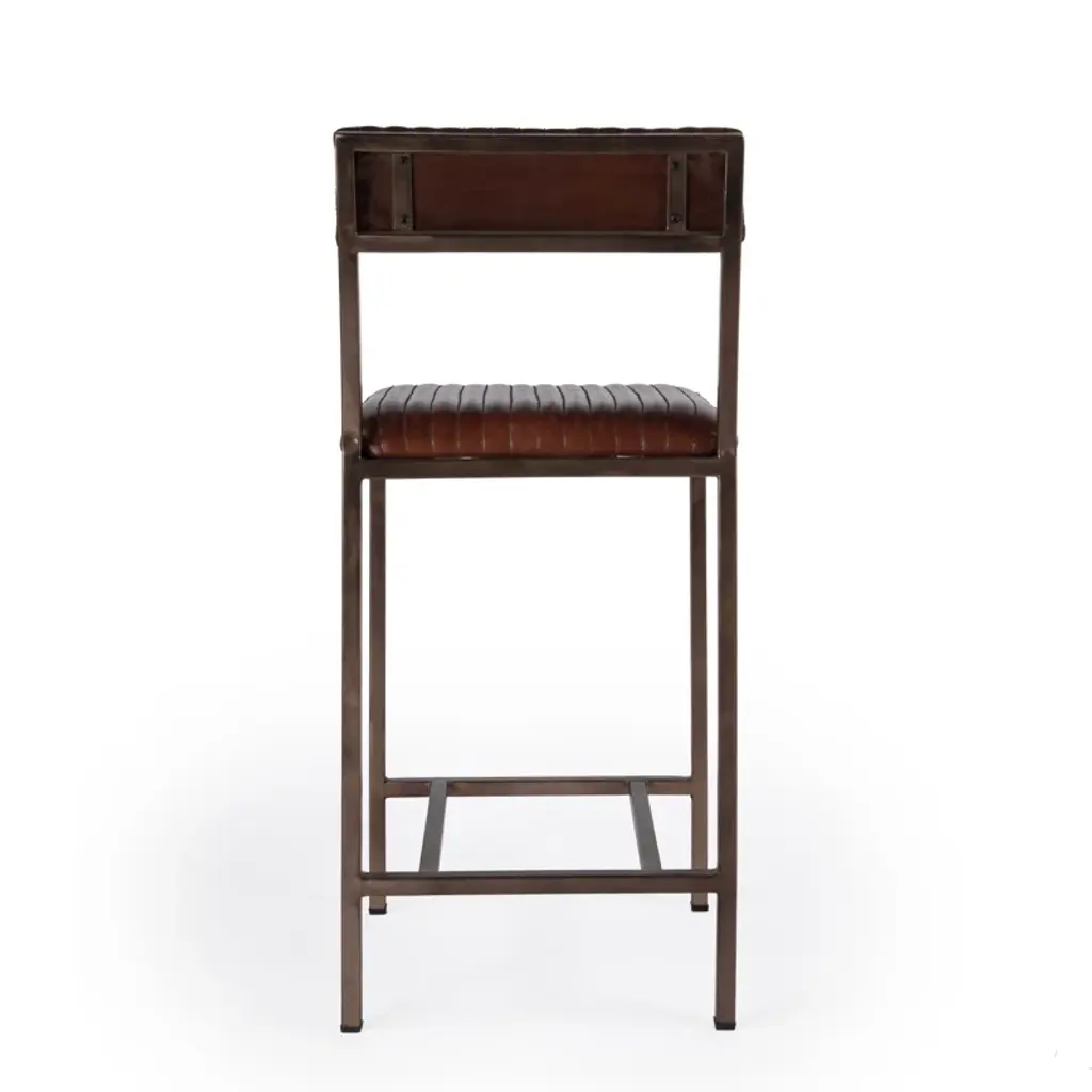 The perfect balance of industrial and modern in this high back vintage looking counter stool. The padded seat and seat back offer comfort and the soft genuine leather make for a handsome addition to your kitchen island or peninsula. Its angular gold iron frame offers strength and durability so you can sit for hours on end.
