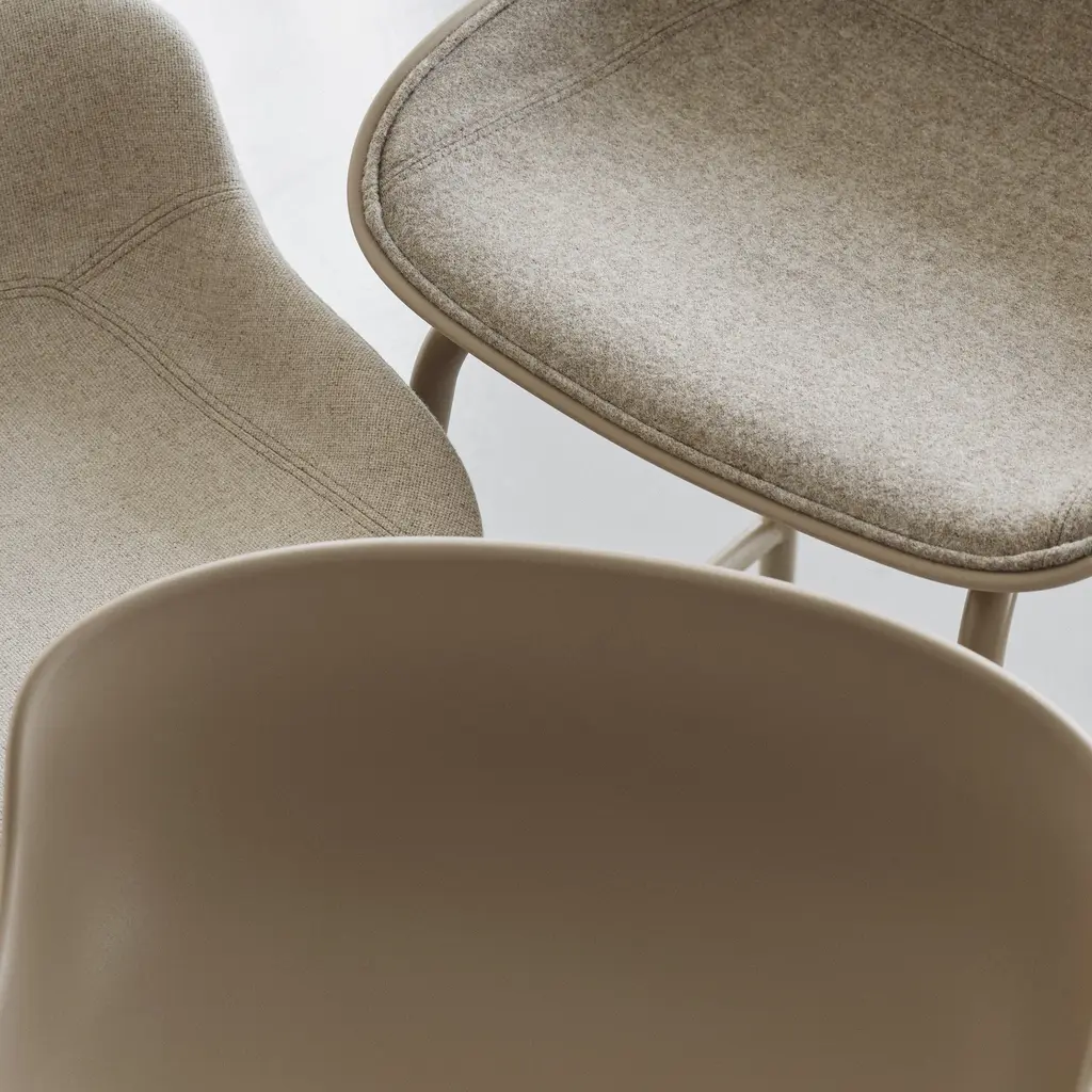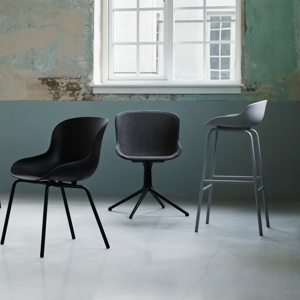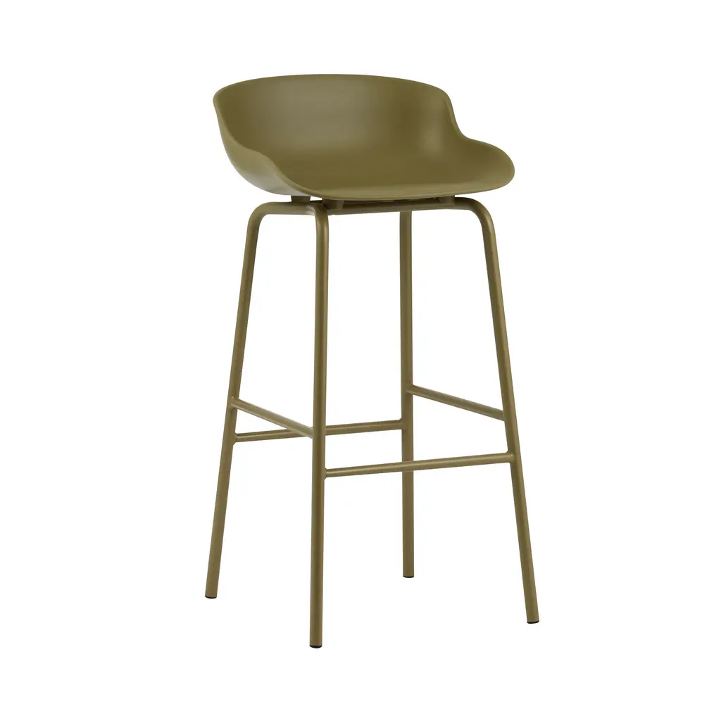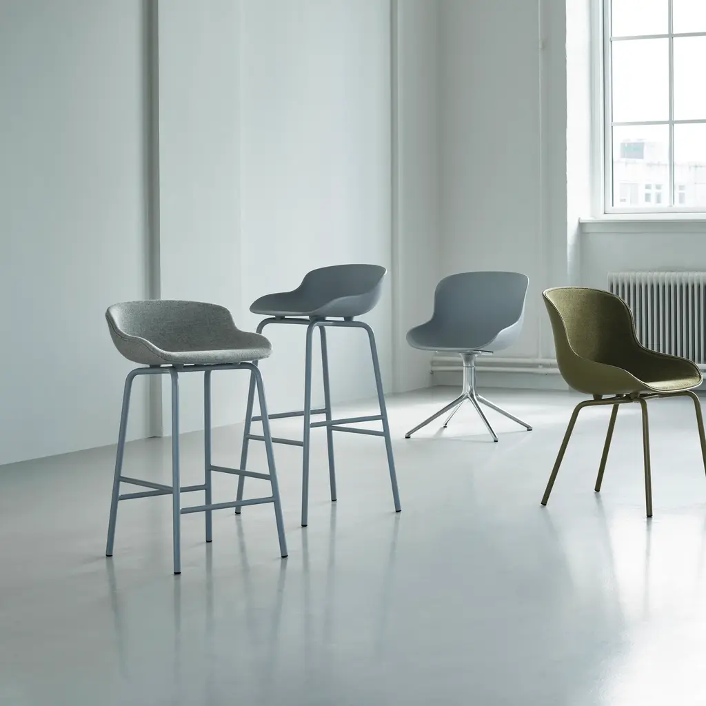 Adding to Hyg's exclusive range, designer Simon Legald offers a high stool with the same sculptural lines and encircling contours of his original cozy molded chair. In either bar or height, the ample curved seat accommodates a range of comfortable positions while the raised edges add a feeling of security. Available in a range of naturalistic hues, the seating has matching powder-coated steel legs with an integreted footrest.