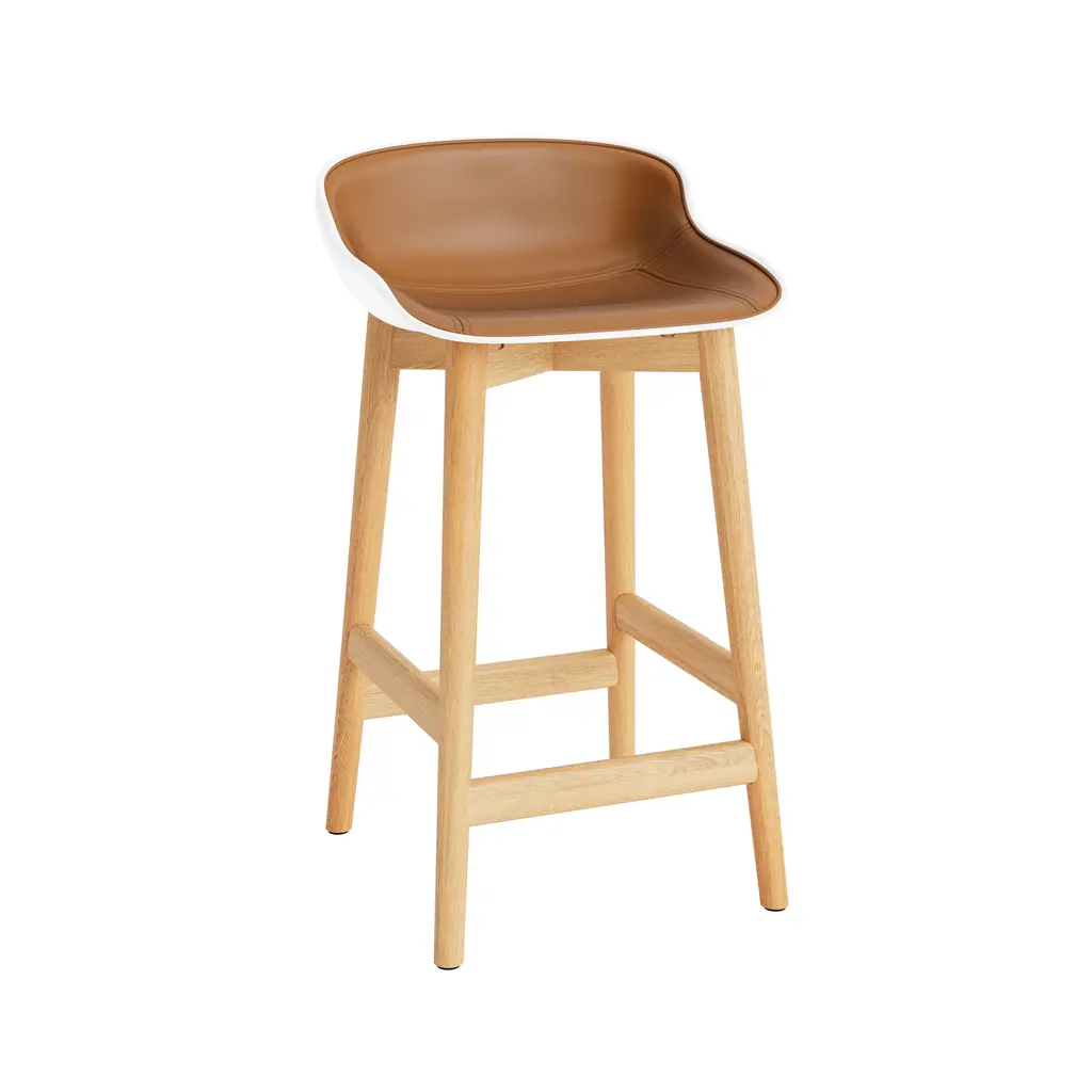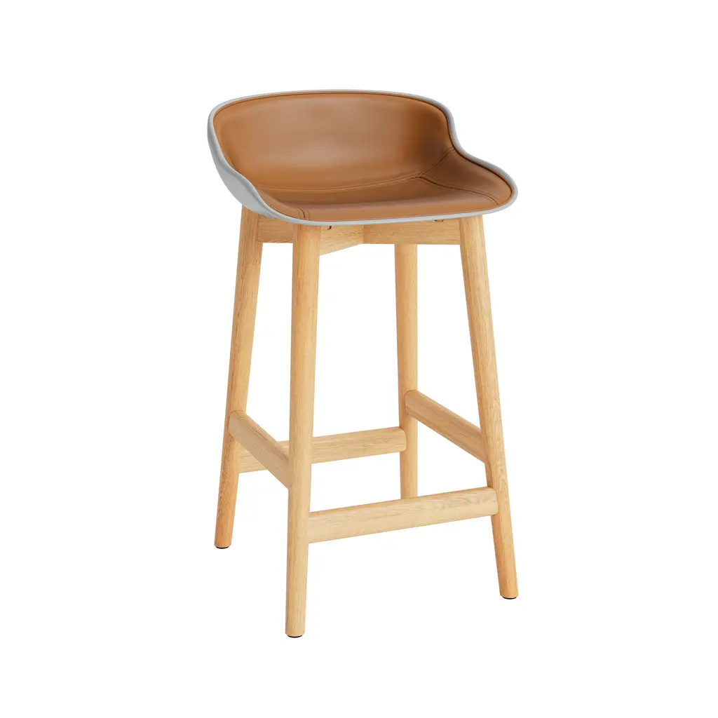 Also in a counter-height version, designer Simon Legald adapts his Hyg collection to a molded stool with custom front-facing upholstery. It’s his interpretation of _hygge_, the Danish ode to contentment, complete with an extra layer of comfort from the cushioned interior clad in one of Normann Copenhagen’s to go with the molded shell, the solid-oak base incorporates a built-in footrest and comes in either natural or black-painted versions, both with a lacquered gloss.