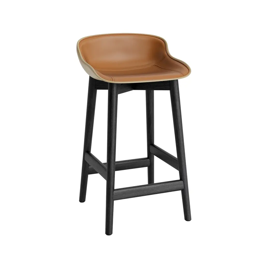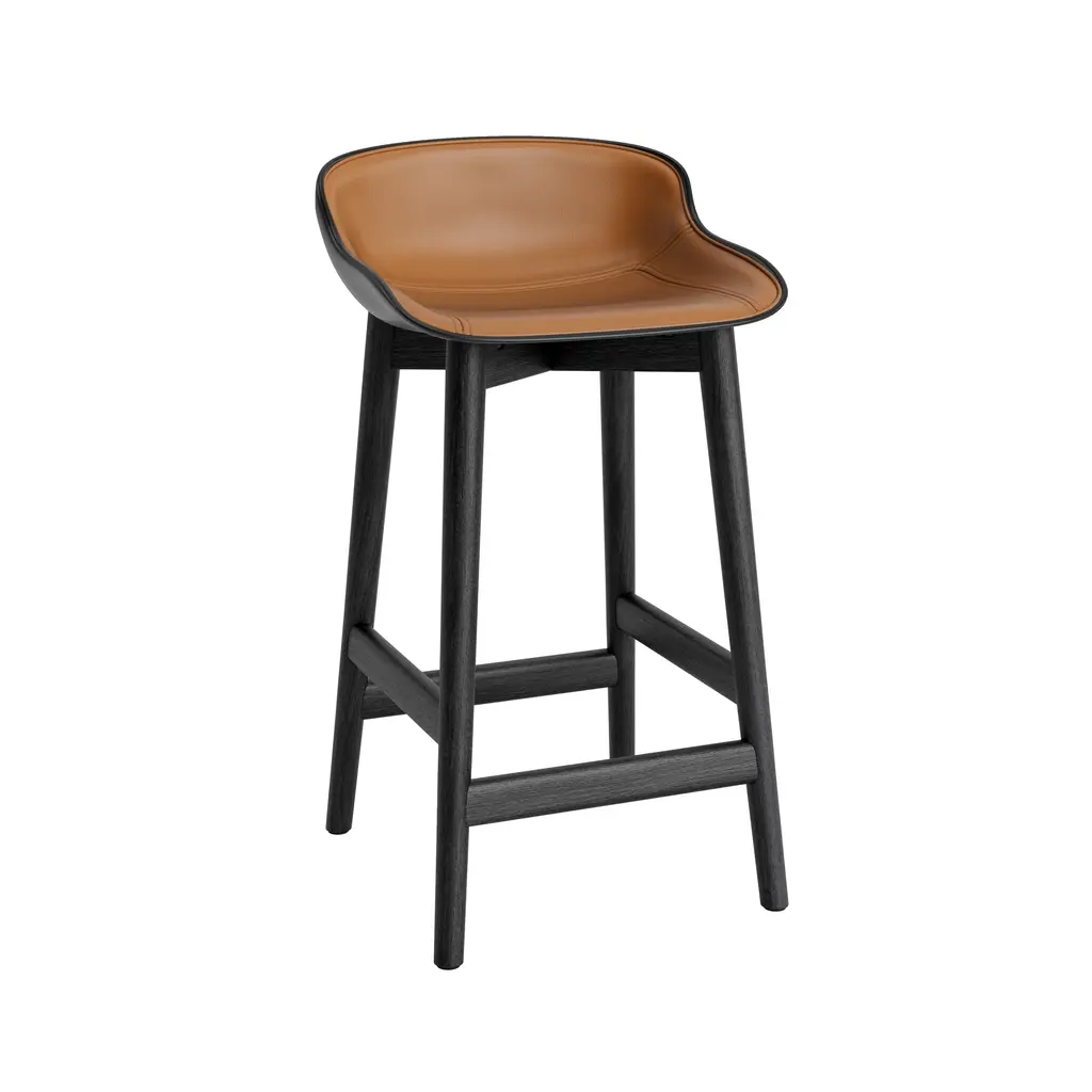 Also in a counter-height version, designer Simon Legald adapts his Hyg collection to a molded stool with custom front-facing upholstery. It’s his interpretation of _hygge_, the Danish ode to contentment, complete with an extra layer of comfort from the cushioned interior clad in one of Normann Copenhagen’s to go with the molded shell, the solid-oak base incorporates a built-in footrest and comes in either natural or black-painted versions, both with a lacquered gloss.