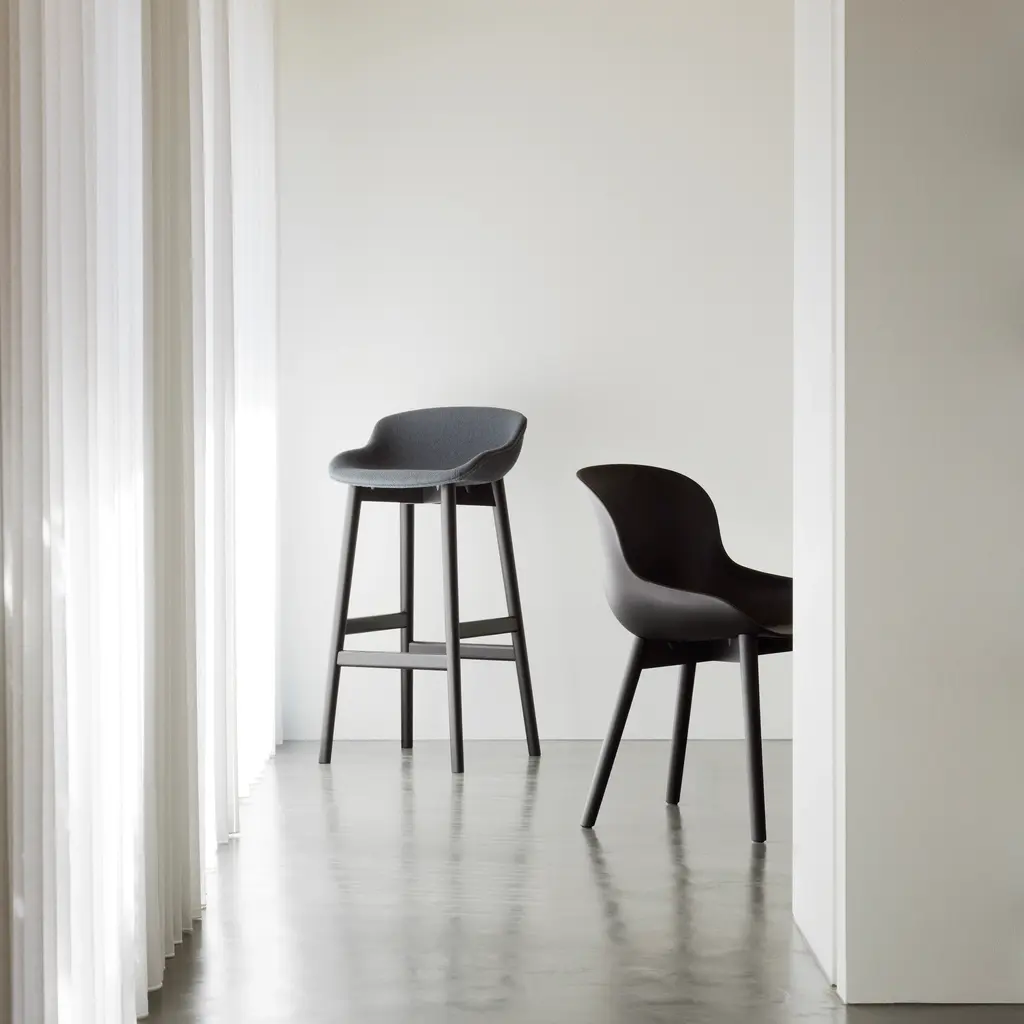 Designer Simon Legald gives a hearty nod to hygge, the Danish ideal of contentment, that extends to his fully upholstered counter stool. Adding an extra layer of comfort and a completely custom look, Hyg’s molded shell is sheathed in a choice of select fabric and leather options. Complementing the seat's sculptural contours, the solid-oak base incorporates a built-in footrest and comes in either natural or black-painted versions, both glossed with lacquer.