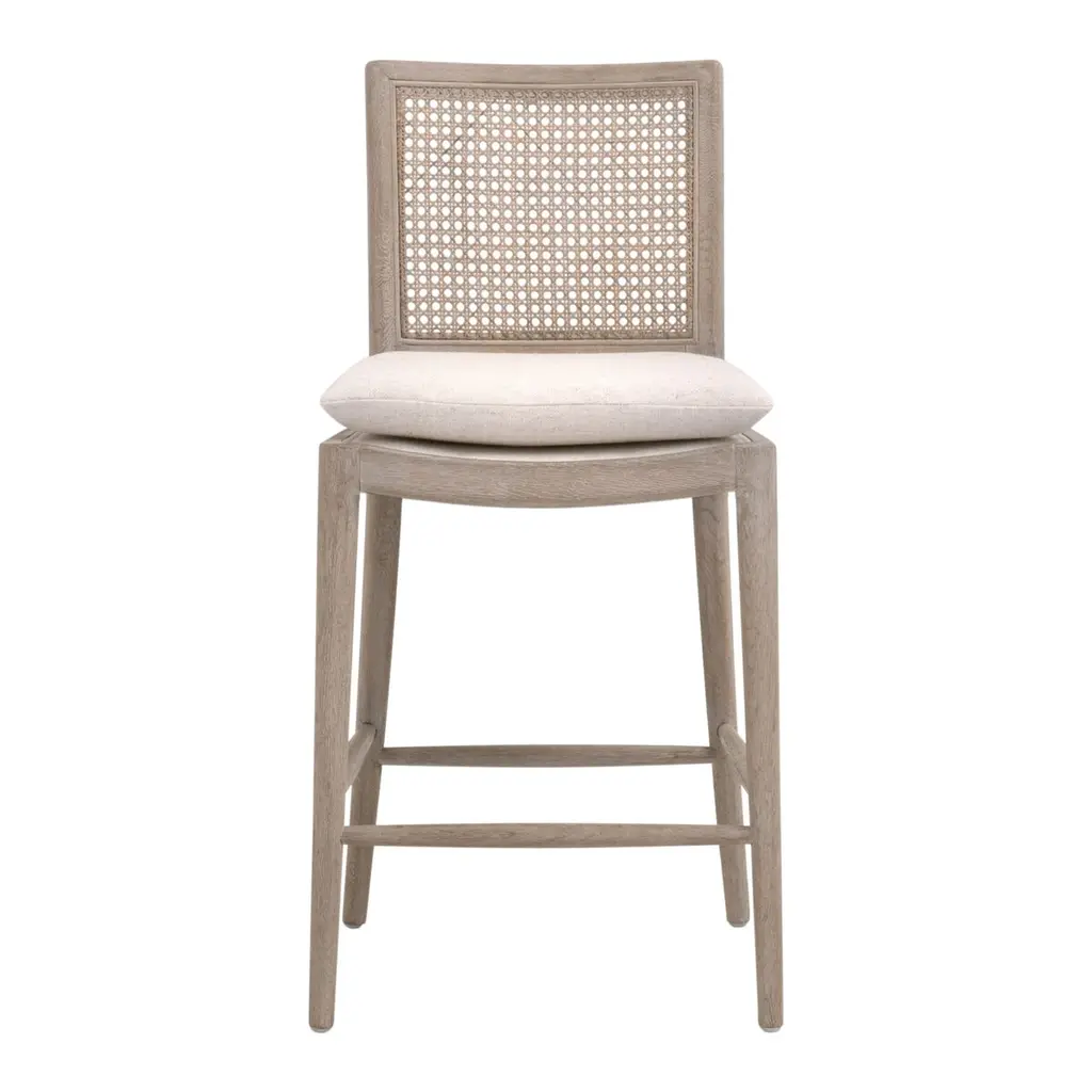 The indira Counter Stool seamlessly combines traditional design with contemporary elements, making it an ideal piece for a transitional space. It measures 18.75" wide, 21.75" deep, and 39.25" high, with a seat height of 26". Crafted with a solid oak wood frame and cane back, it provides an airy, stylish aesthetic. The seat cushion is removable with ties and upholstered in a performance textured linen. This material is made from a durable polyester-linen blend that is stain-resistant and designed to withstand everyday use. With a contoured seat and leg stretchers for added support, this transitional stool delivers both comfort and durability, making it a refined addition to any bar or dining space.