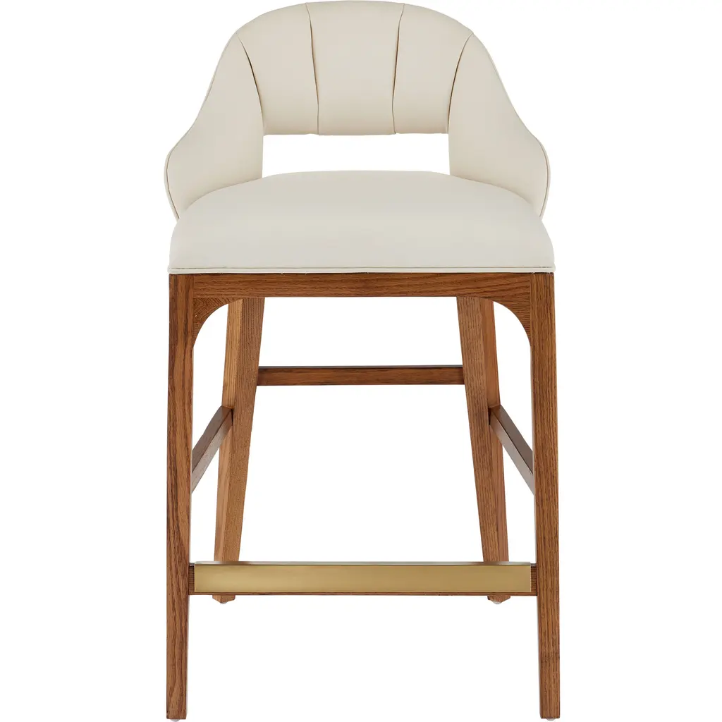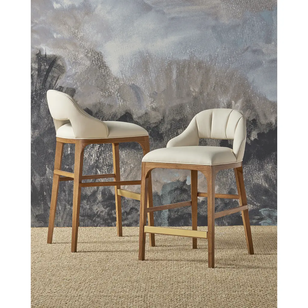The Inga Counter Stool, covered in Endurance Sand fabric, has an upholstered back and seat that sits nimbly atop a solid white-oak frame in a morel brown finish. The paleness of the fabric and the warmth of the wood are contrasting elements. A brass kick plate on the front rung in a brushed brass finish serves a purpose and brings a bit of brightness to the design by Aimee Kurzner.