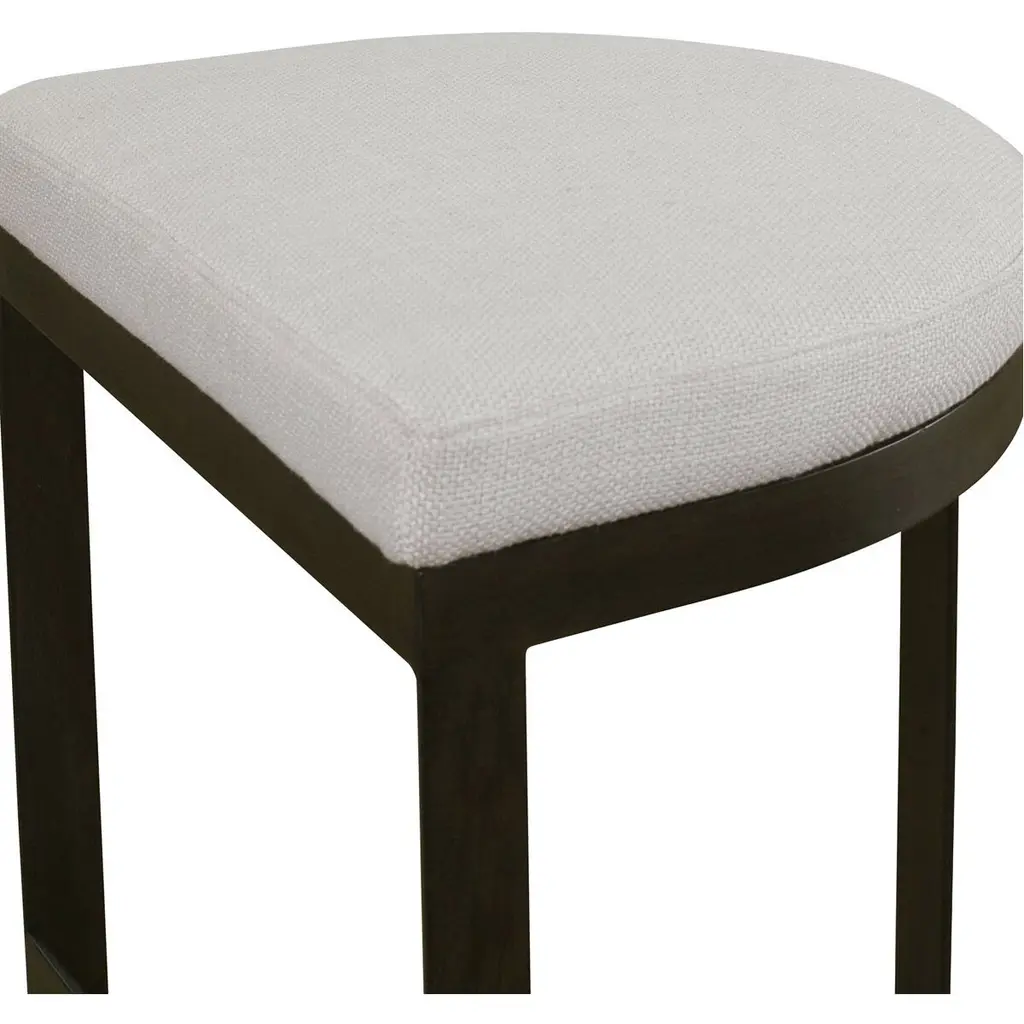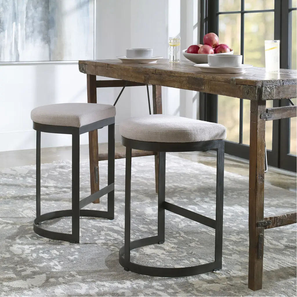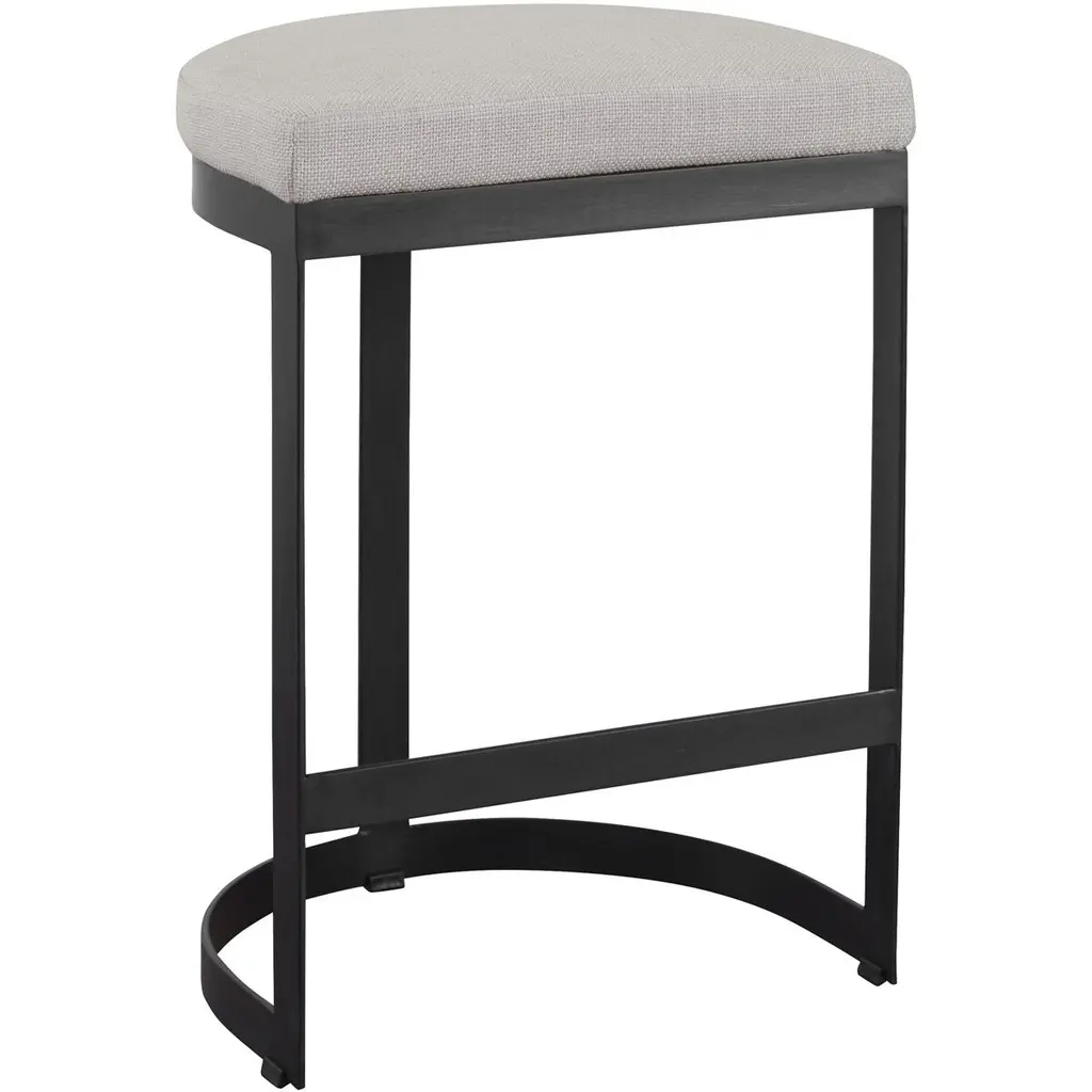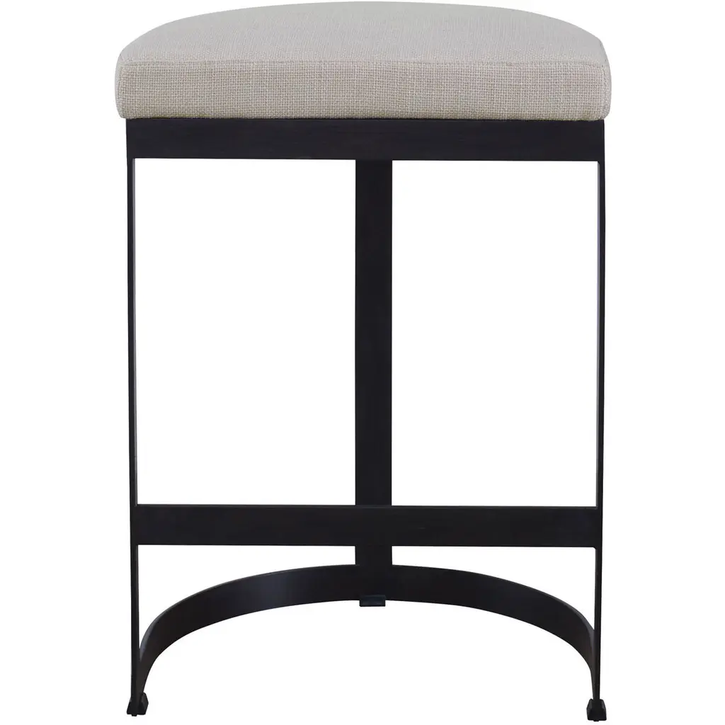 Simplistic But Sturdy, This Statement Counter Stool Features A Thick Hand Forged Iron Base Finished In Matte Black. Plush Seat Is Tailored In An Off-white Linen Blend Fabric. Seat Height Is 26".