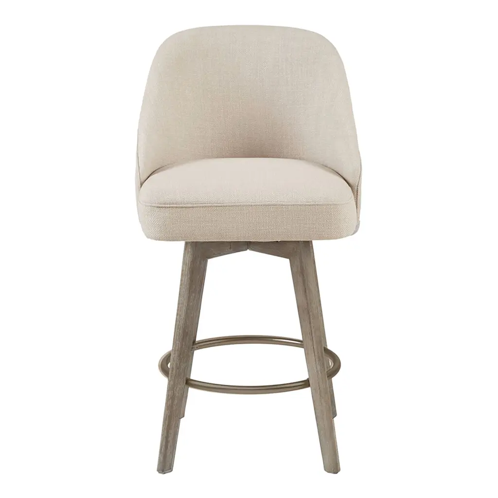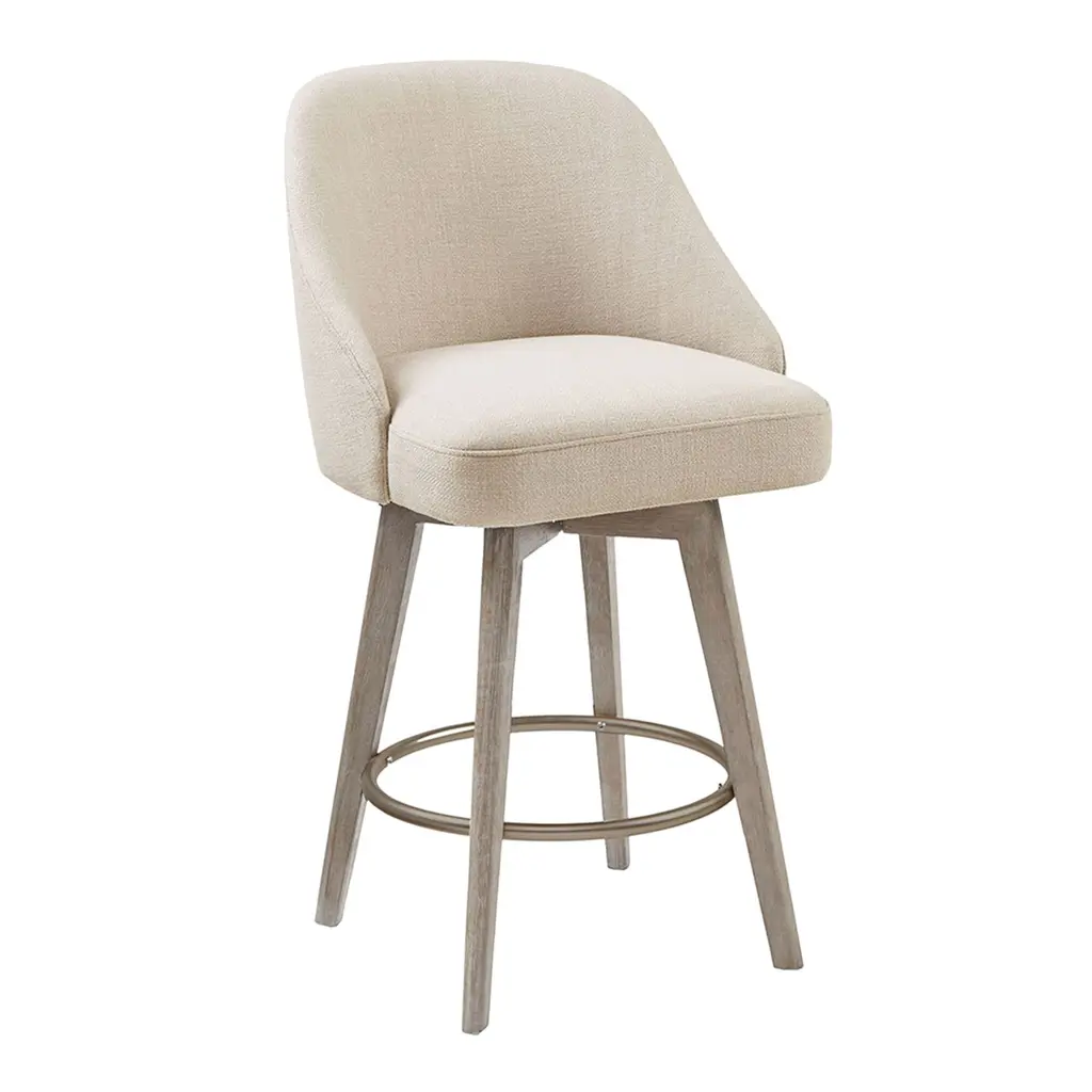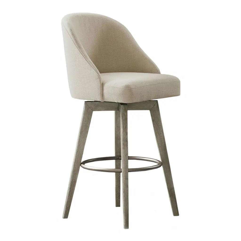 The polished Janine counter stool invites friends and family to sit back and relax with its plush upholstery available in an array of chic muted colors. Featuring a clean-lined, curved profile, splayed gray reclaimed-wood legs and a matte silver footrest, this versatile swivel seat completes your home bar, kitchen counter or pub table.