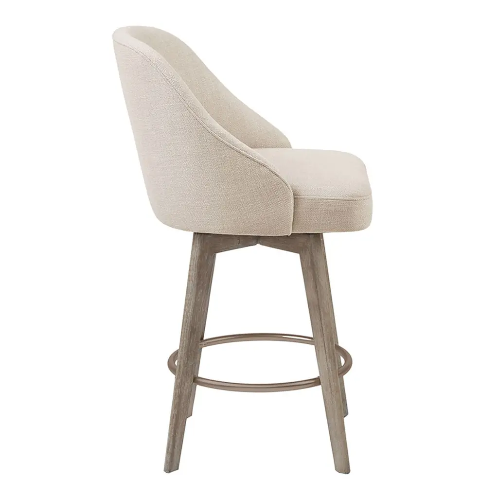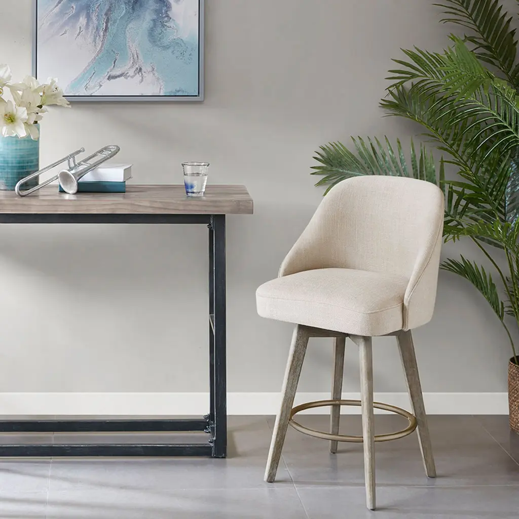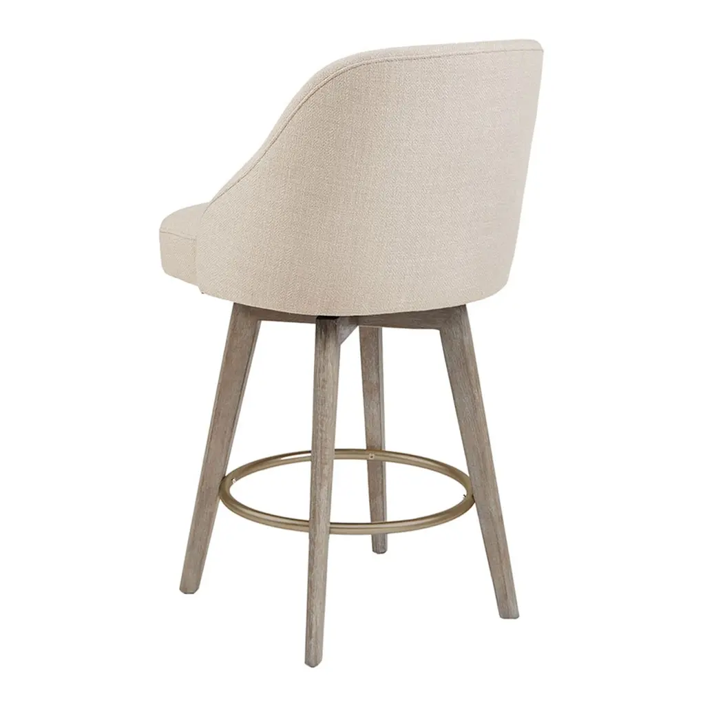The polished Janine counter stool invites friends and family to sit back and relax with its plush upholstery available in an array of chic muted colors. Featuring a clean-lined, curved profile, splayed gray reclaimed-wood legs and a matte silver footrest, this versatile swivel seat completes your home bar, kitchen counter or pub table.