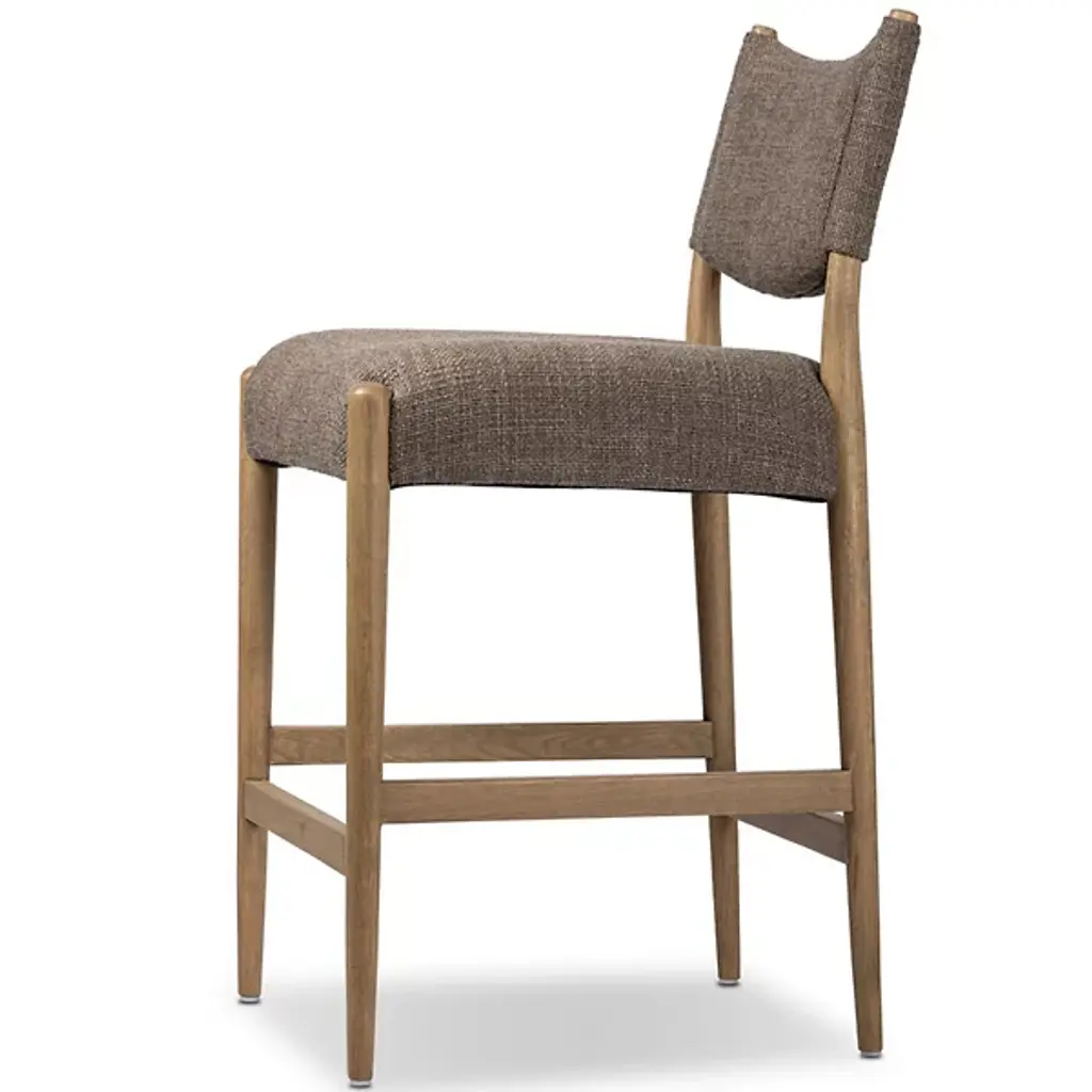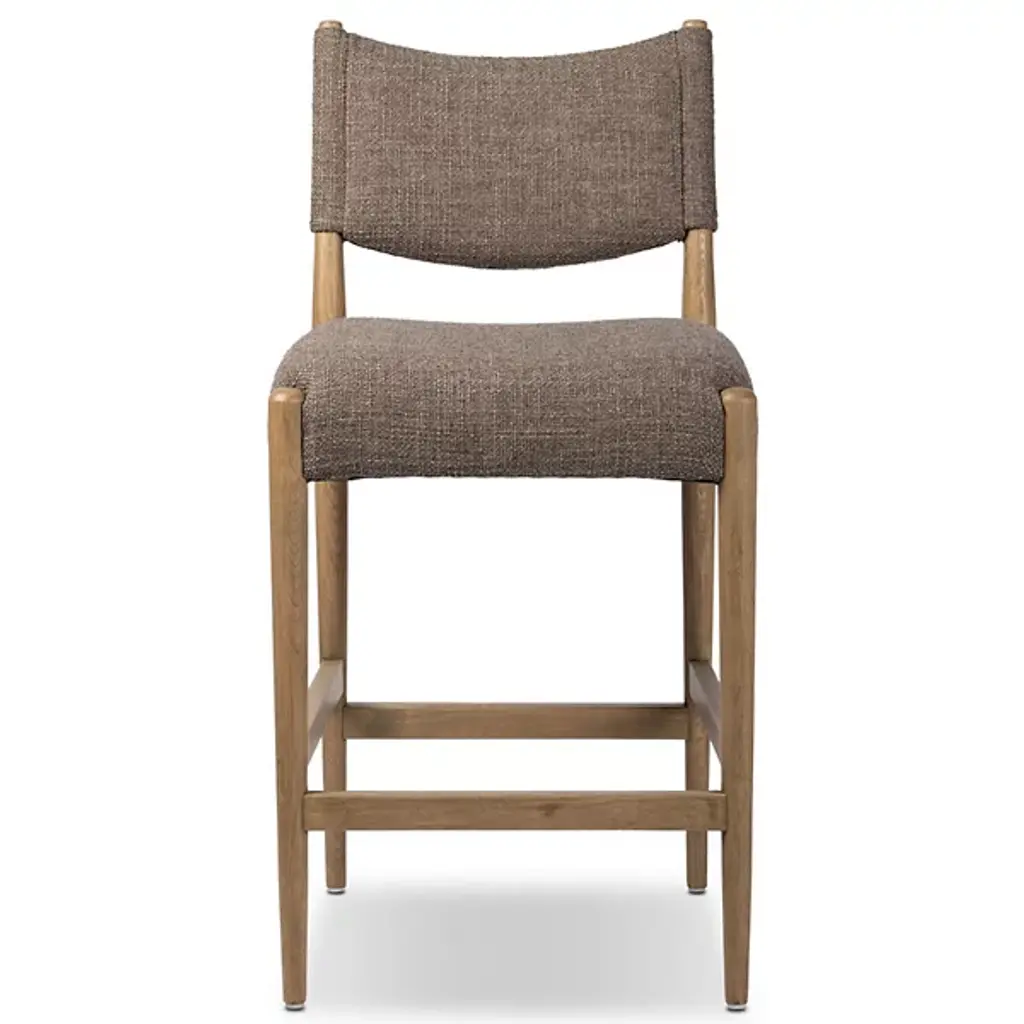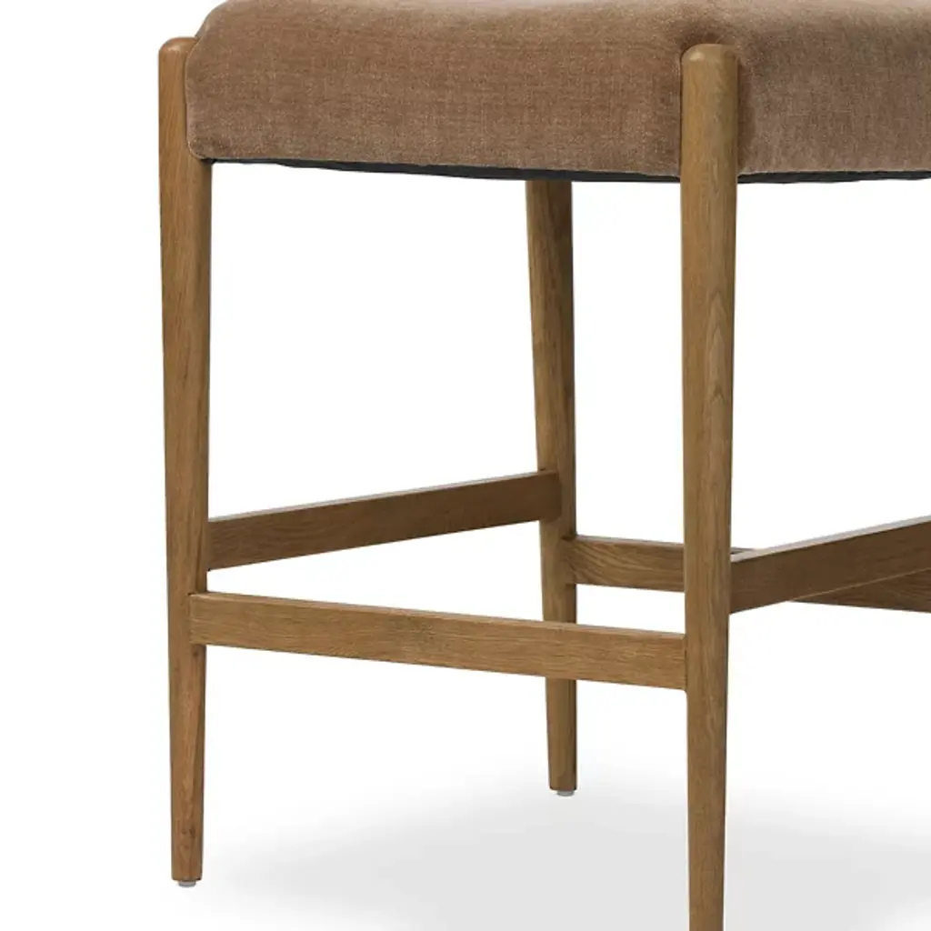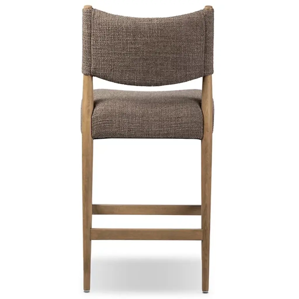 The Jayla Counter Stool from Four Hands employs a curved back that follows the natural contour of the spine while maintaining clean, minimal lines. Solid oak construction reveals natural wood grain through the frame's refined proportions that emphasize structural clarity. The stool’s polyester upholstery delivers durability while maintaining soft texture across both the seat and back. Its straightforward design language balances comfort with the clean aesthetic needed for modern kitchen islands and bar areas, while the neutral palette adapts to various interior schemes.
