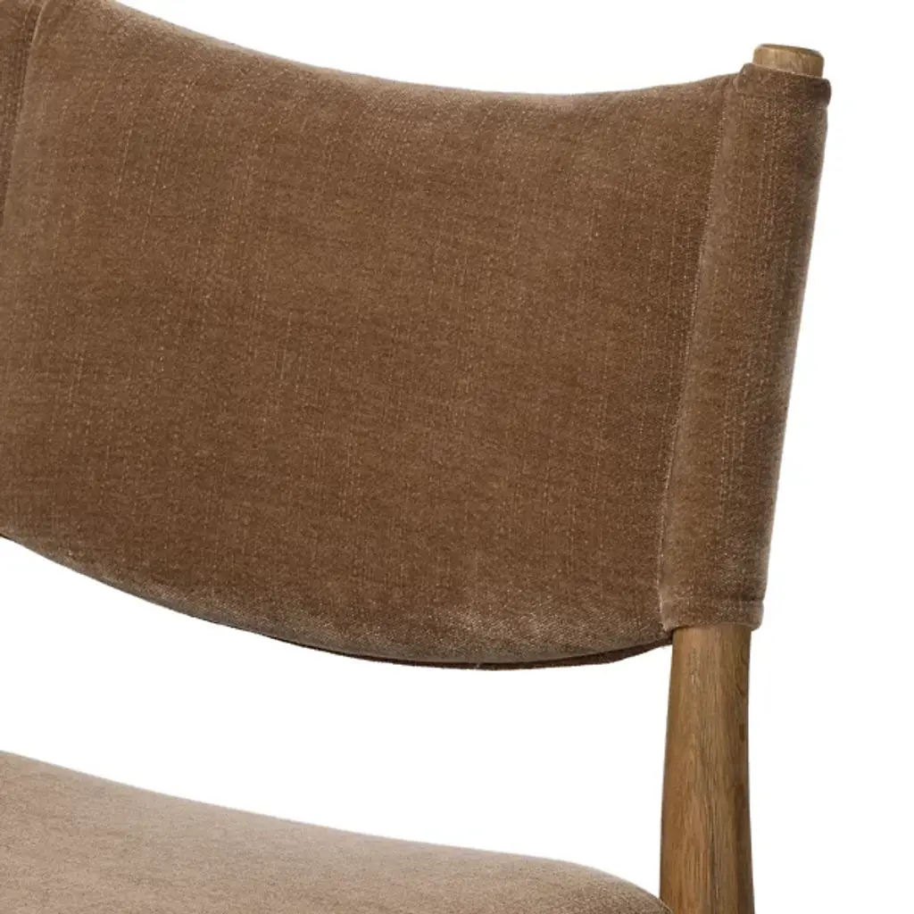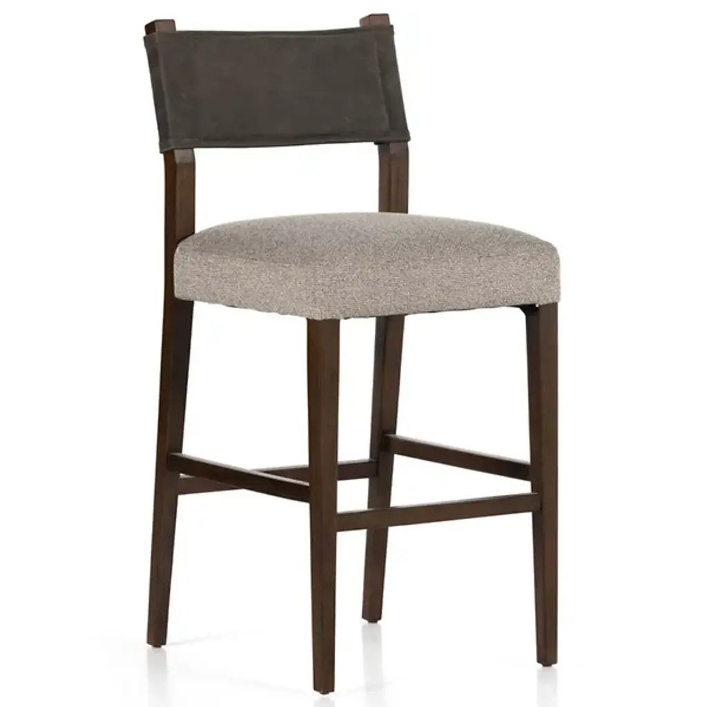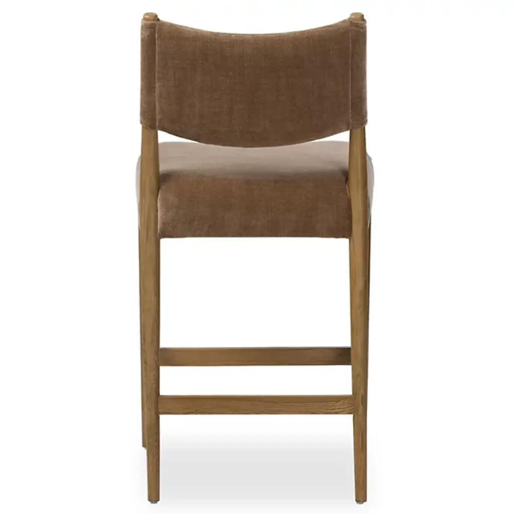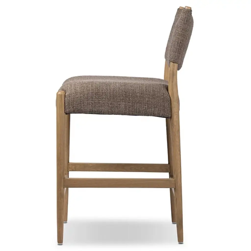 The Jayla Counter Stool from Four Hands employs a curved back that follows the natural contour of the spine while maintaining clean, minimal lines. Solid oak construction reveals natural wood grain through the frame's refined proportions that emphasize structural clarity. The stool’s polyester upholstery delivers durability while maintaining soft texture across both the seat and back. Its straightforward design language balances comfort with the clean aesthetic needed for modern kitchen islands and bar areas, while the neutral palette adapts to various interior schemes.