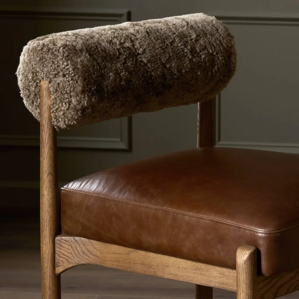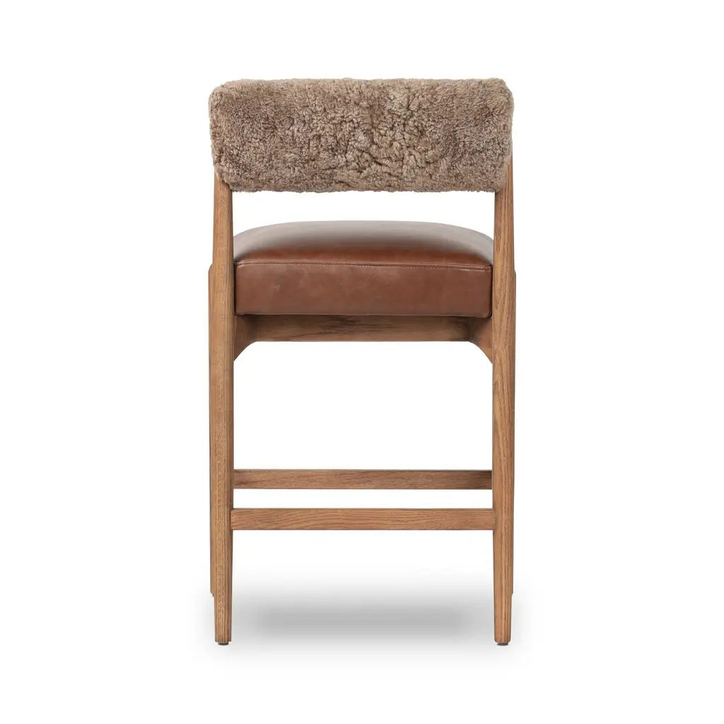 Elevate your counter seating with the Jazelle Counter Stool from Four Hands. Combining solid oak, top-grain leather, and soft shearling, this piece effortlessly blends mid-century and 70s style. Enjoy a playful update while indulging in the luxurious mix of materials. Highlights