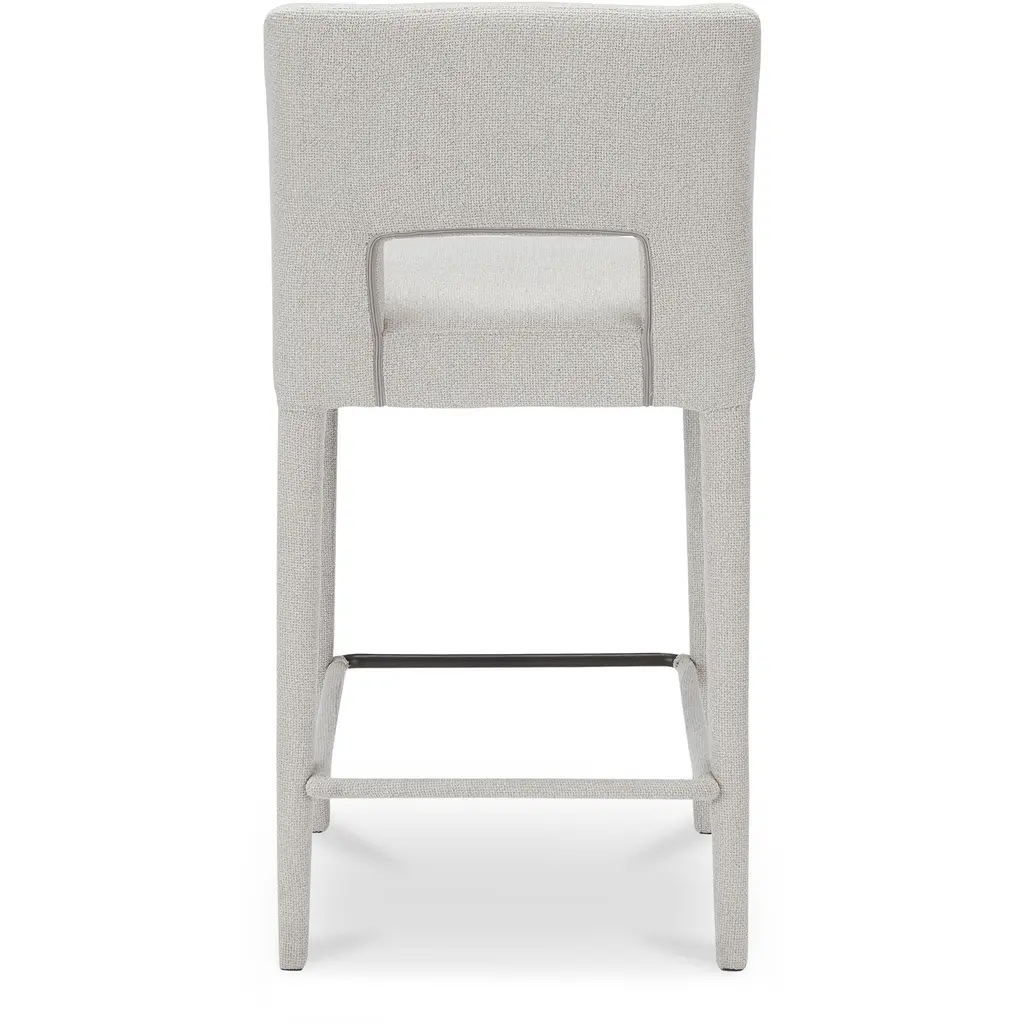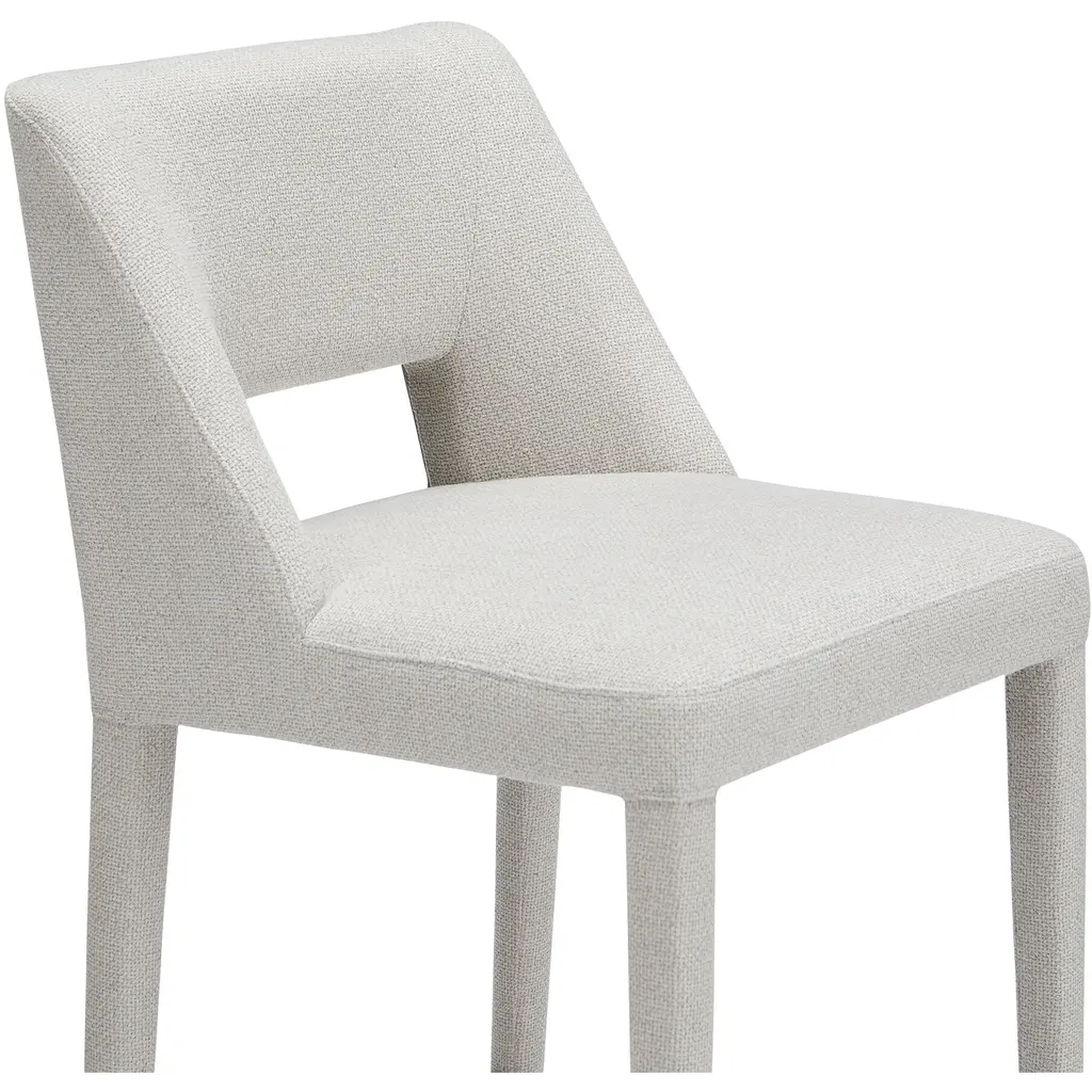 Fully upholstered in light brown performance fabric, the Joyce counter stool's cohesive silhouette exudes sophistication. The carved lower backrest adds visual lightness, while extended sides offer cradling support.