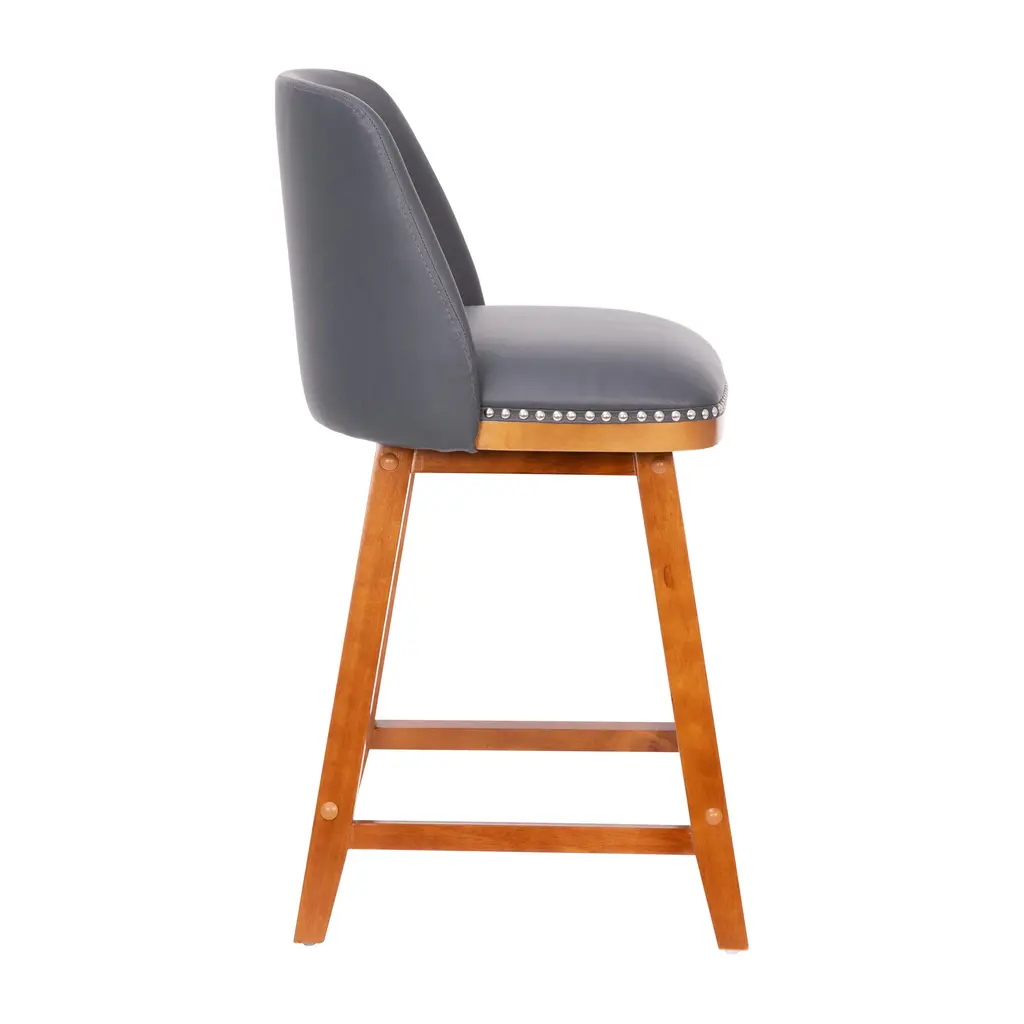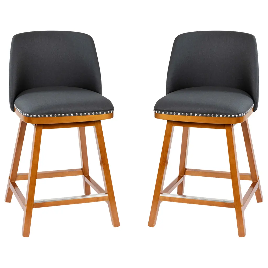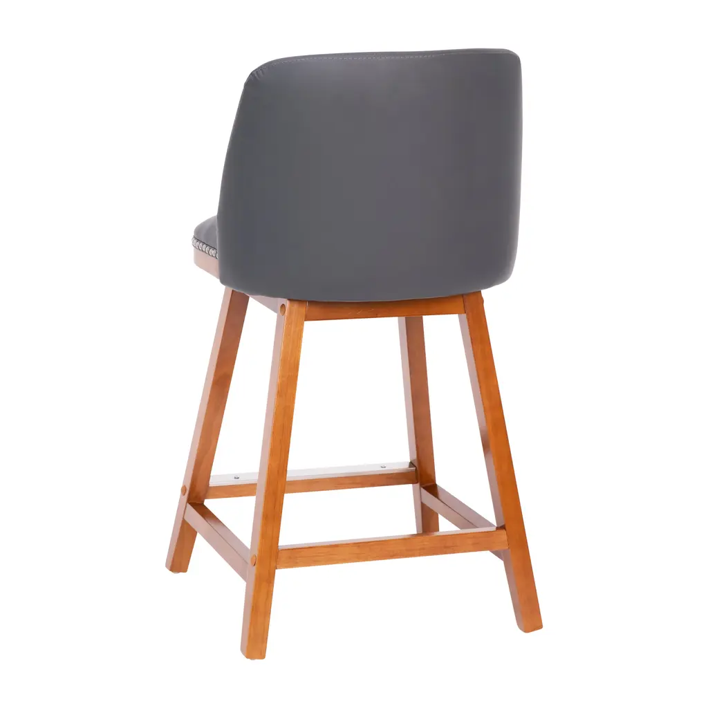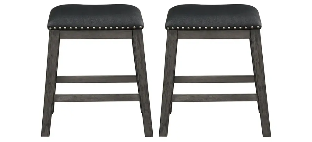 Let the sophisticated style of this set of 2 commercial grade counter stools, featuring soft and durable upholstery with decorative nail trimming, lend a touch of old world elegance and comfort to your home or business. The solid wood frame and legs are strong and sturdy and hold up to 300 lbs. static weight. The contoured mid-back design, foam padded seat, and integrated footrest invite you to sit back and get comfortable over drinks or dinner. To ensure smooth gliding and floor protection, protective felt pads have been added and this stool wipes clean with a dry cloth. Quick and easy assembly rounds out the favorable attributes this dining stool has to offer any environment.