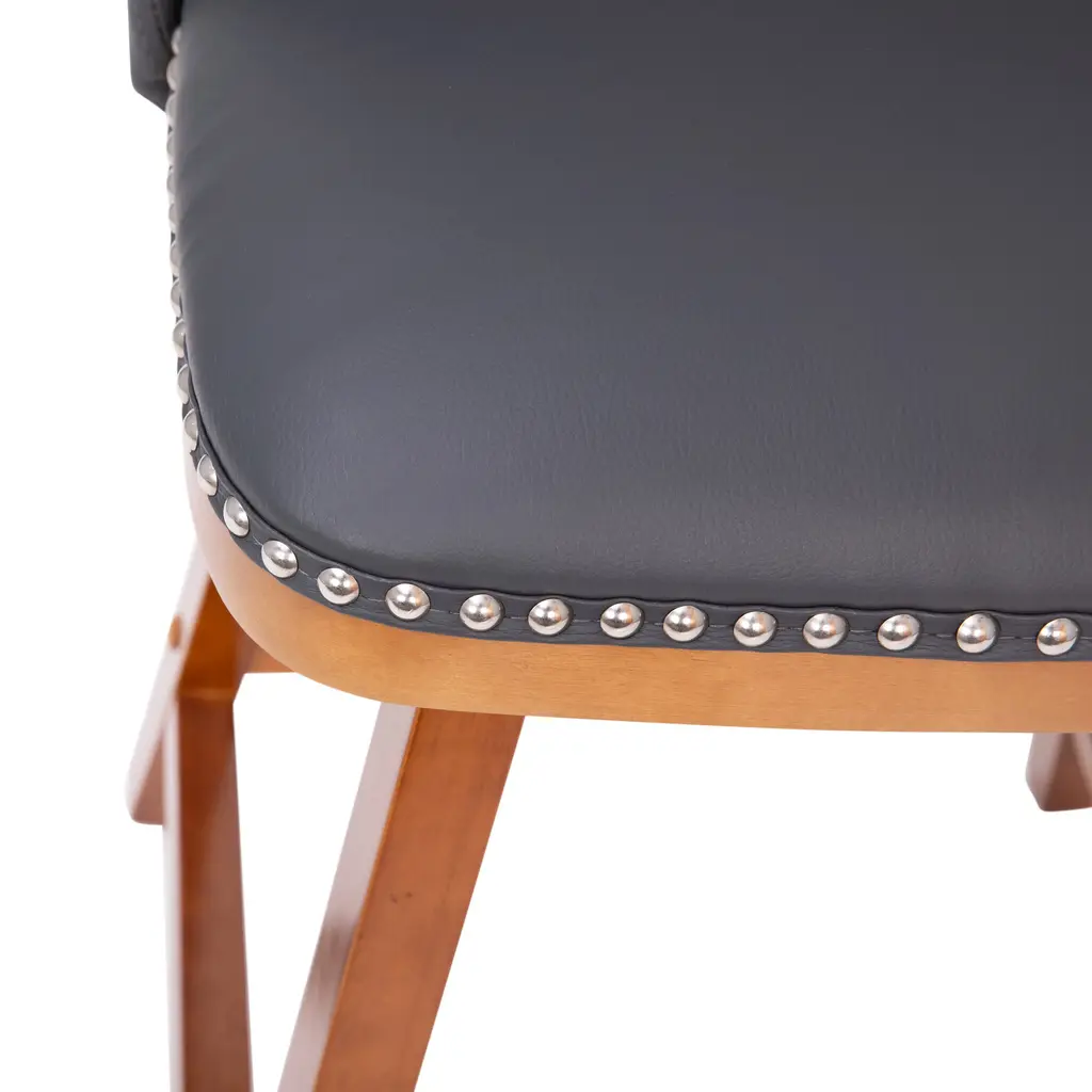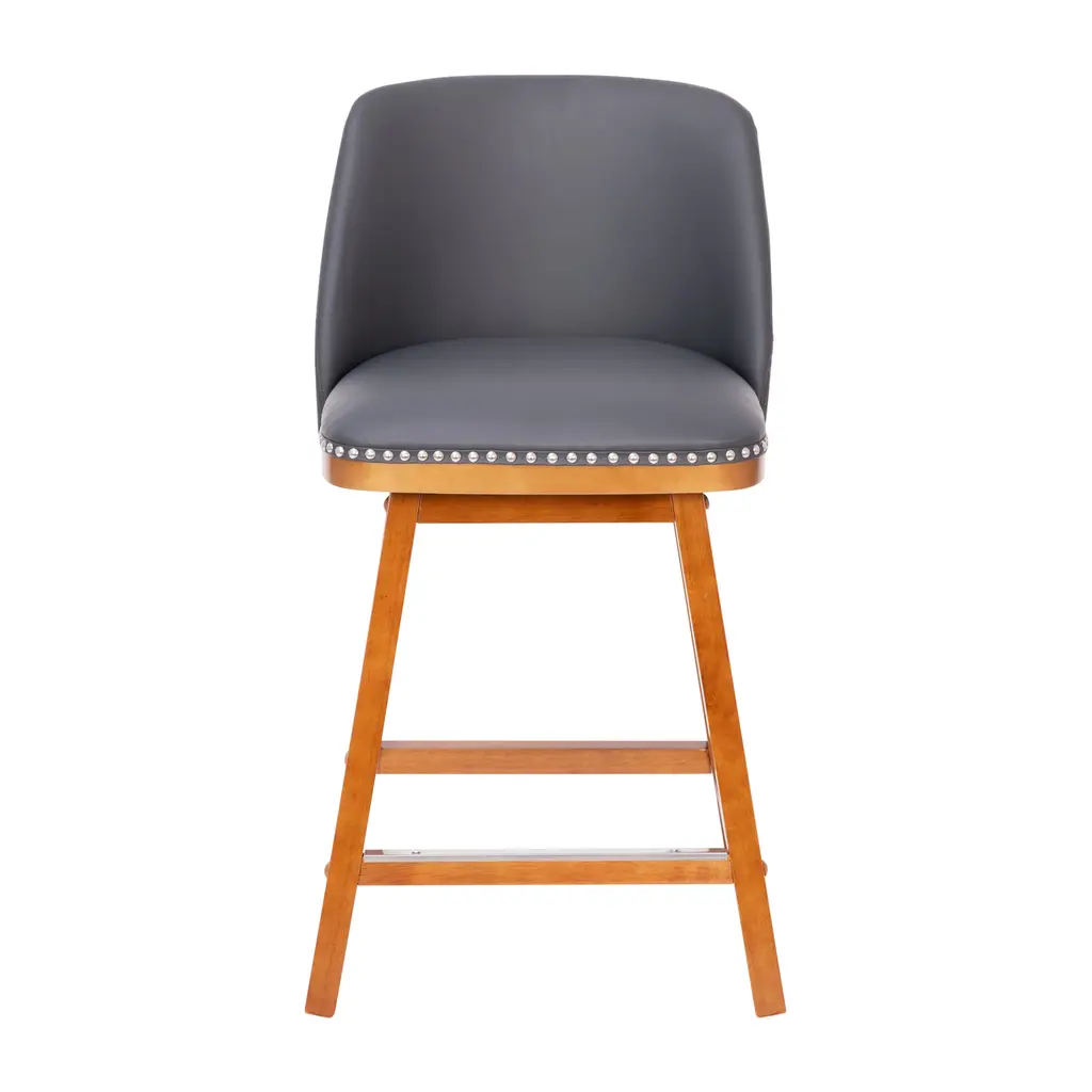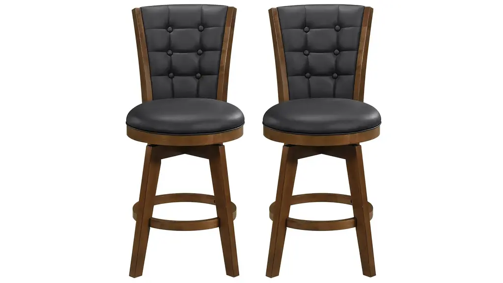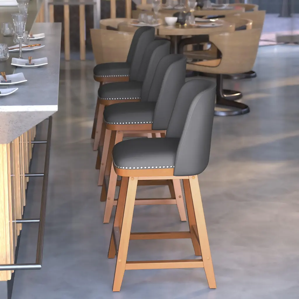 Let the sophisticated style of this set of 2 commercial grade counter stools, featuring soft and durable upholstery with decorative nail trimming, lend a touch of old world elegance and comfort to your home or business. The solid wood frame and legs are strong and sturdy and hold up to 300 lbs. static weight. The contoured mid-back design, foam padded seat, and integrated footrest invite you to sit back and get comfortable over drinks or dinner. To ensure smooth gliding and floor protection, protective felt pads have been added and this stool wipes clean with a dry cloth. Quick and easy assembly rounds out the favorable attributes this dining stool has to offer any environment.