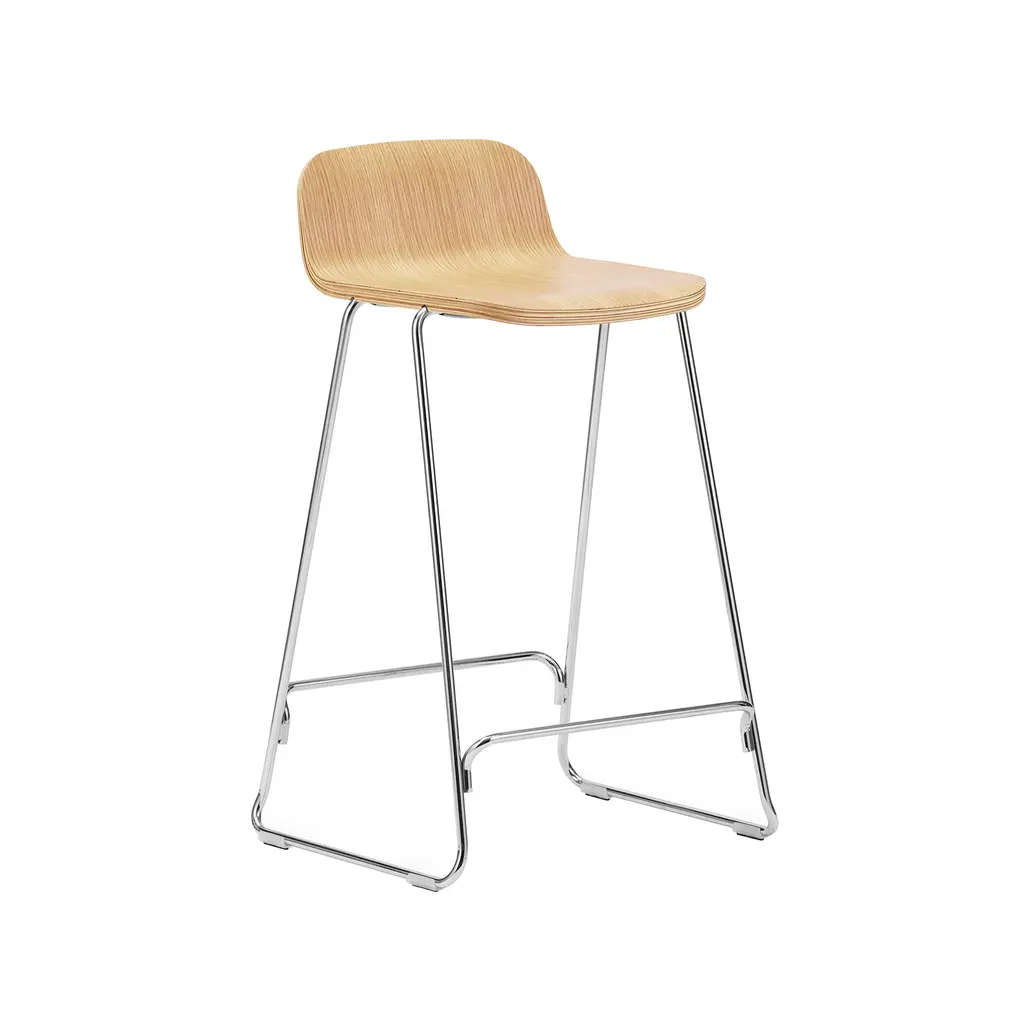 Riffing on their signature molded seating, design duo Iskos-Berlin readily extend the concept to a bar or counter stool. Just adapts the veneer shell with a lower back and seamlessly joins it to the metal base with its comfortable footrest. Available in natural oak with a chrome base or in black-stained ash with black metal, the stool reflects the same unfussy ethos as the rest of the seating series.