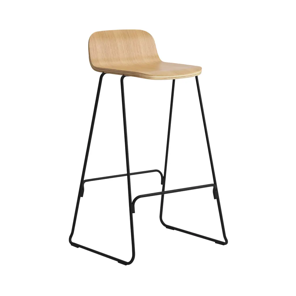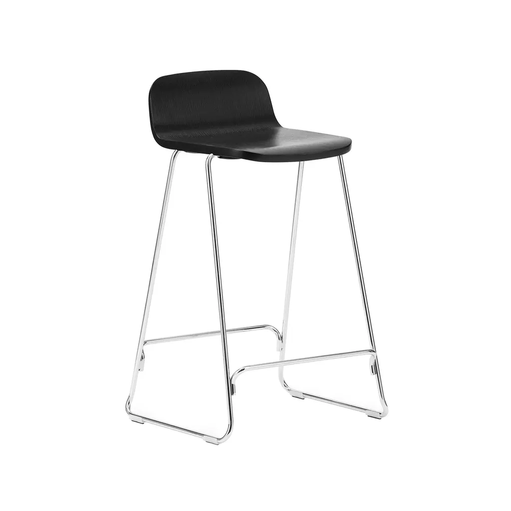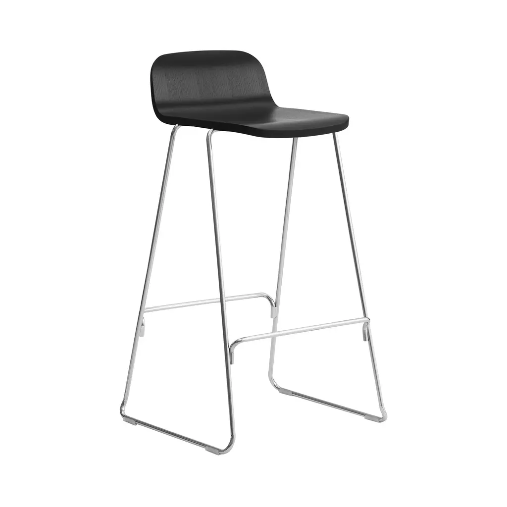 Riffing on their signature molded seating, design duo Iskos-Berlin readily extend the concept to a bar or counter stool. Just adapts the veneer shell with a lower back and seamlessly joins it to the metal base with its comfortable footrest. Available in natural oak with a chrome base or in black-stained ash with black metal, the stool reflects the same unfussy ethos as the rest of the seating series.