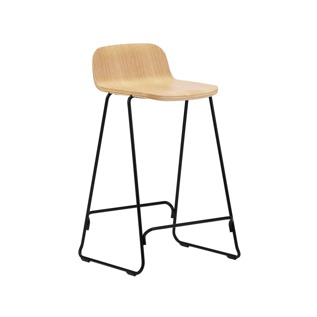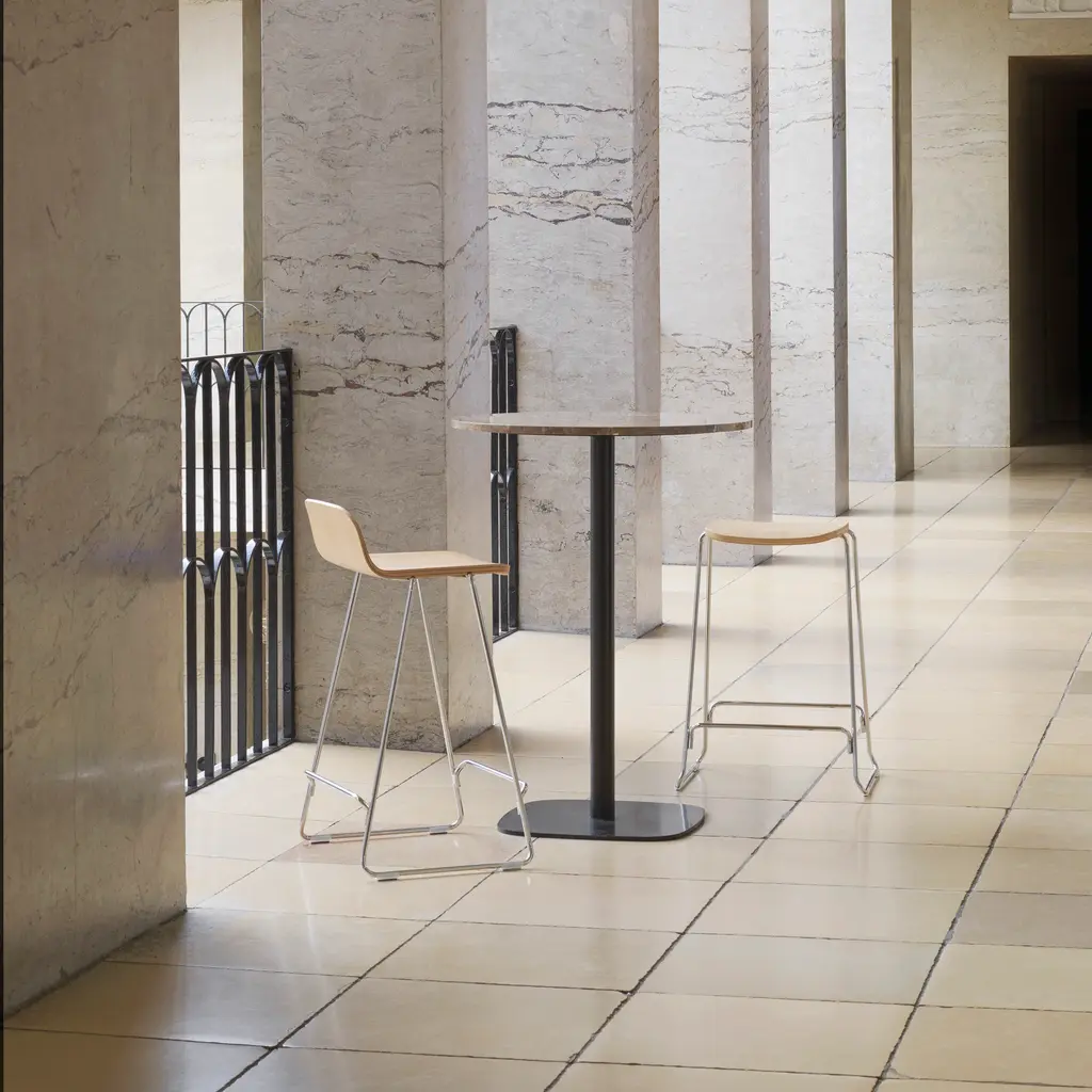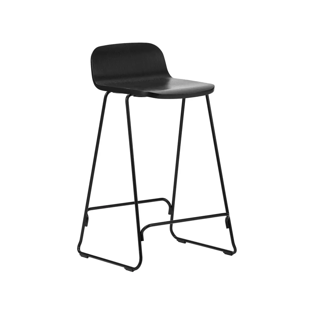Riffing on their signature molded seating, design duo Iskos-Berlin readily extend the concept to a bar or counter stool. Just adapts the veneer shell with a lower back and seamlessly joins it to the metal base with its comfortable footrest. Available in natural oak with a chrome base or in black-stained ash with black metal, the stool reflects the same unfussy ethos as the rest of the seating series.