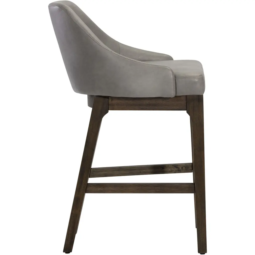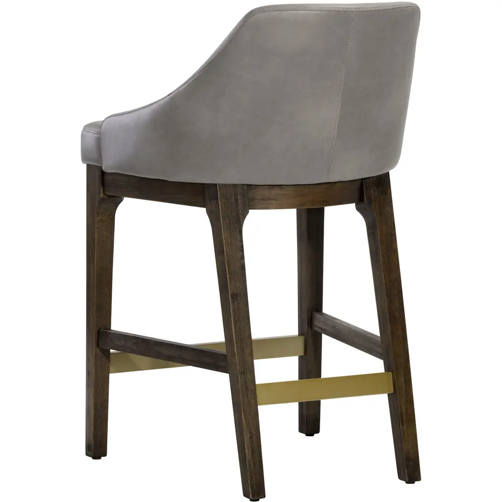 A mid-century style counter stool designed with organic elements. Crafted with solid rubberwood legs with a dark brown finish and brass finished stainless steel stretchers for added support. Available in bravo metal faux leather. Handle With Care: This design has been crafted with faux leather. Faux leather is manufactured to reflect the natural characteristics of leather as such, colour variations, markings, wrinkles, grooves, and light scratches are appreciated characteristics. No two pieces will be alike. Visit our Product Care page for more information on how to ensure the lasting beauty of this piece.
