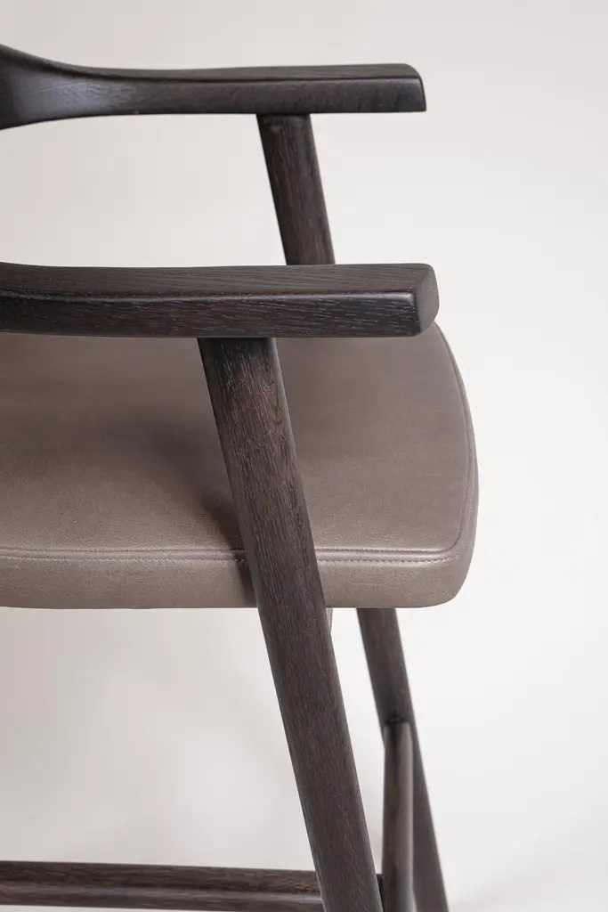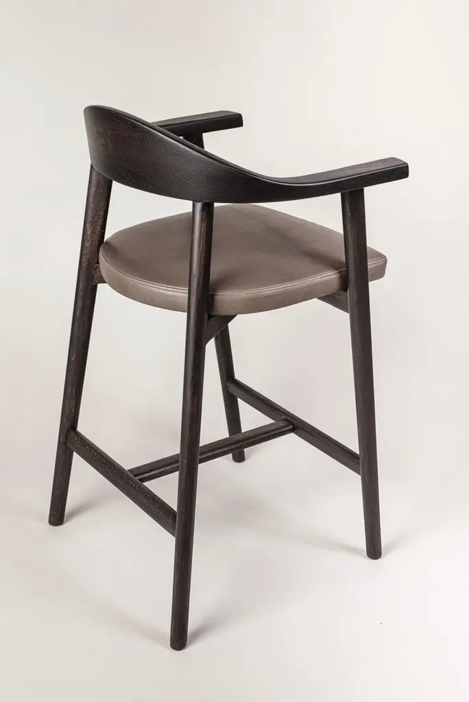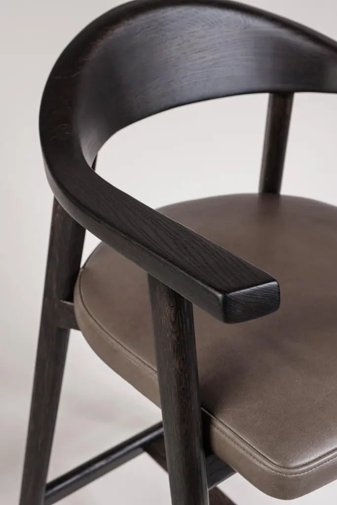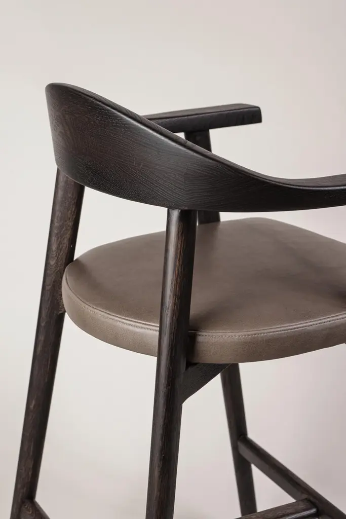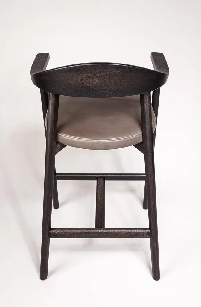 Karve counter stool shown in a dark Wenge Stained White Oak & natural grain, smooth finish leather upholstery. A classic design, elegant yet sturdy in form, handcrafted to last generations. Bespoke options always available. Wood species include white oak, blackened or invisible ash, black walnut and more. Sizing can be modified to suit (seat height, depth, arm height, etc. ) Custom upholstery to suit including COM. Karve stool can be built as a counter or bar-height stool as well as a dining chair. Please contact us for additional photos or samples.