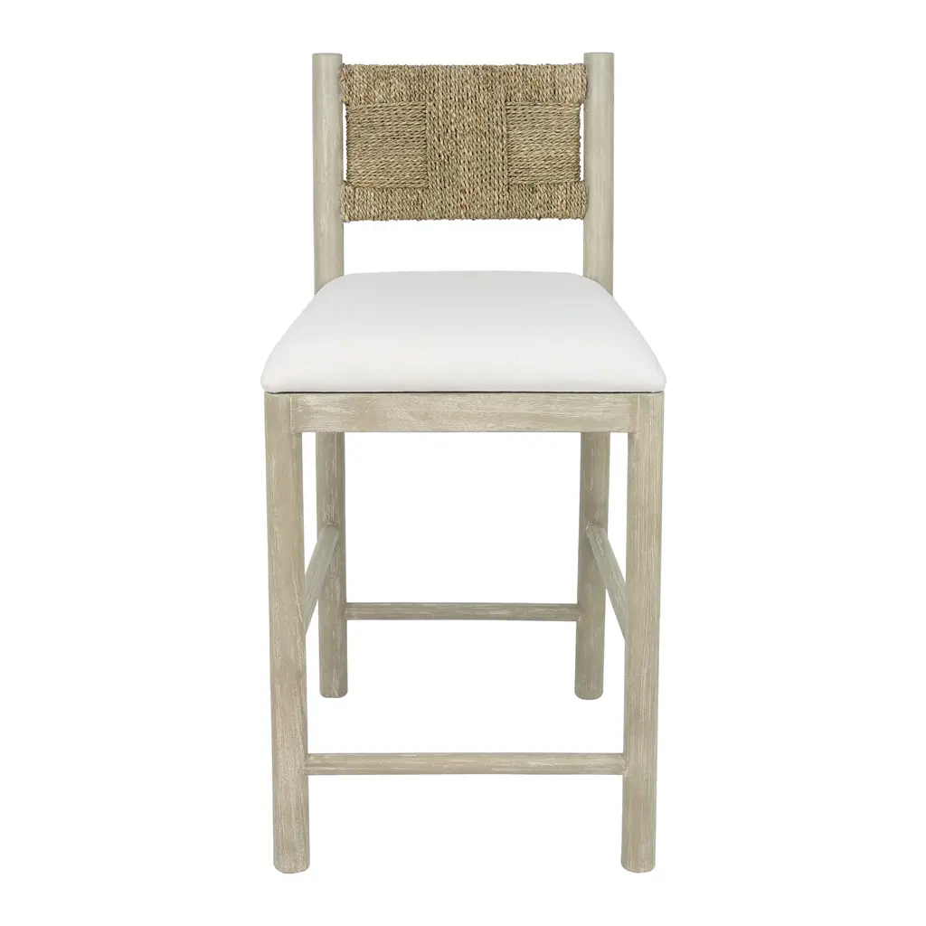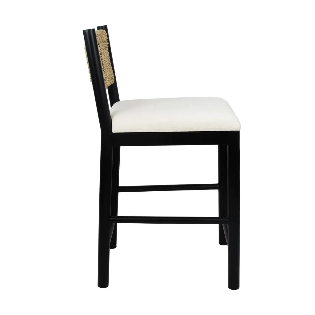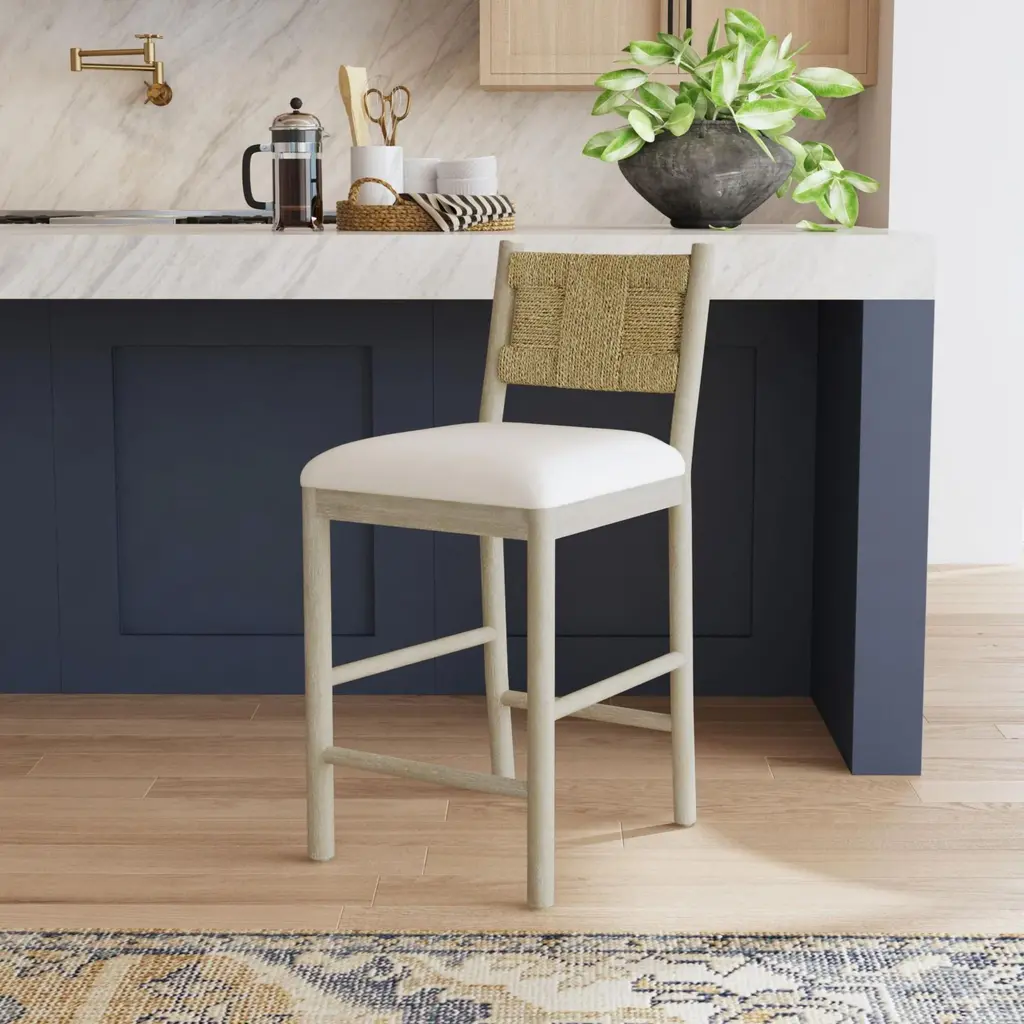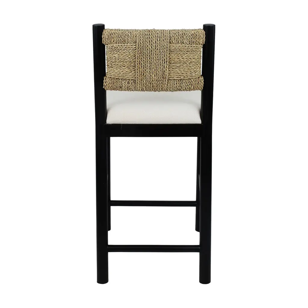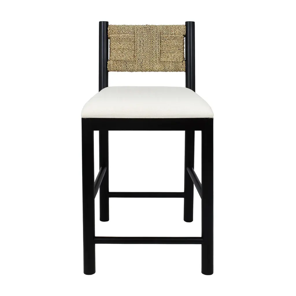 Elevate your kitchen or bar space with the organic charm of the Kauai Woven Seagrass Counter Stool. Sustainably sourced and handwoven, the seagrass details wrap the front and back of the stool’s backrest, offering a textured, artisanal touch that enhances coastal and transitional interiors alike. The stool's sturdy, kiln-dried mahogany wood frame features elegantly rounded legs, adding a refined design element that balances style and stability. Available in a natural wood or a striking black wood finish, it complements a variety of decor styles. A white fabric cushion ensures comfortable seating for relaxed meals or gatherings. Complete your space with other pieces from the Kauai collection.