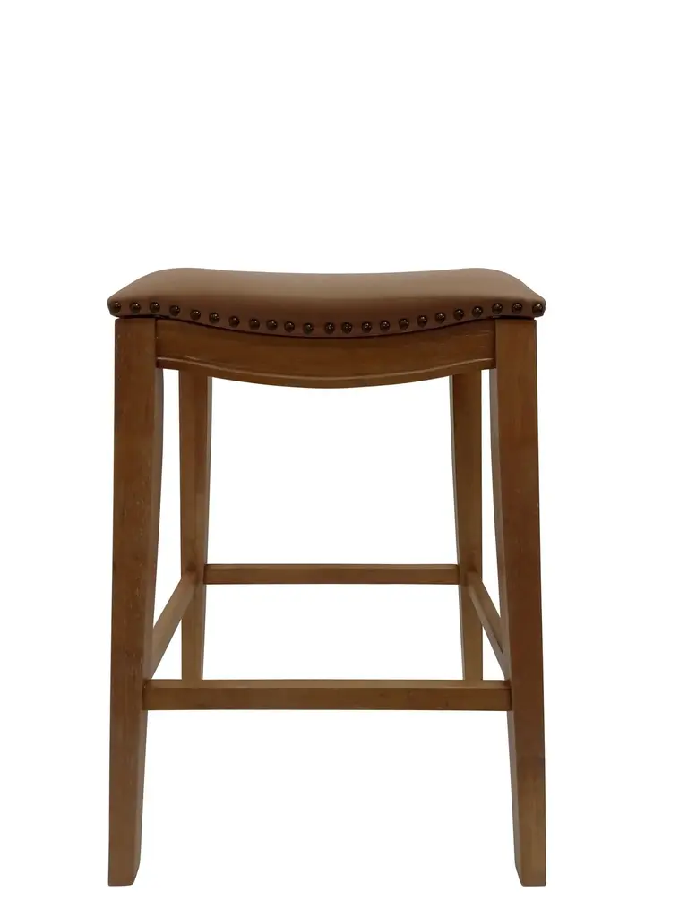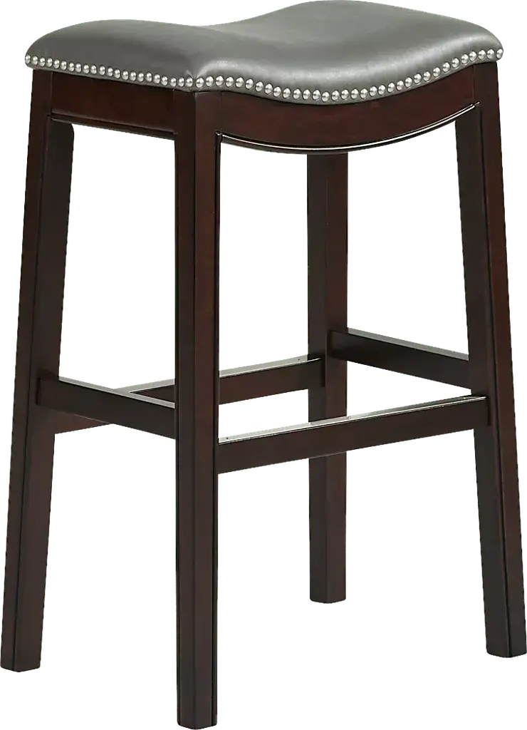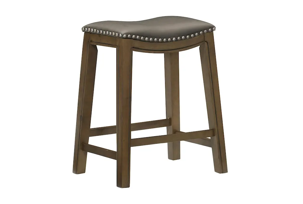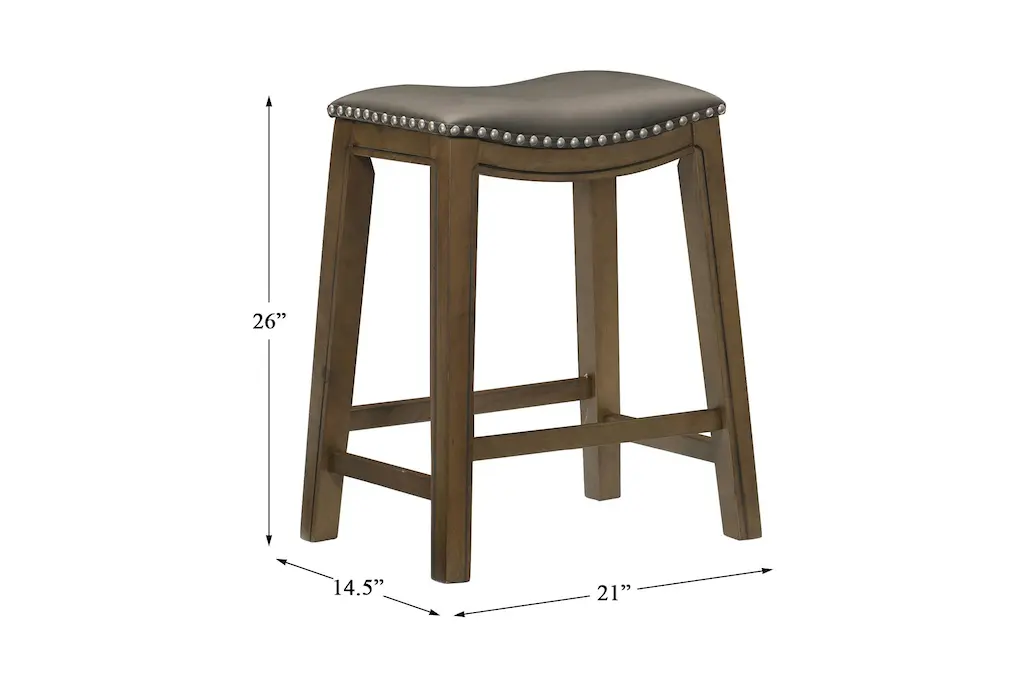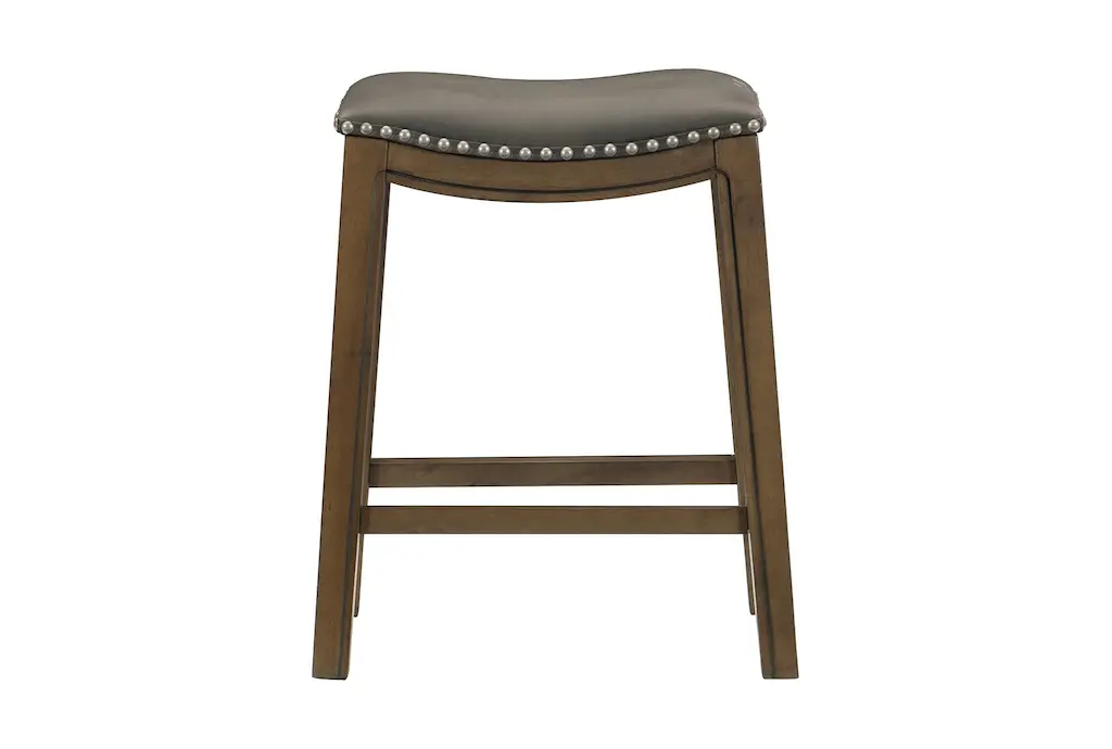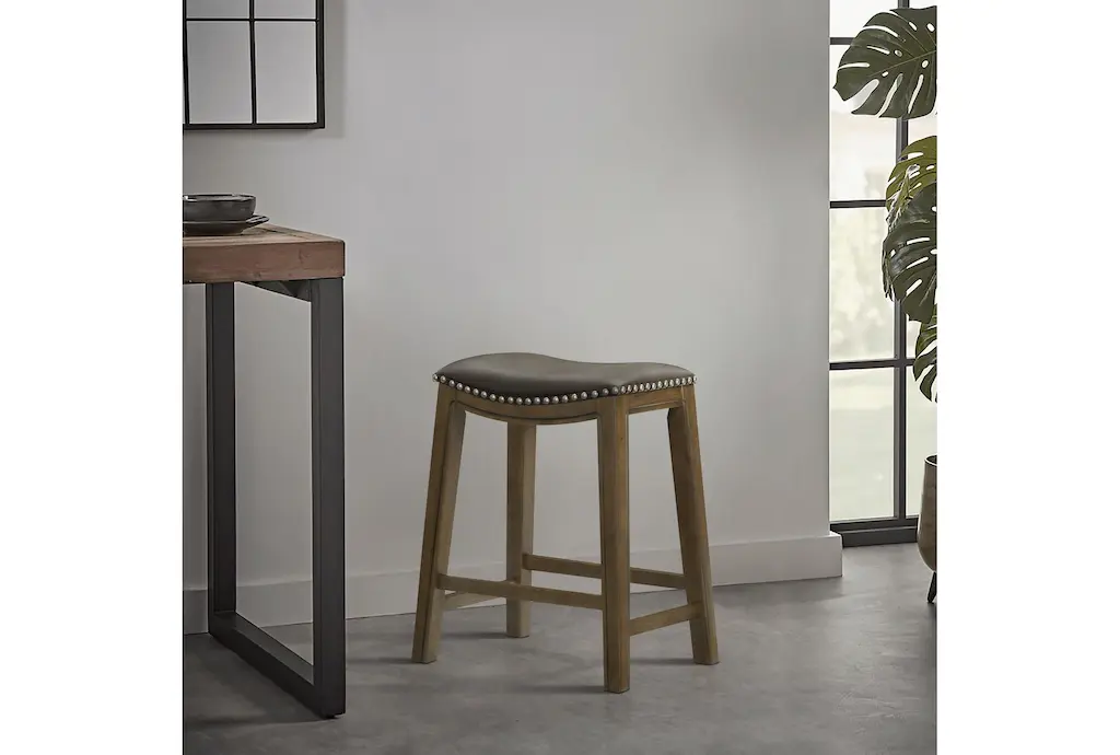 The Kinsale Grey Kitchen Stool is perfect for entertaining with a design that can easily tuck underneath an island, kitchen or bar. Featuring a saddle seat with faux leather upholstery and nailhead trim, it brings handsome rustic style to your space.