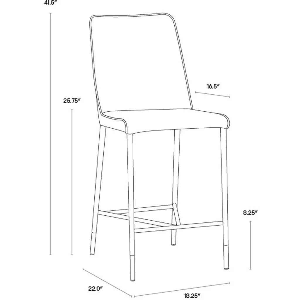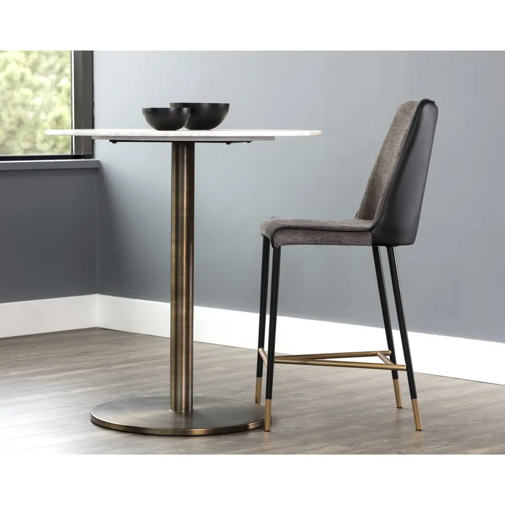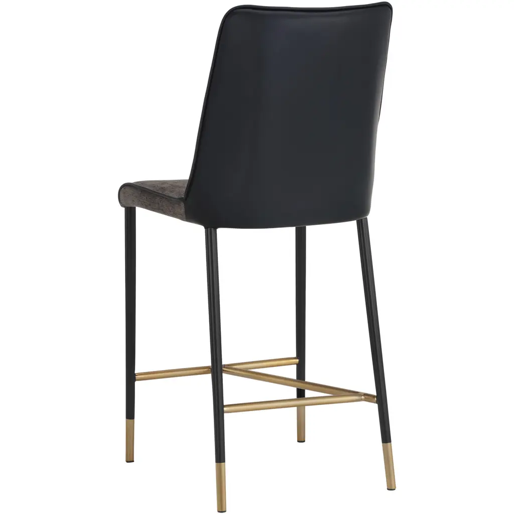 A compact counter stool designed with a chic, modern style. Stocked in our sparrow grey fabric and contrasting napa black faux leather. Finished with black steel legs and copper foot caps. Perfect for smaller dining, kitchen and lounge spaces. Handle With Care: This design has been crafted with faux leather. Faux leather is manufactured to reflect the natural characteristics of leather as such, colour variations, markings, wrinkles, grooves, and light scratches are appreciated characteristics. No two pieces will be alike. Visit our Product Care page for more information on how to ensure the lasting beauty of this piece.