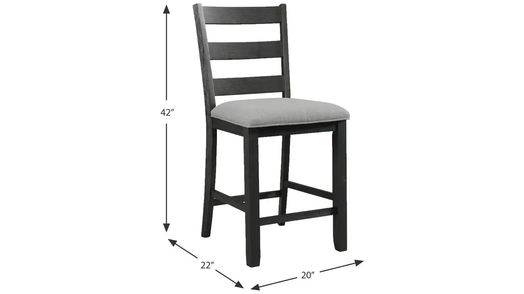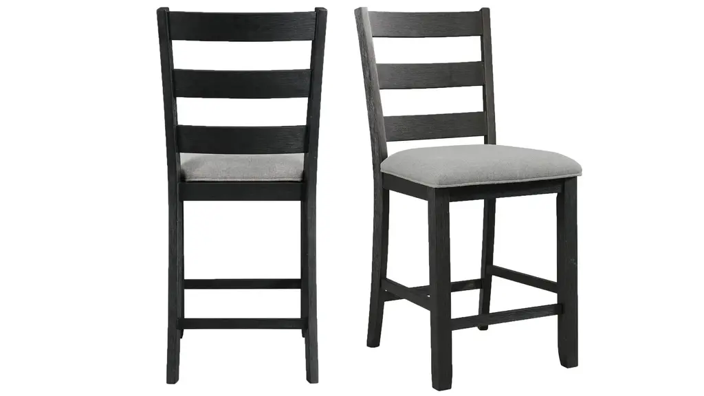 The Kona Counter Stool - Set of 2 are the perfect chairs for dining or entertaining. The chairs feature a ladder back design and an upholstered seat in a grey fabric. The wire brush, black finish on the chairs is truly unique, adding instant flair to this set. Filled with high density foam for comfortable dining. The grey upholstery contrasts well with the black base and will give the updated look your dining room has been craving!