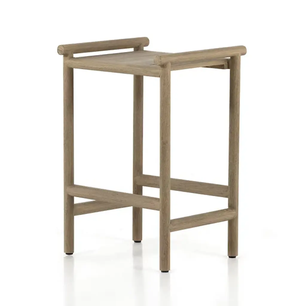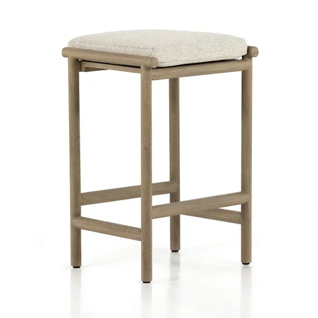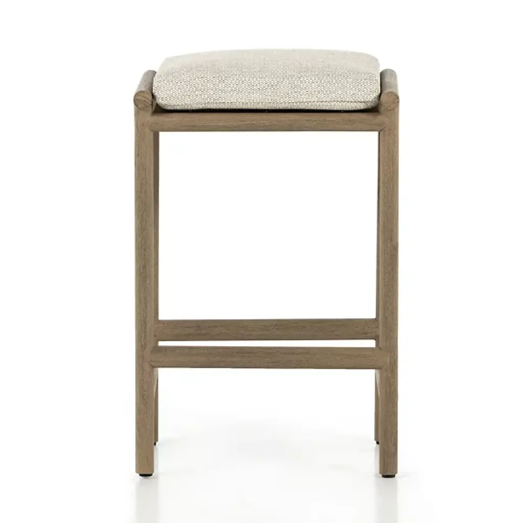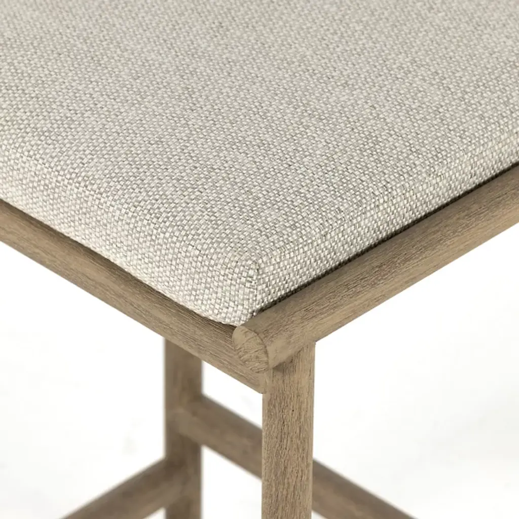Introduce a touch of refined elegance to your kitchen island or counter with the Kyla Outdoor Counter Stool from Four Hands. Made with meticulous attention to detail, this stool features a frame made of solid FSC-certified teak, ensuring both durability and sustainability. Upholstered in 100% olefin fabric and filled with a combination of polyurethane foam pad and polyester fiber batting, it offers a comfortable seating experience while maintaining its transitional style. It is made in compliance with FSC certification standards.