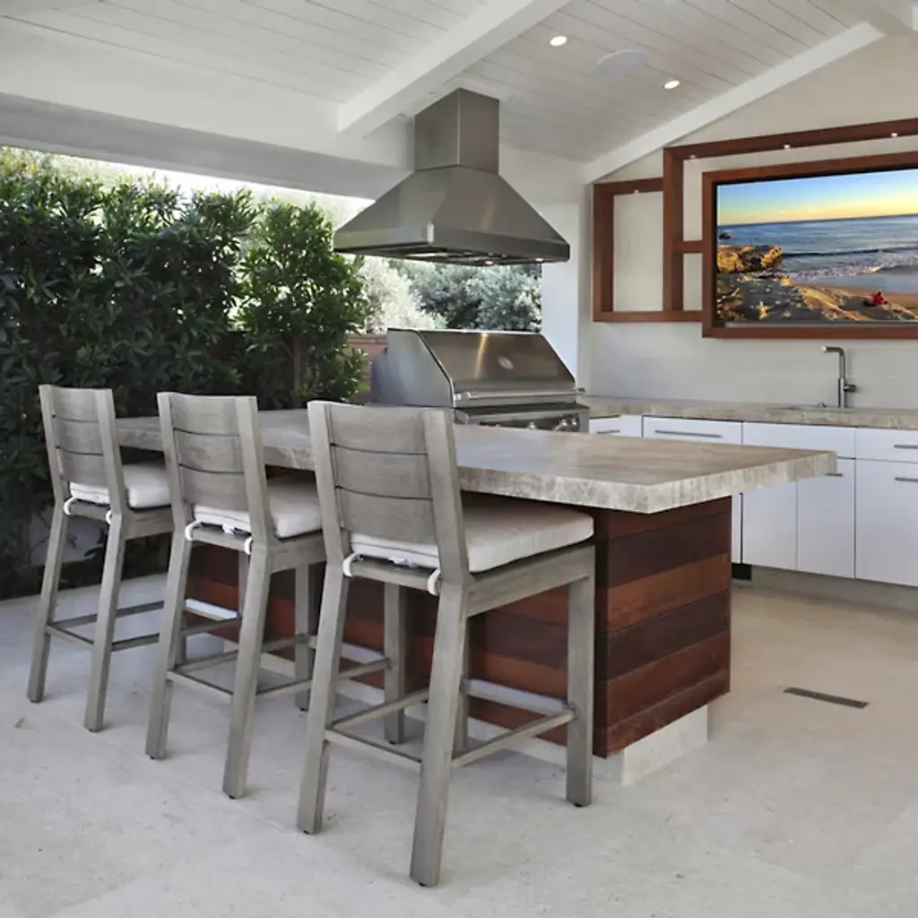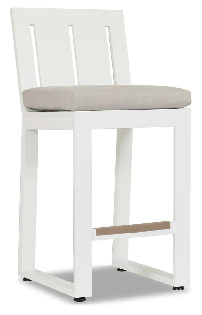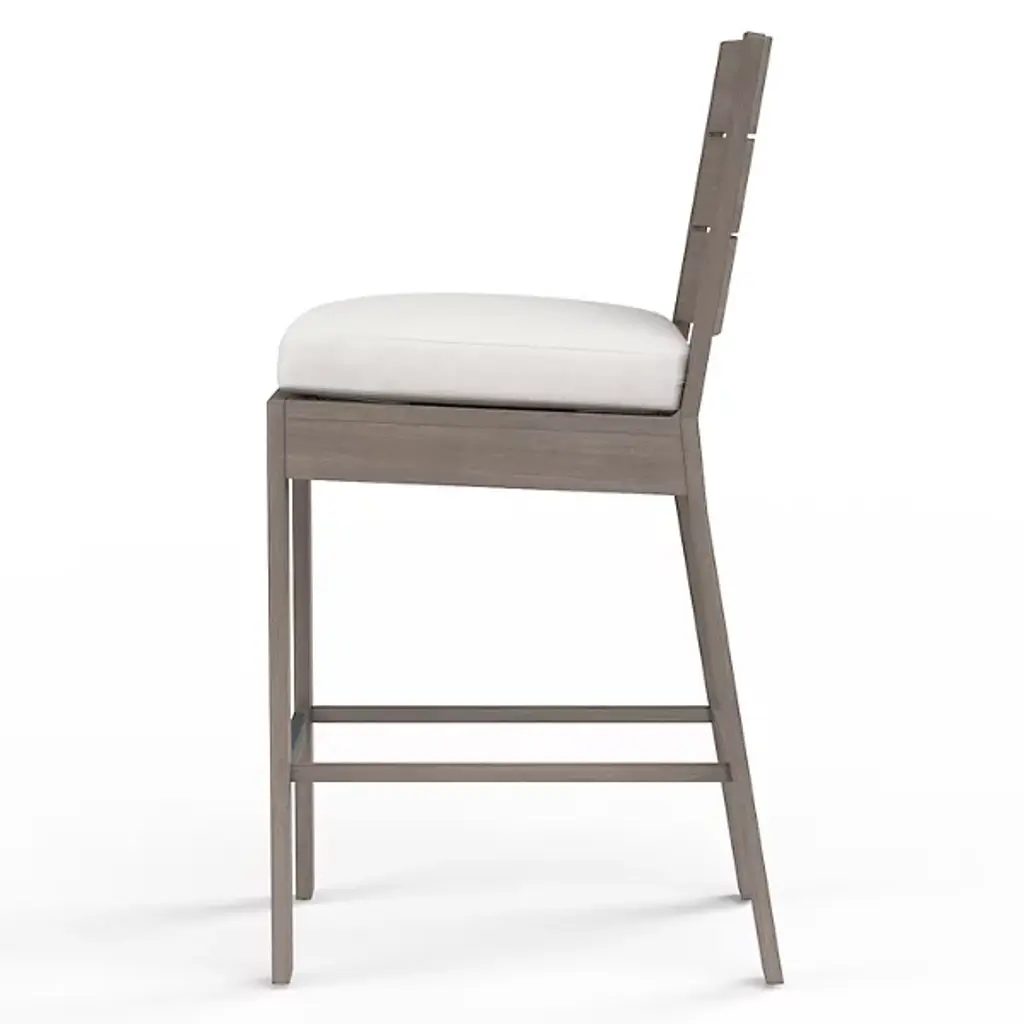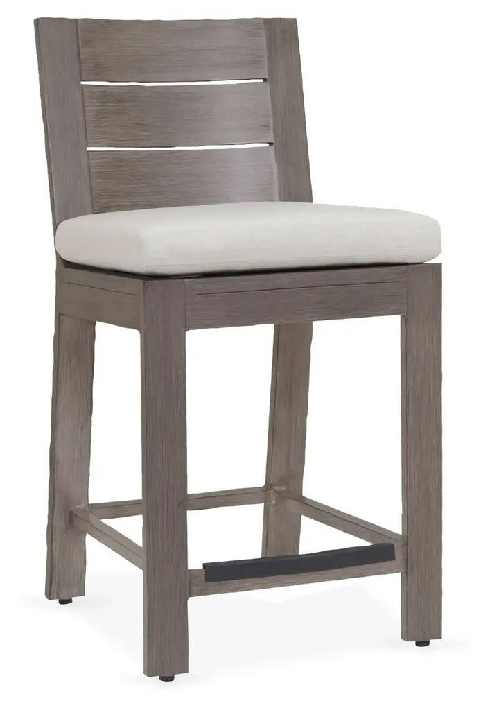 The Laguna Outdoor Counter Stool from Sunset West elevates casual dining through its bar-height proportions and horizontal slat back construction. The stool's geometric framework creates visual interest while maintaining ergonomic comfort during extended conversations. Plush seat cushioning contrasts with the structured aluminum frame that mimics natural wood grain throughout. Built-in footrests provide additional support, while clean lines work across various outdoor bar and dining configurations. Counter-height seating gains new sophistication through this well-proportioned design.