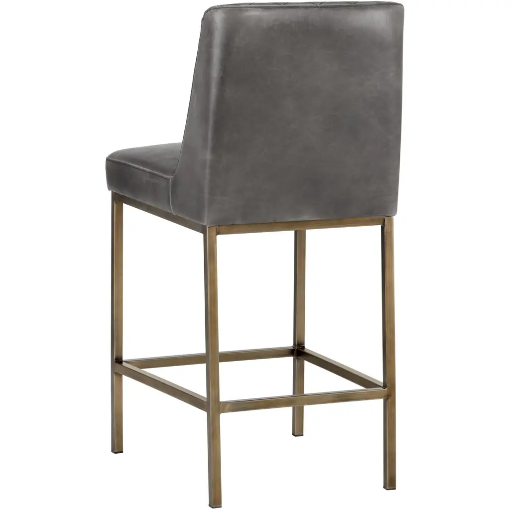 Transform bar and dining spaces with this classic counter stool. Stocked in overcast grey faux leather with diamond stitching on the interior seat back and an antique brass frame steel frame. Suitable for various dining, kitchen and bar spaces of all sizes. Handle With Care: This design has been crafted with faux leather. Faux leather is manufactured to reflect the natural characteristics of leather as such, colour variations, markings, wrinkles, grooves, and light scratches are appreciated characteristics. No two pieces will be alike. Visit our Product Care page for more information on how to ensure the lasting beauty of this piece.