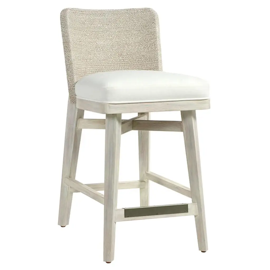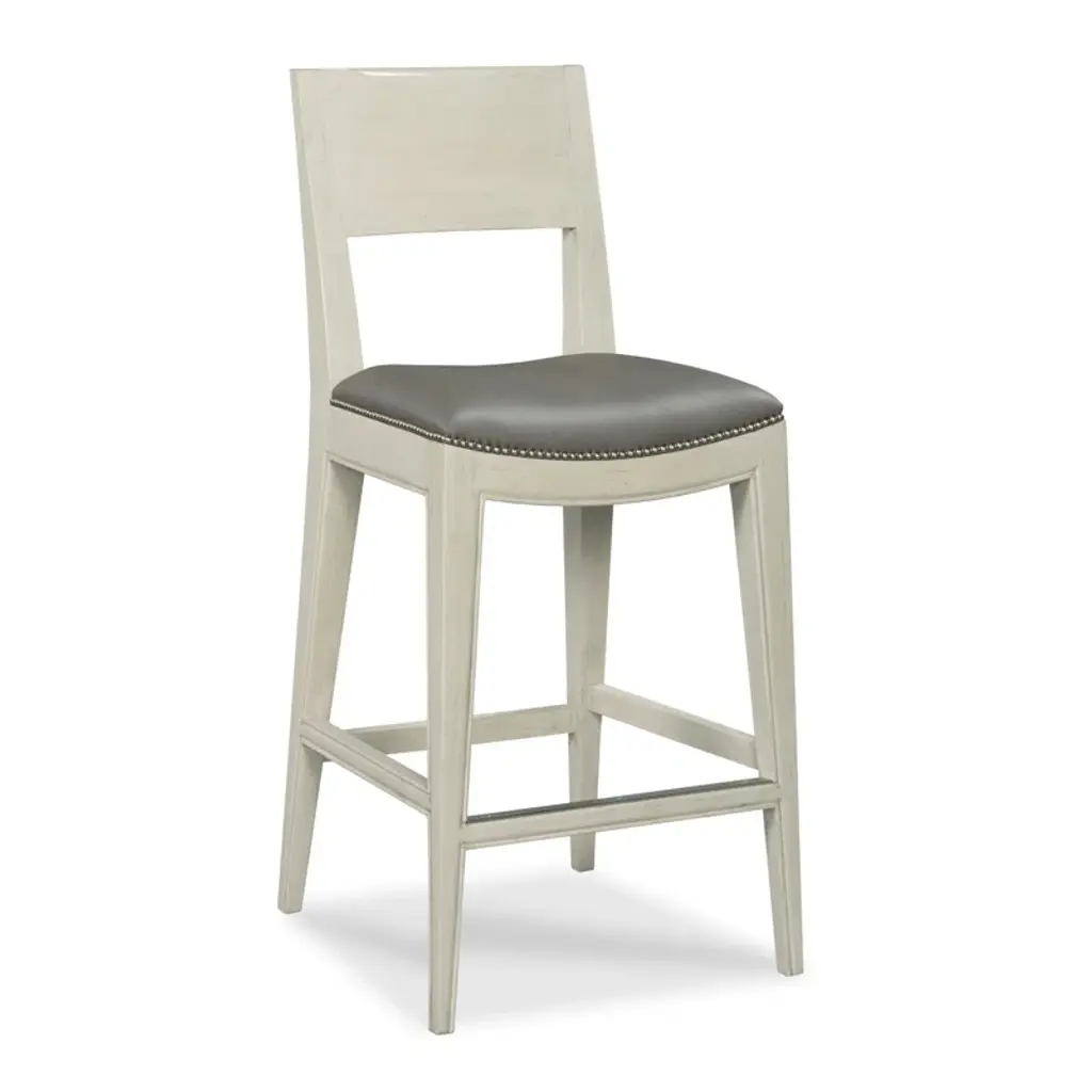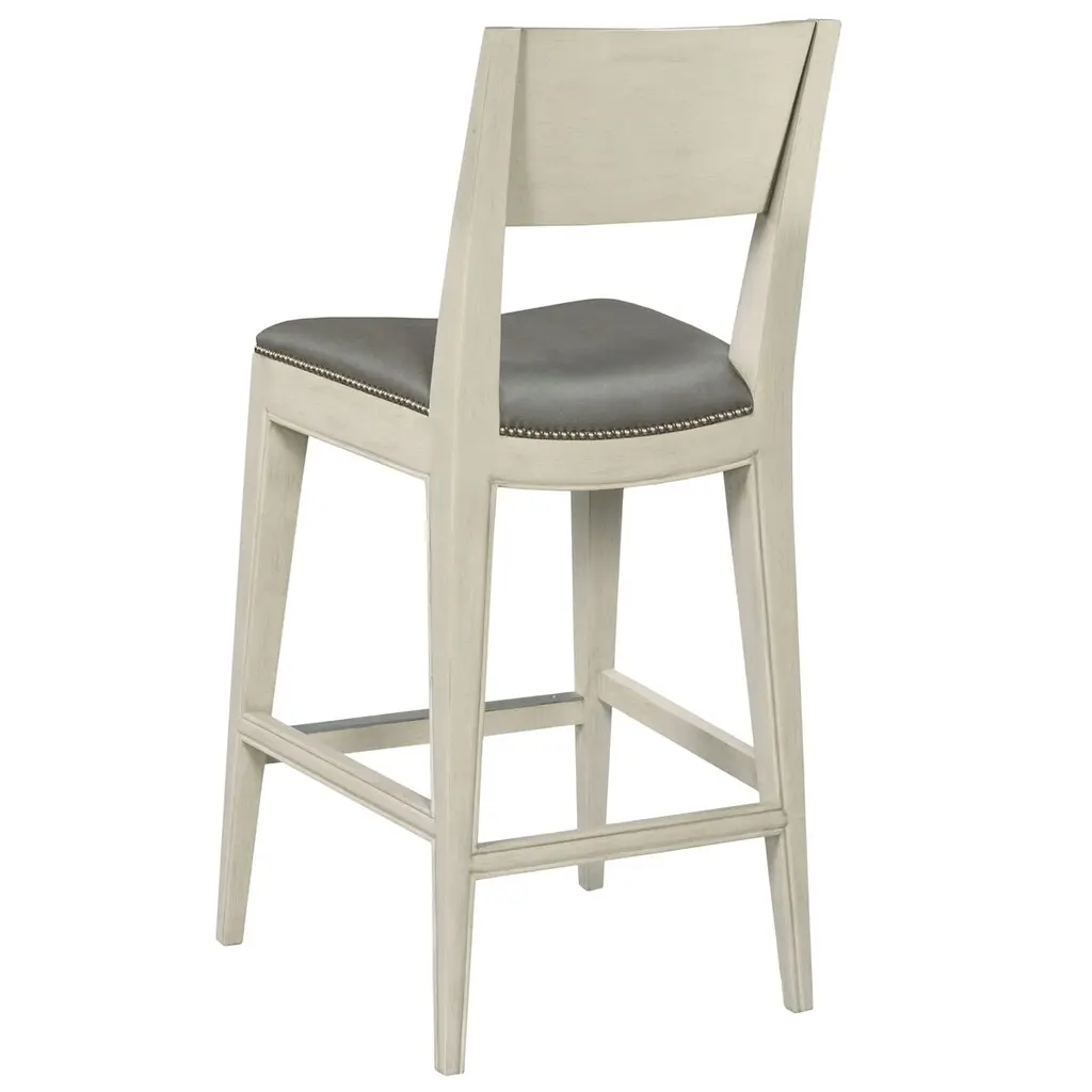 Silver nailheads around the comfortably cushioned seat and silver trim atop the footrest add an elegant glimmer to this gracefully proportioned counter stool.