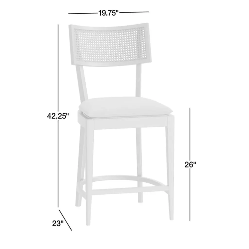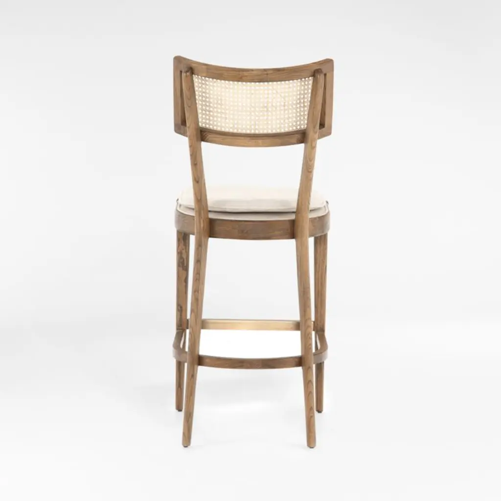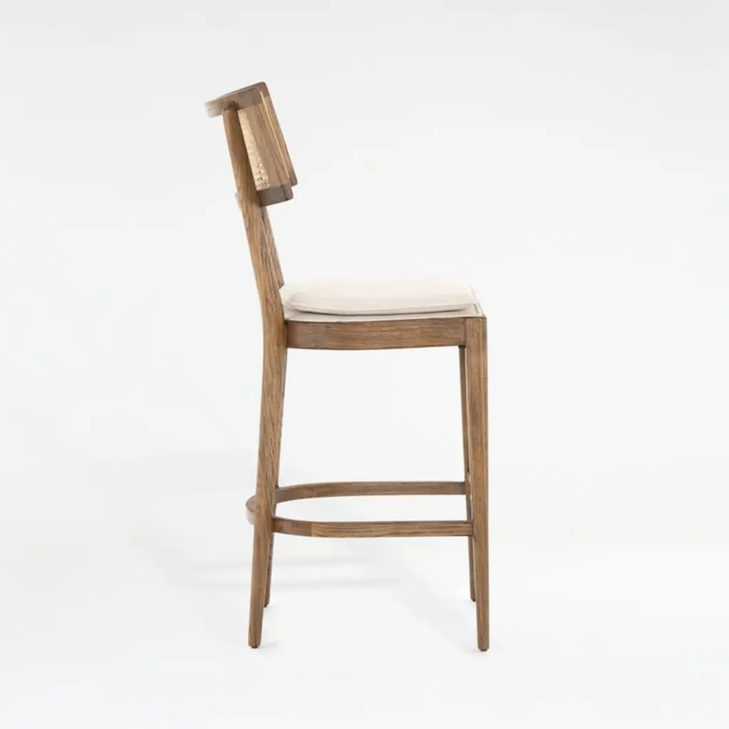 Mixed materials refresh the retro roots of our Libby counter stool. Solid nettlewood with a light toast finish shapes the stool's clean lines and crisp angles, framing a textural inlay of natural cane on the gently curved back. A slim cushion upholstered in a linen-blend weave layers on comfort while keeping the look clean and classic.The seat removes easily from the frame for effortless cleaning of the performance fabric. Thoughtful details include a brass-finished metal kickplate that protects the wooden footrest. Perfect for high-dining tables or kitchen counters, our Libby natural cane counter stool is a Crate & Barrel exclusive.