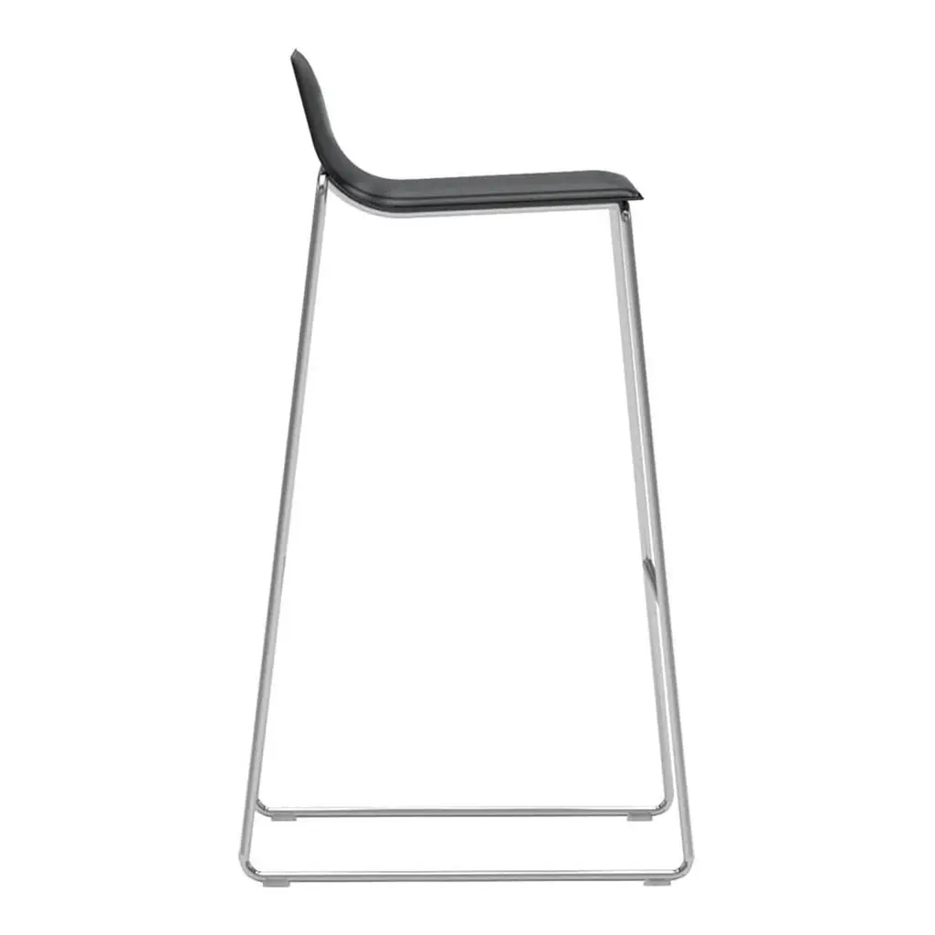 Counter stool with oak board seat and backrest and steel sled base in polished chrome finish. Fully upholstered shell. Lineal is a collection of stackable side chairs, armchairs, bar and counter height stools with upholstered seats made from curved plywood and metal or wood bases. The elegance of its lines allows the piece to be integrated into any environment. The designs forms have been reduced to the minimum elements, highlighting its formal synthesis. Its full meaning and function are clearly reflected in its name: a line that extends from its backrest to the seat and balanced by the high precision metal or wood base.
