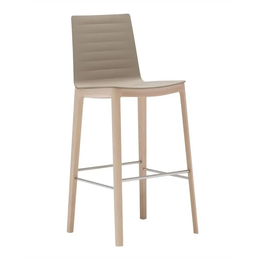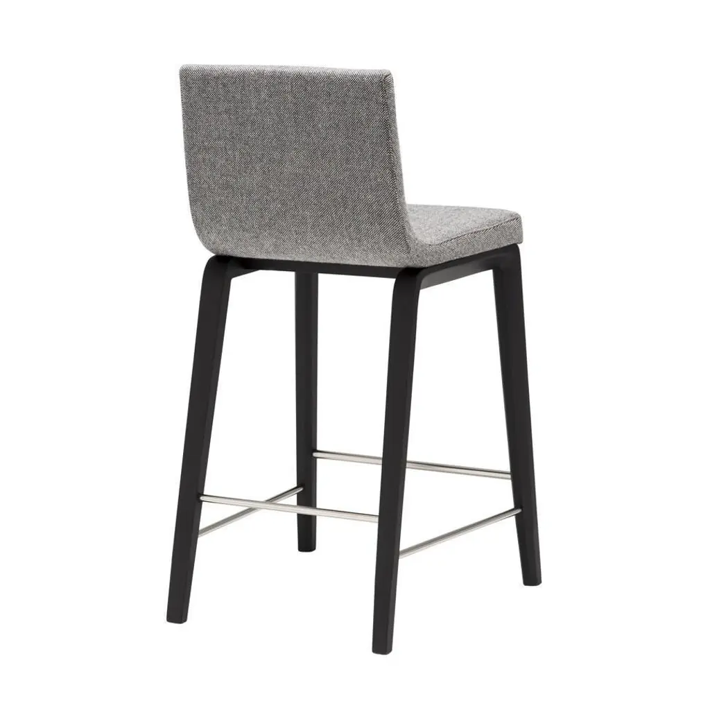 Counter stool with upholstered seat and backrest and 4-legged solid beech wood base. Lineal Comfort is a collection of upholstered chairs, seats, armchairs and barstools. The design is constructed from flexible injected foam with either solid wood, steel or aluminum polished metal bases. It is an ideal addition to any private, public or space. It utilizes the pure forms from the Lineal family of seating with a luxurious, resistant and comfortable materials. It is featured in a wide range of upholsteries and wood finishes, increasing its versatility and ability to integrate into architectural spaces of very different styles and purposes.