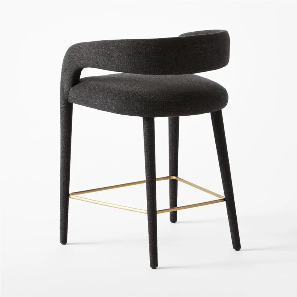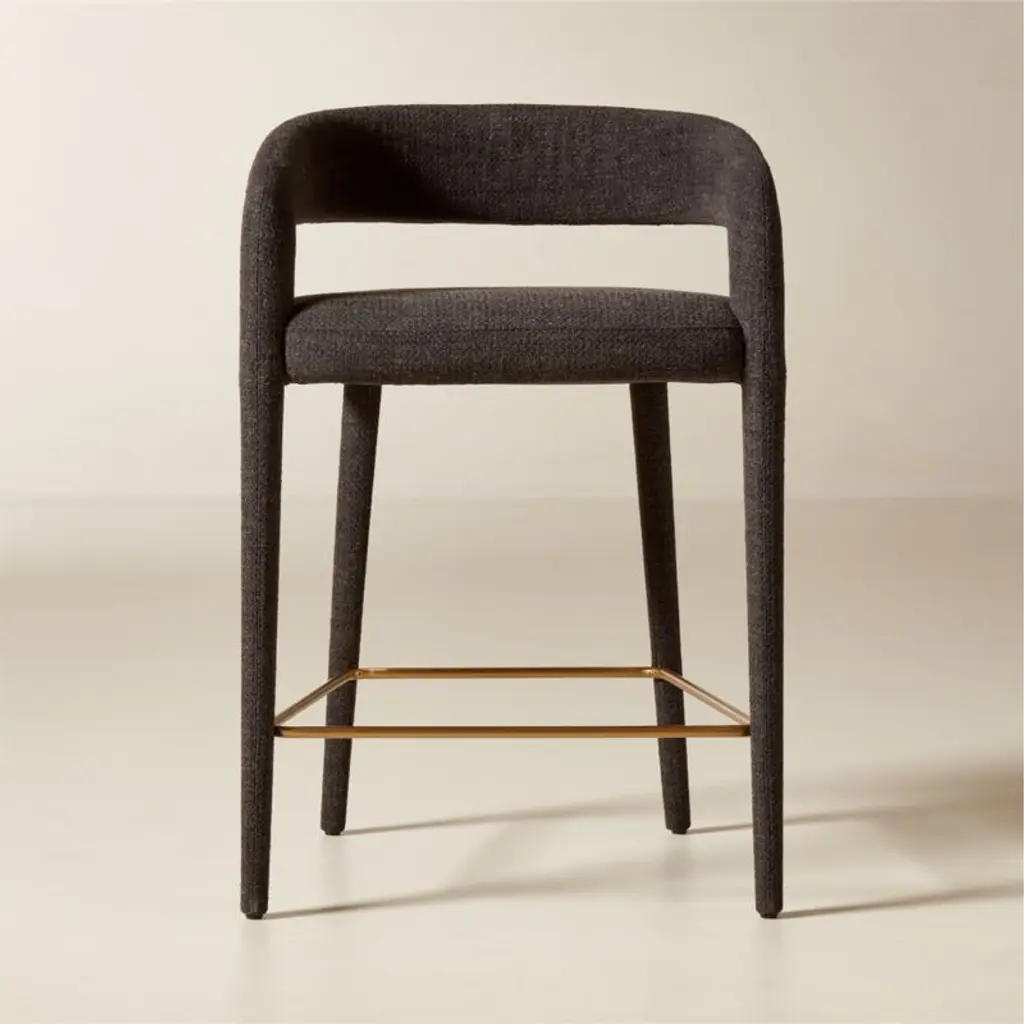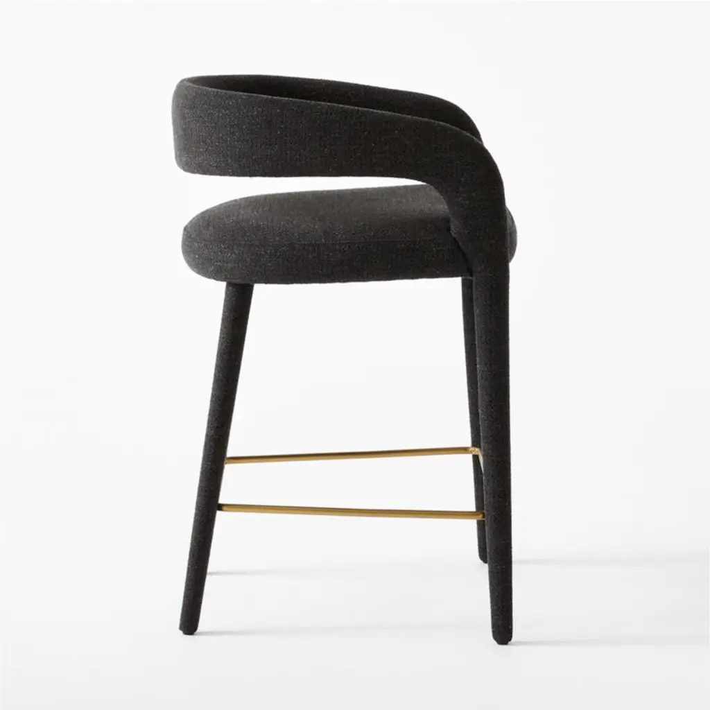 Designed by fashion-designer-turned-home-designer Brett Beldock, this sculptural counter stool brings sophistication to any space. Updating the traditional barrel chair design, this fresh take is lighter and more open. Upholstered in a charcoal performance fabric. CB2 exclusive.