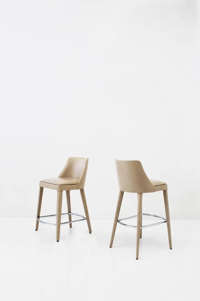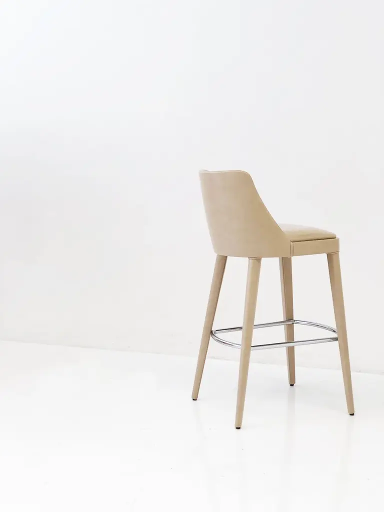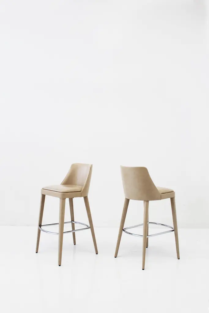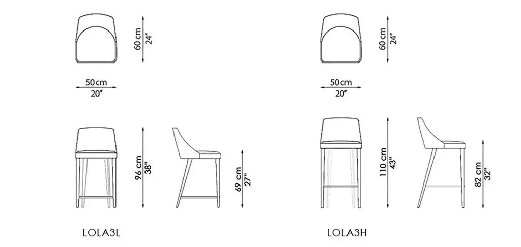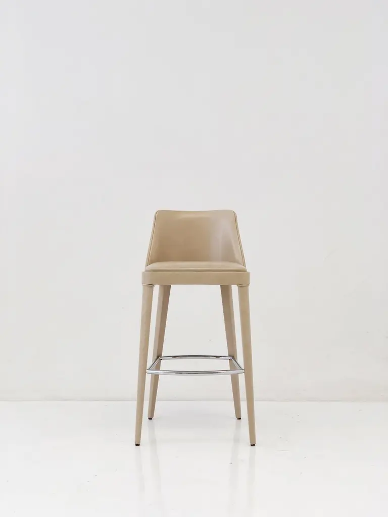 The Lola stool – which is available in the high and low version – has a peculiarity that makes it really appealing: the size of the seat. Unlike traditional bar or kitchen counter stools, its dimensions make it very comfortable. In fact, the seat is 50 centimeters, and in addition to this, the backrest supports the back very well. The result is that you can sit on the Lola stool for hours with maximum comfort.It is no coincidence that the Lola stool was designed starting from the Lola chair, of which it reproduces the measurements. The Lola chair is a great classic revisited in proportions and finishes, to become more comfortable and more fashionable. The four slender legs support a seat of generous proportions: fifty centimeters wide. The ergonomic and enveloping backrest supports your back and at the same time gives you maximum comfort. Even the stool version, like the chair, therefore guarantees total comfort.The finish can be in leather or fabric, and the legs are also fully upholstered. Here we propose the version in leather (the versions in fabric have cheaper prices).One of the characteristics of Lola (both chair and stool) is the detail of the piping that follows the profile of the seat and back, hiding the joining points of the fabric.