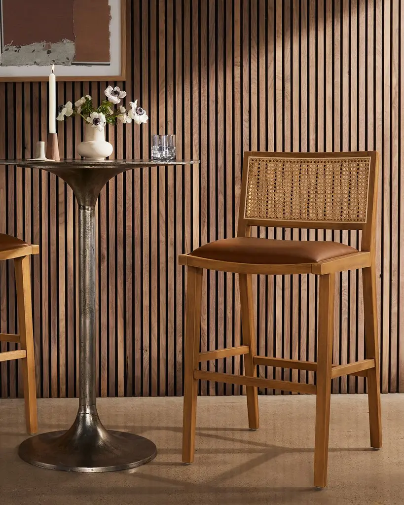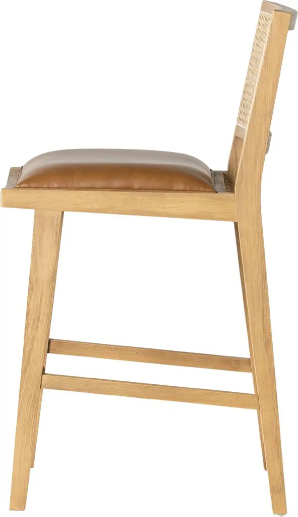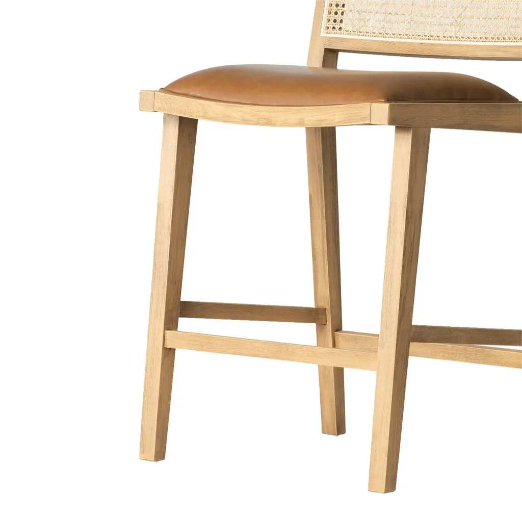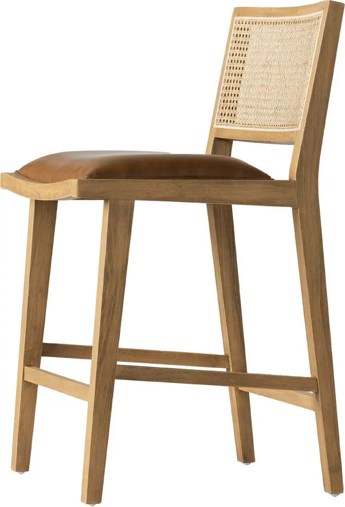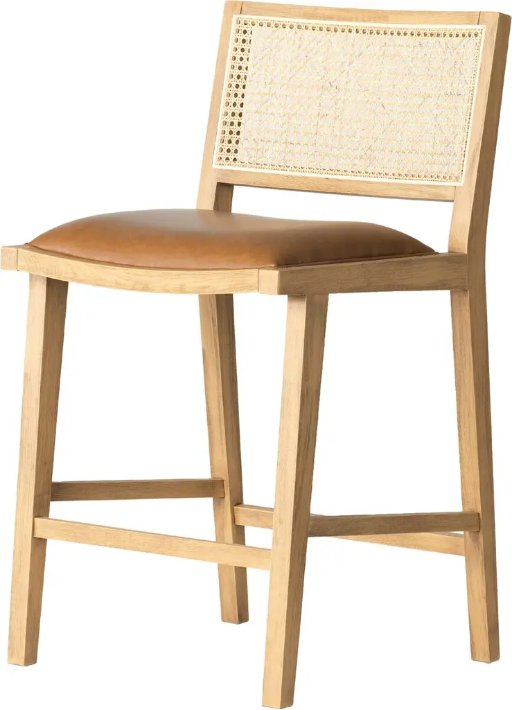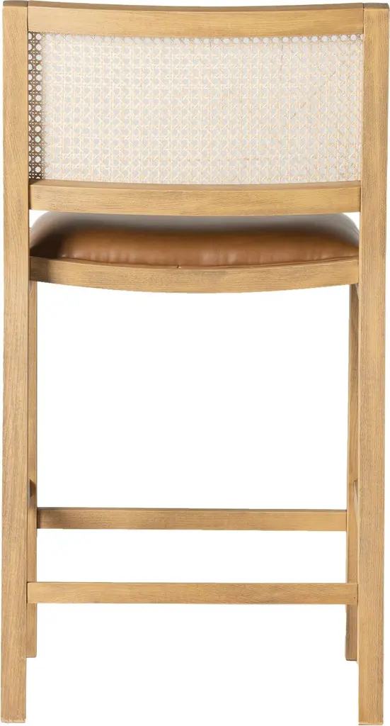 A trio of inviting materials—a beech frame, a woven-cane back, and faux-leather seat upholstery—make this counter stool a warm addition to a kitchen or entertaining area.