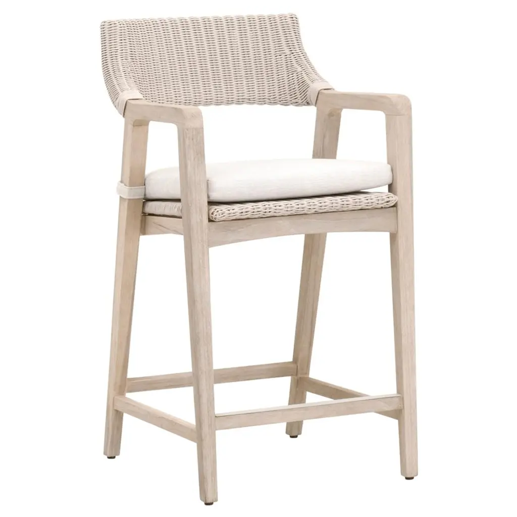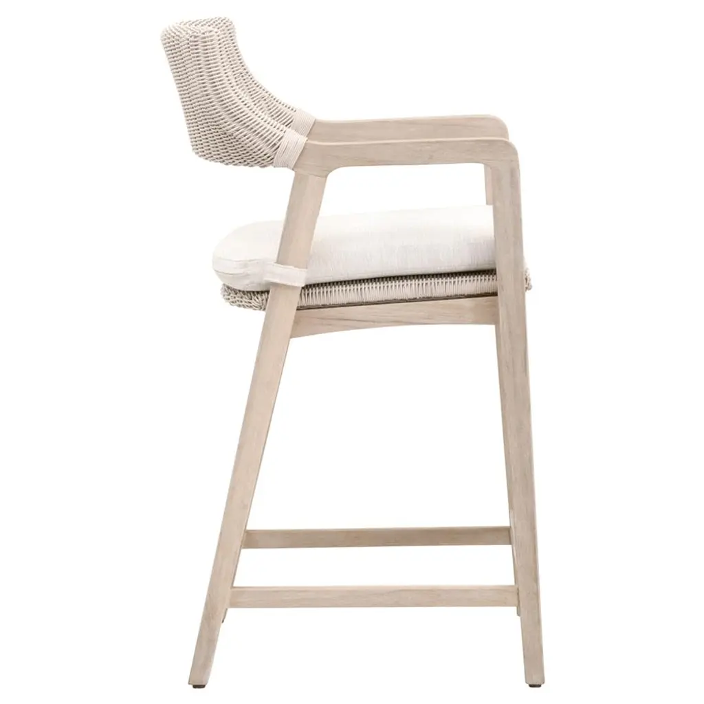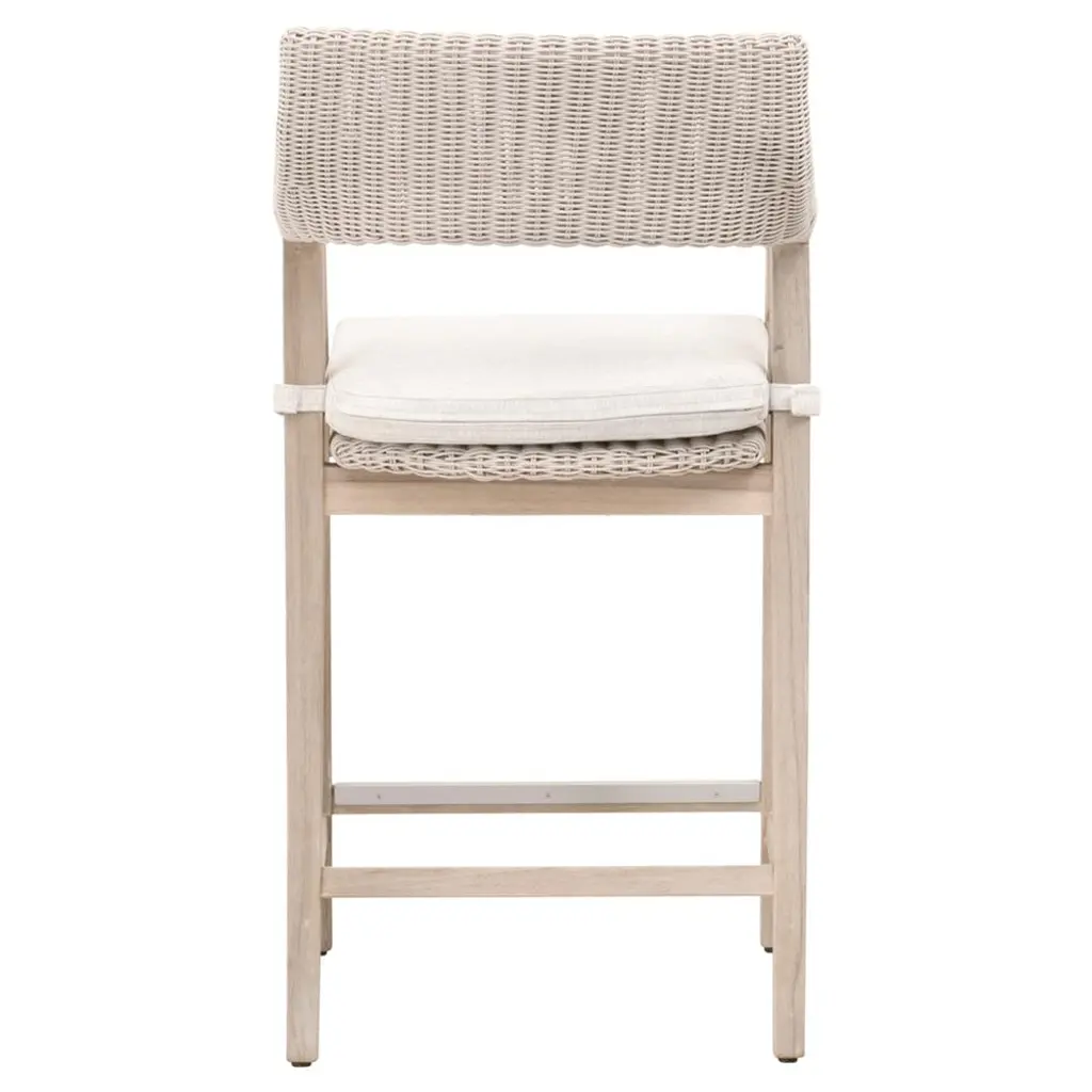Lucile Coastal Beach White Cushion Woven Wicker Grey Teak Outdoor Counter Stool