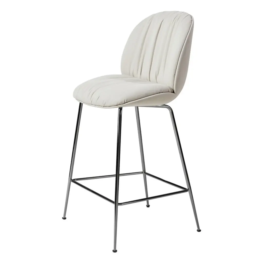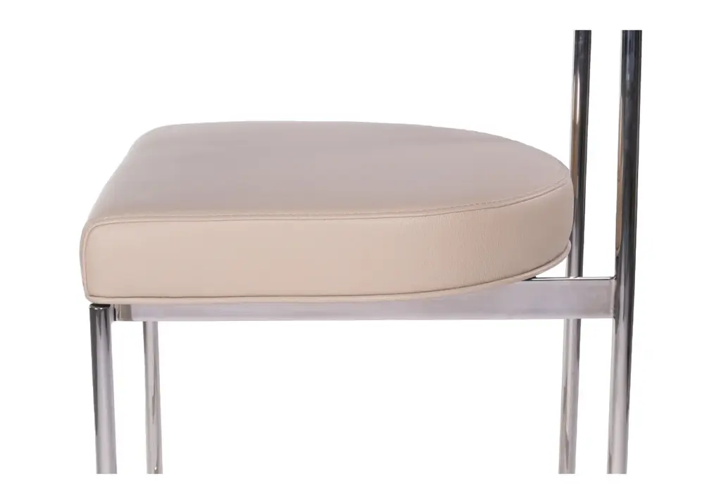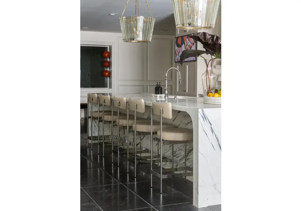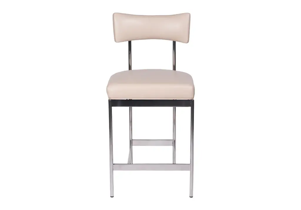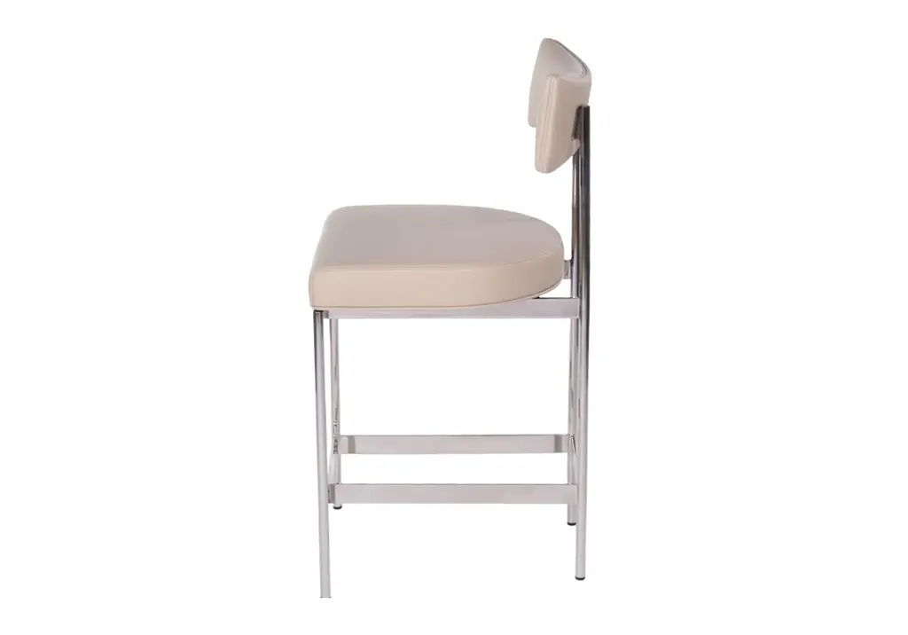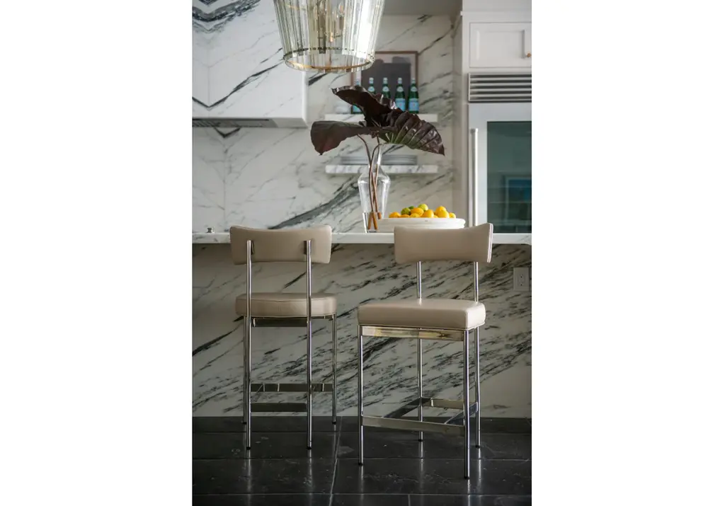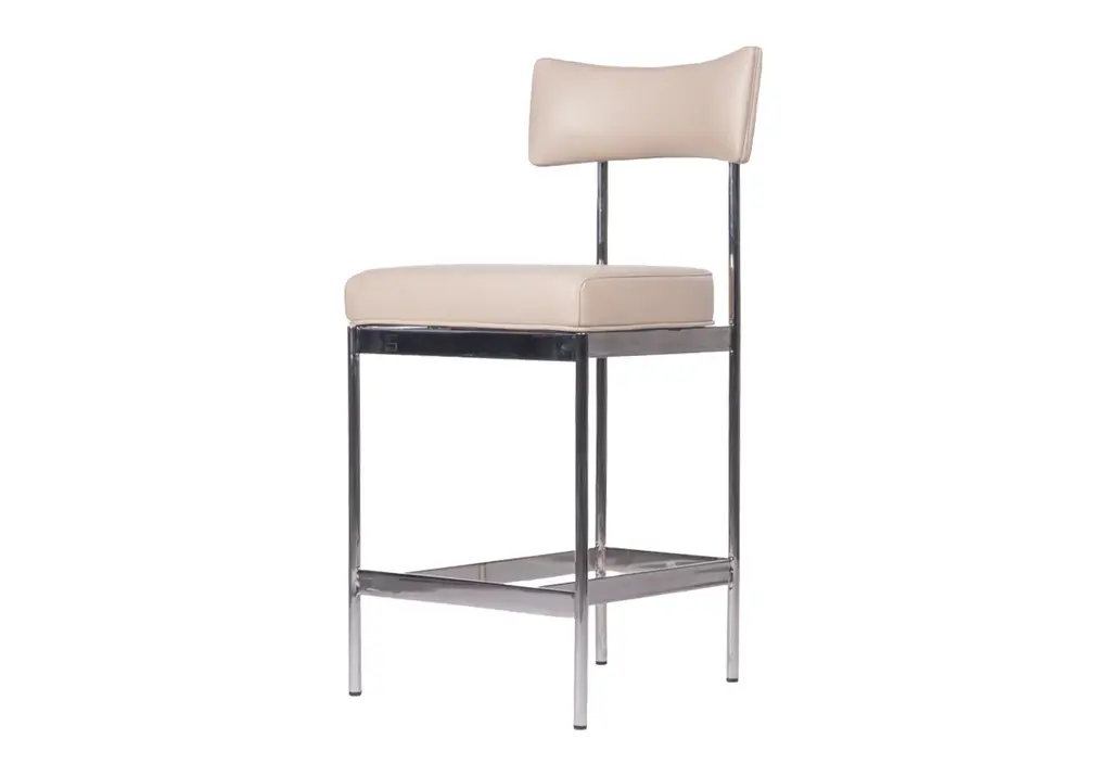 The Luna Counter Stool showcases a sleek, polished metal frame complemented by a plush leather seating and back rest. Its clean form features a mix of curved and straight lines for a look of simple sophistication, styling well in any kitchen or dining room.