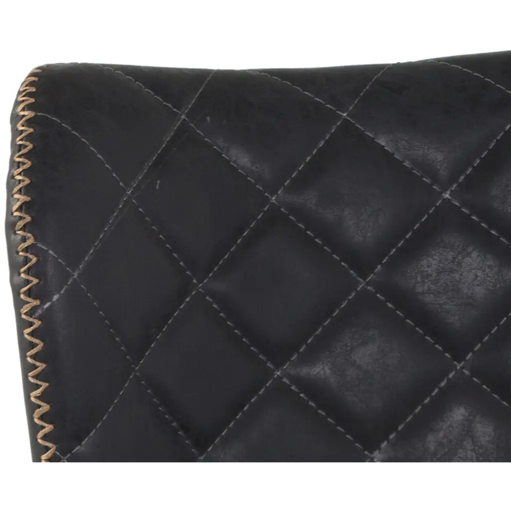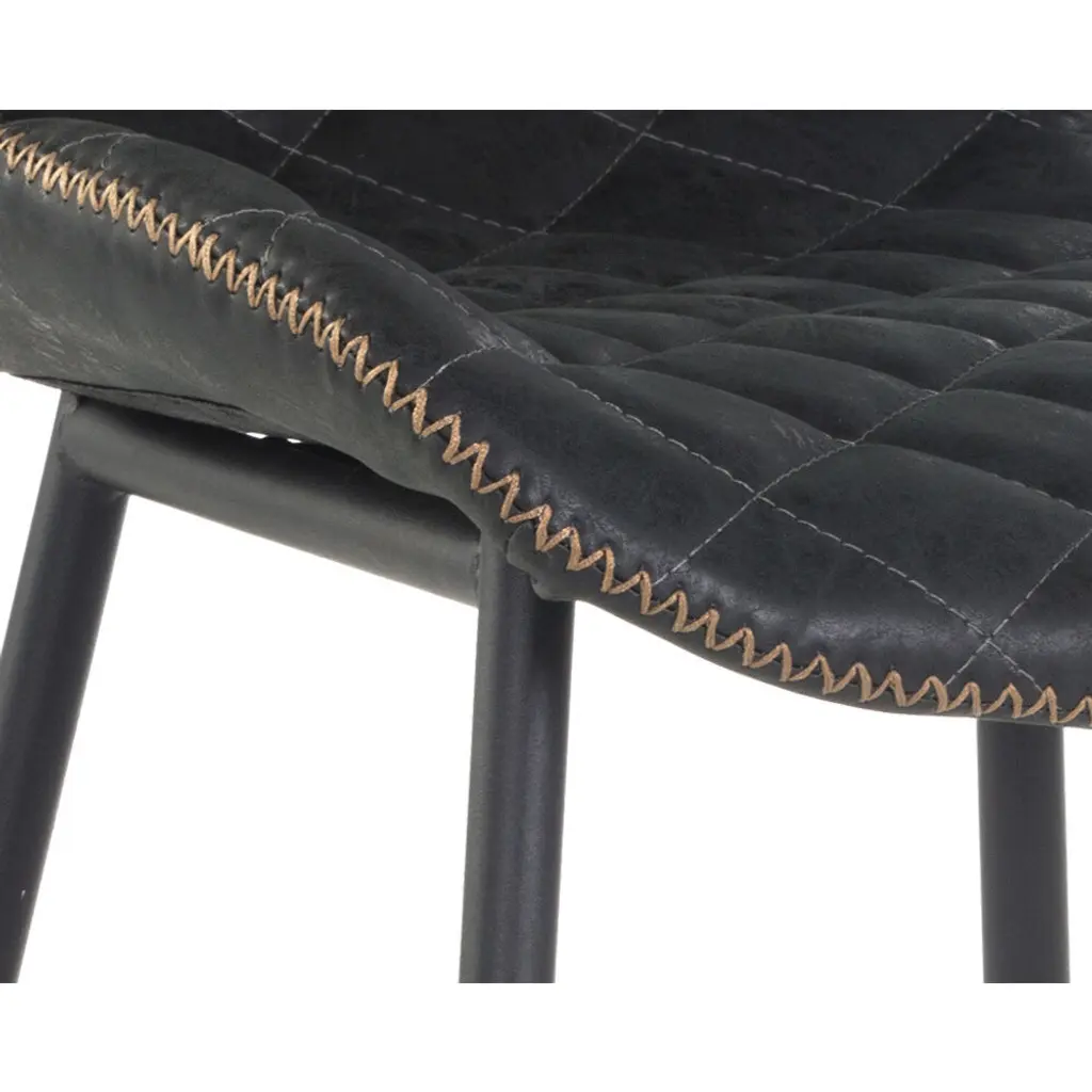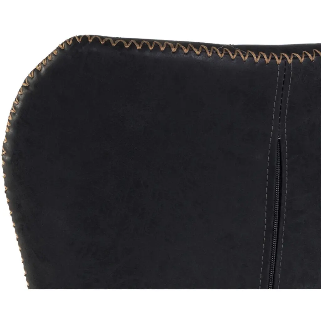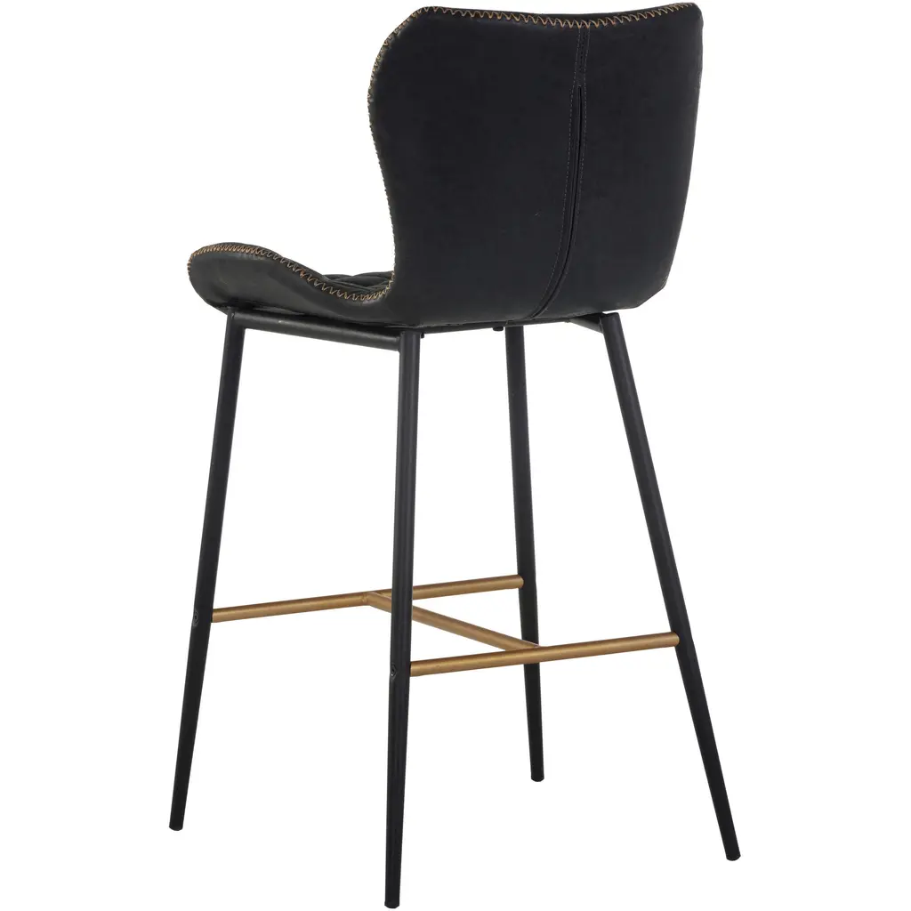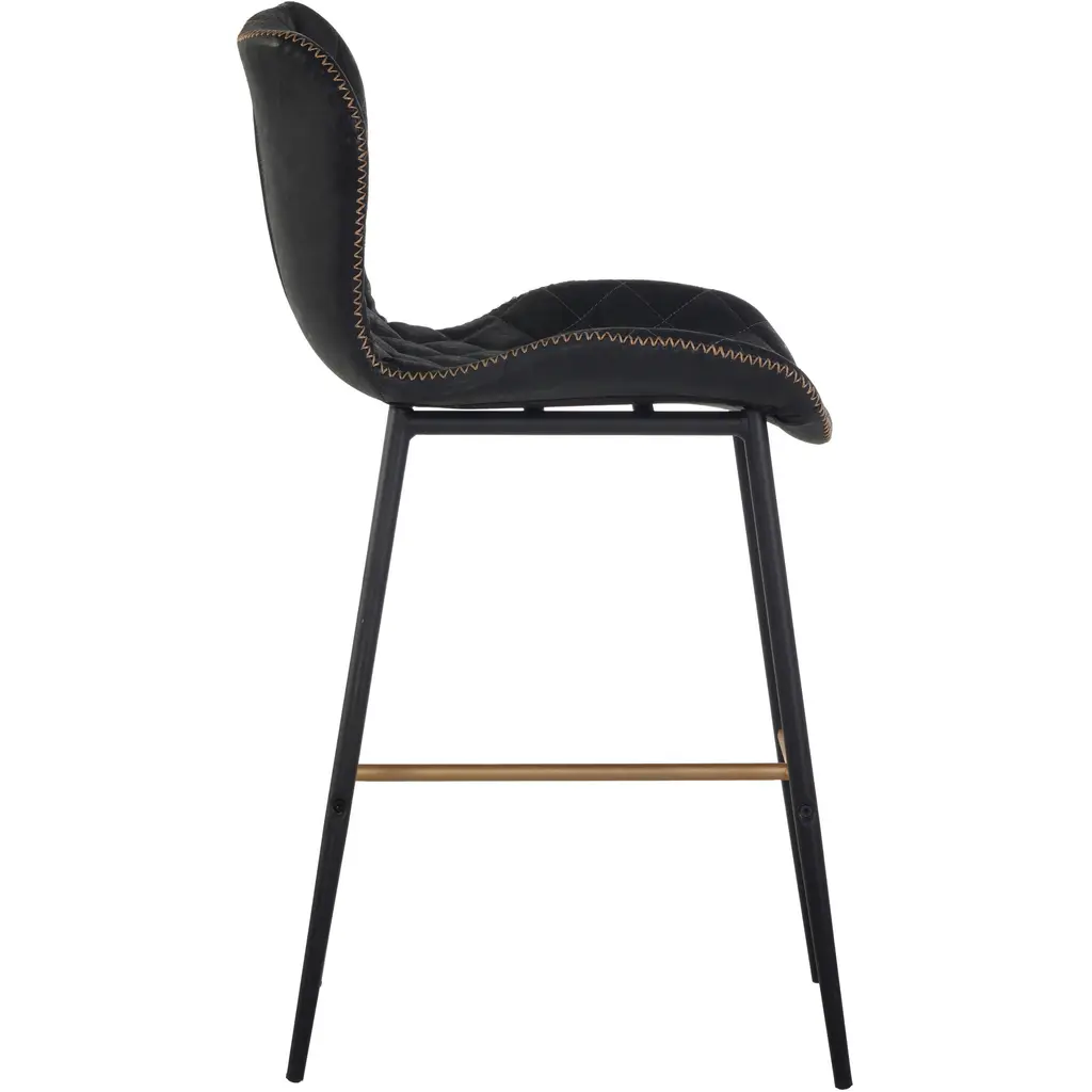 A stylish counter stool featuring a sculpted diamond-stitched seat and exposed zig-zag stitching along the seat frame. Stocked in antique black faux leather with black steel legs. Stretchers in a champagne gold painted finish complete the look. Suitable for various dining, kitchen and bar spaces of all sizes. Handle With Care: This design has been crafted with faux leather. Faux leather is manufactured to reflect the natural characteristics of leather as such, colour variations, markings, wrinkles, grooves, and light scratches are appreciated characteristics. No two pieces will be alike. Visit our Product Care page for more information on how to ensure the lasting beauty of this piece.