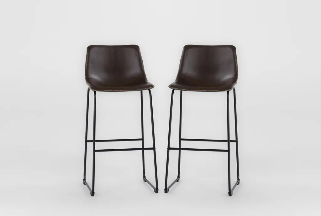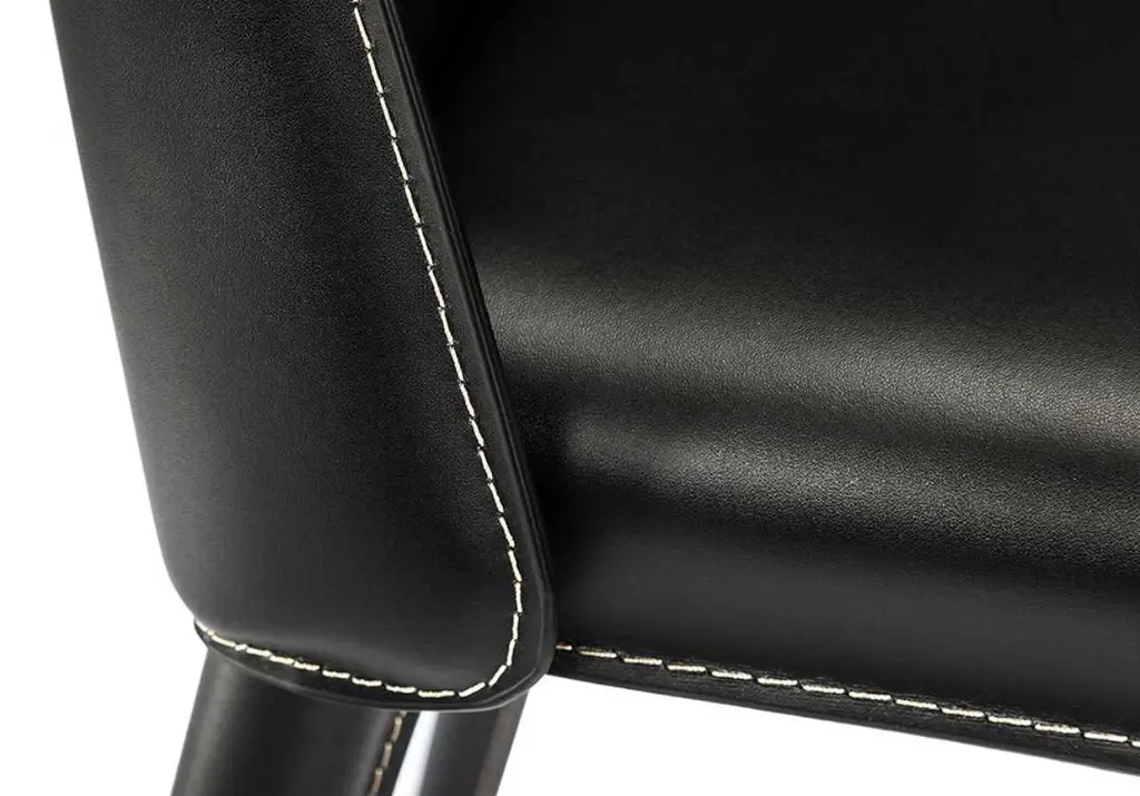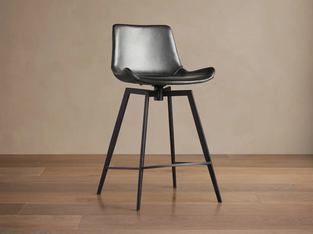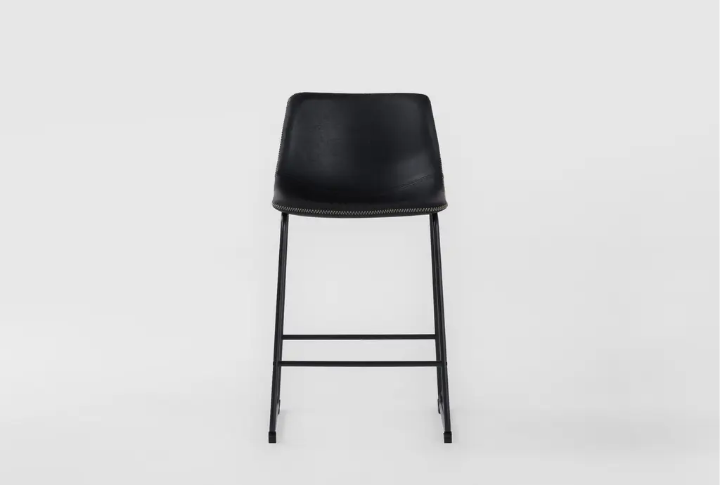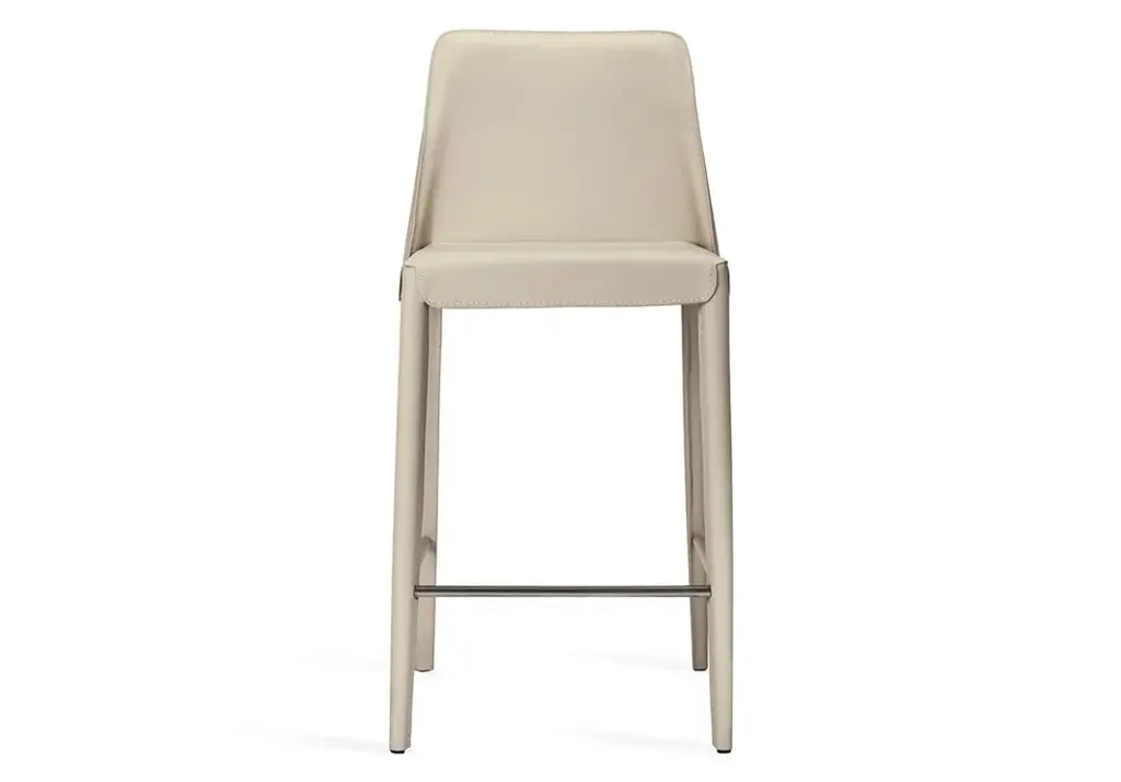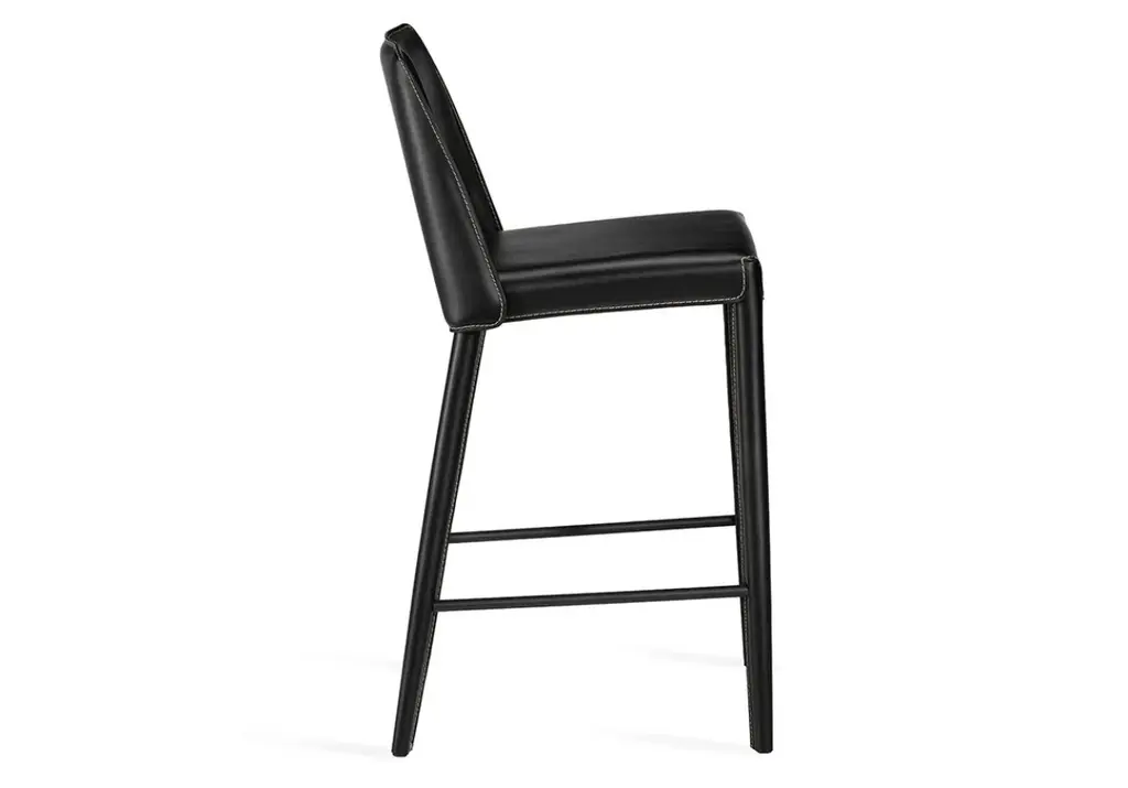 Sleek and luxurious, this counter stool makes an elegant statement with its straightforward design upholstered in leather. Available in deep black or cool sand, style at a kitchen island or counter for a tasteful look.