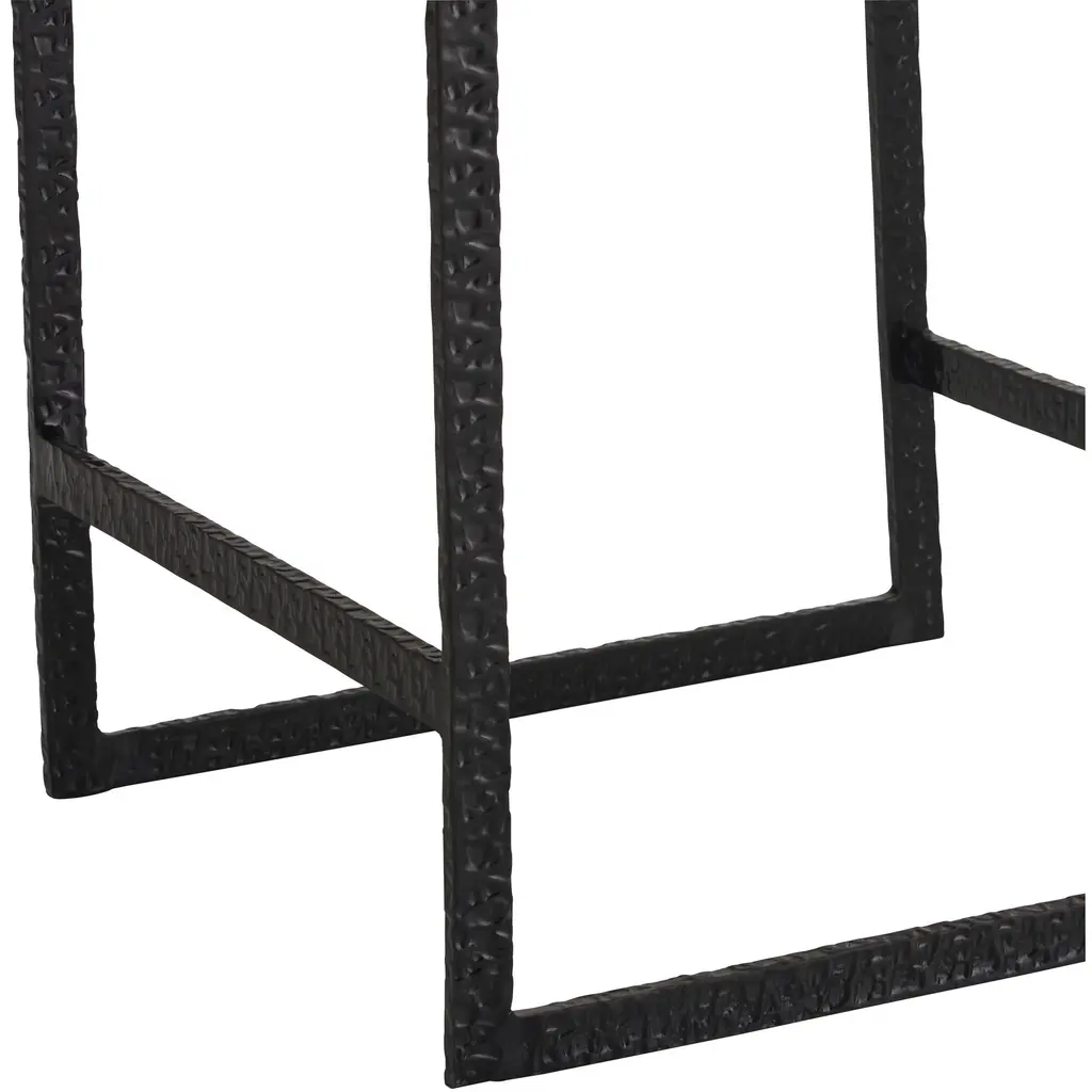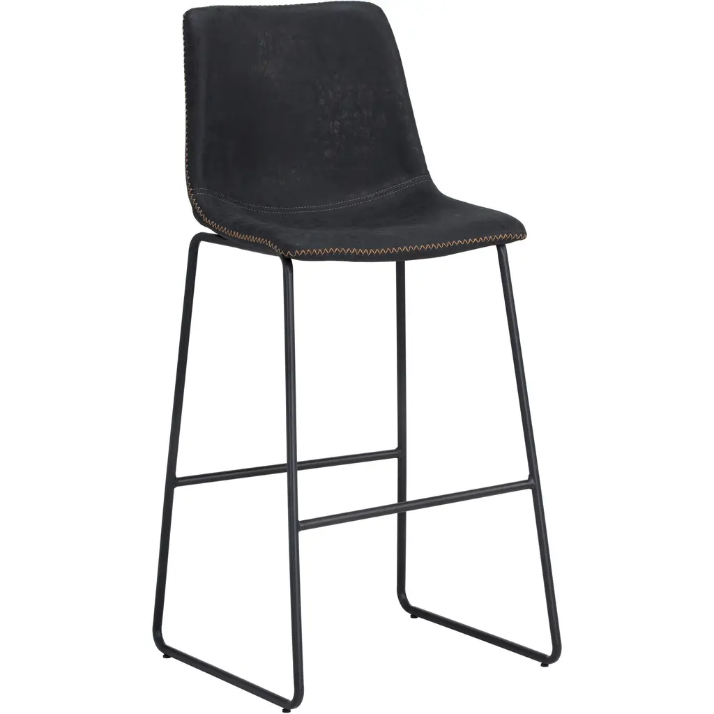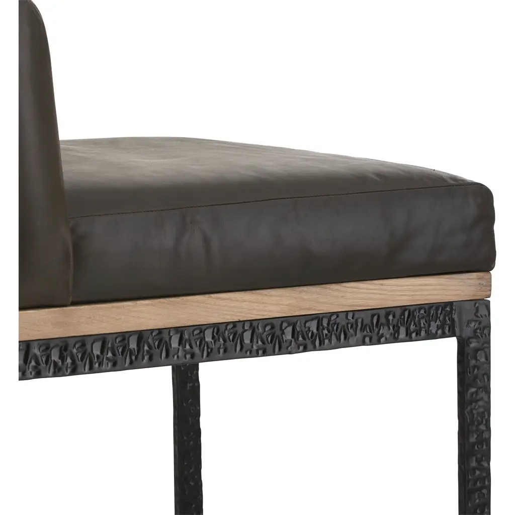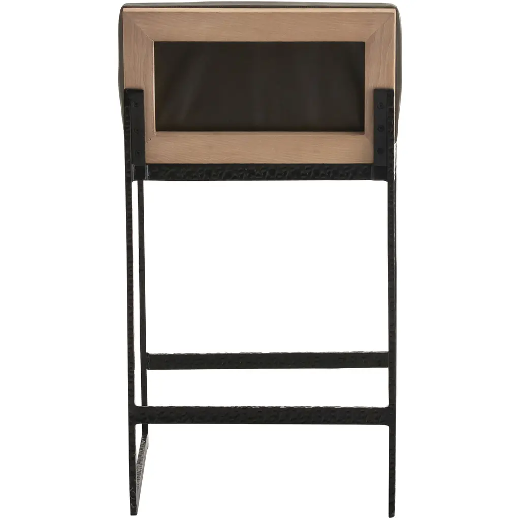 Textural, hammered blackened iron. Rich, elegant graphite leather. Natural blonde wood. The trifecta of these materials comes together to form this distinctly modern bar stool. Its masculine air adds a stateliness to a space. Leather and finish will vary.