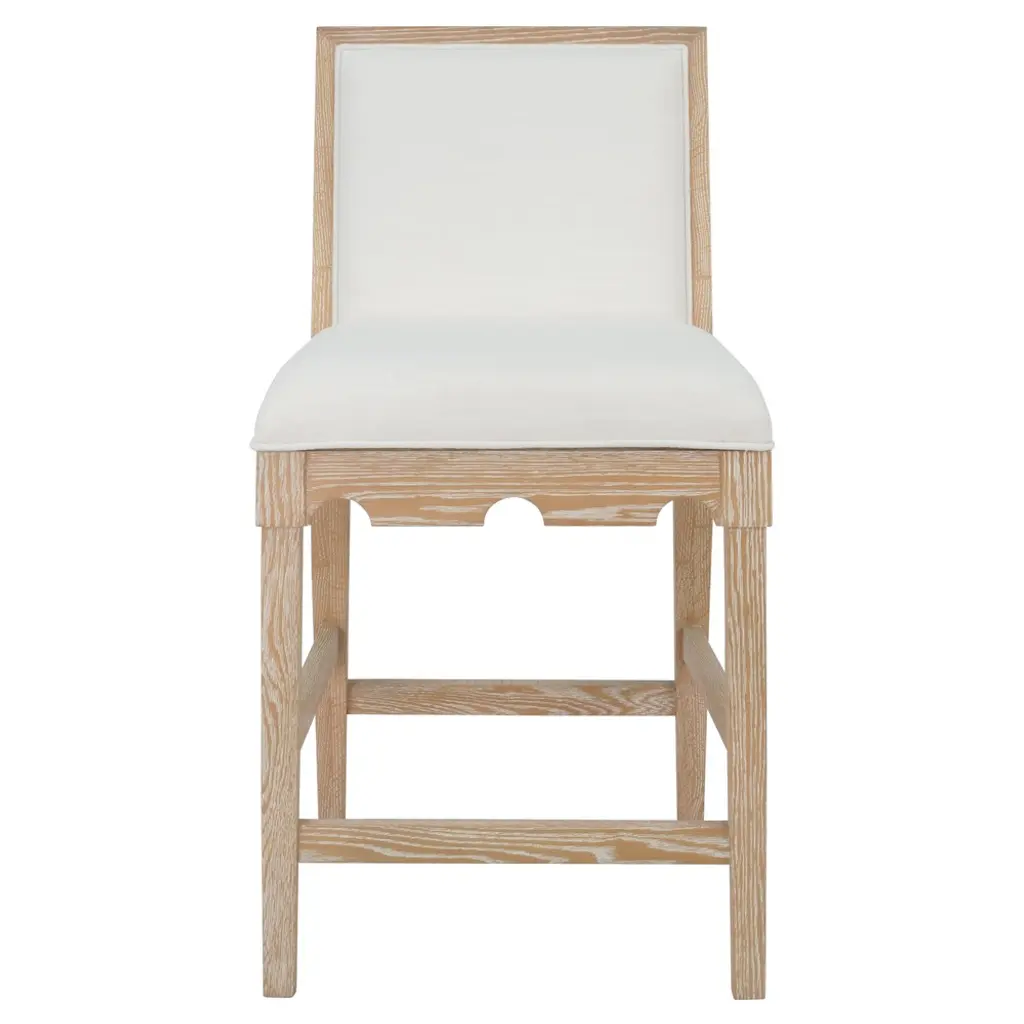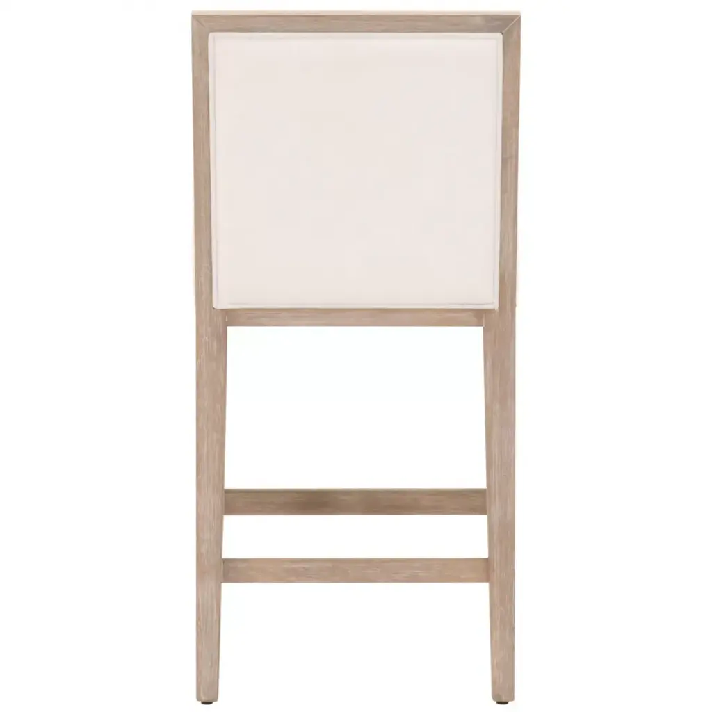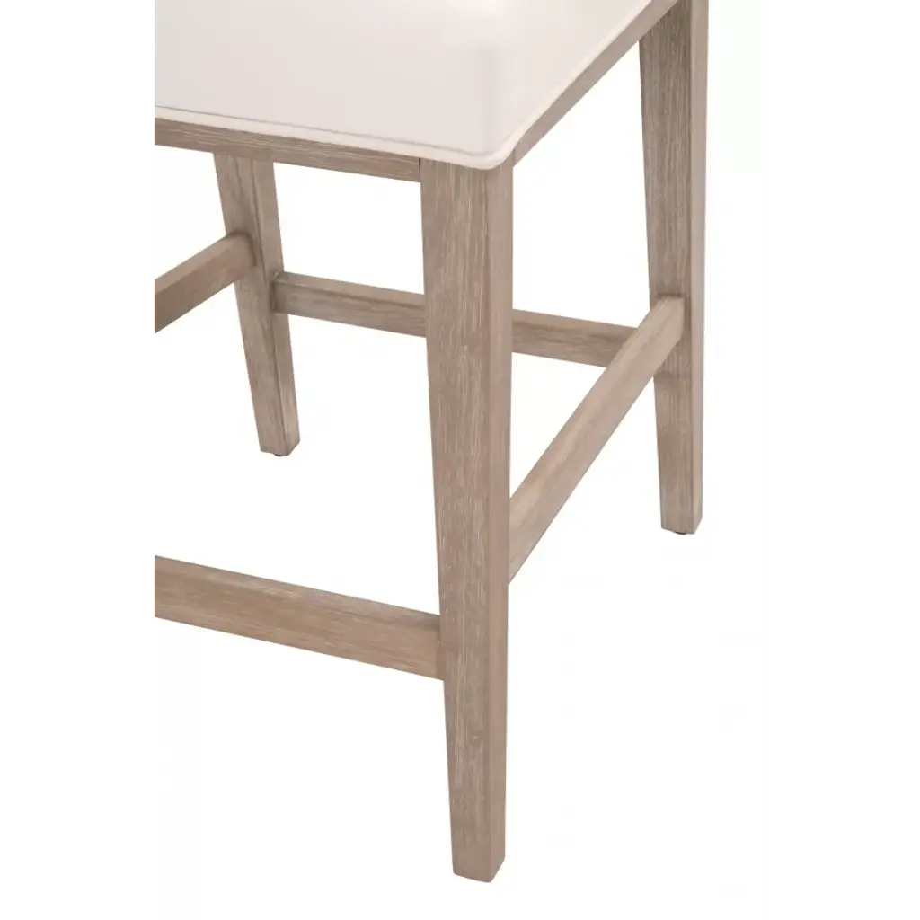 These classic counter stools are suited for many different styles of kitchens and bars. Their clean, simple lines and neutral tones make these chairs a perfect fit for transitional, farmhouse and coastal looks. The seat and back of the chair are upholstered with high performance fabric that make cleaning and maintenance a bit easier. The chair backs are made of solid wood and an exposed wood frame with a natural gray finish, which nicely complements the white fabric. It also features four-way leg stretchers for extra support and strength. These counter stools will be the perfect finishing touch to your bar or counter seating area.