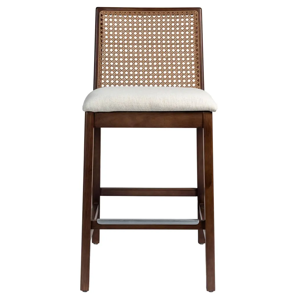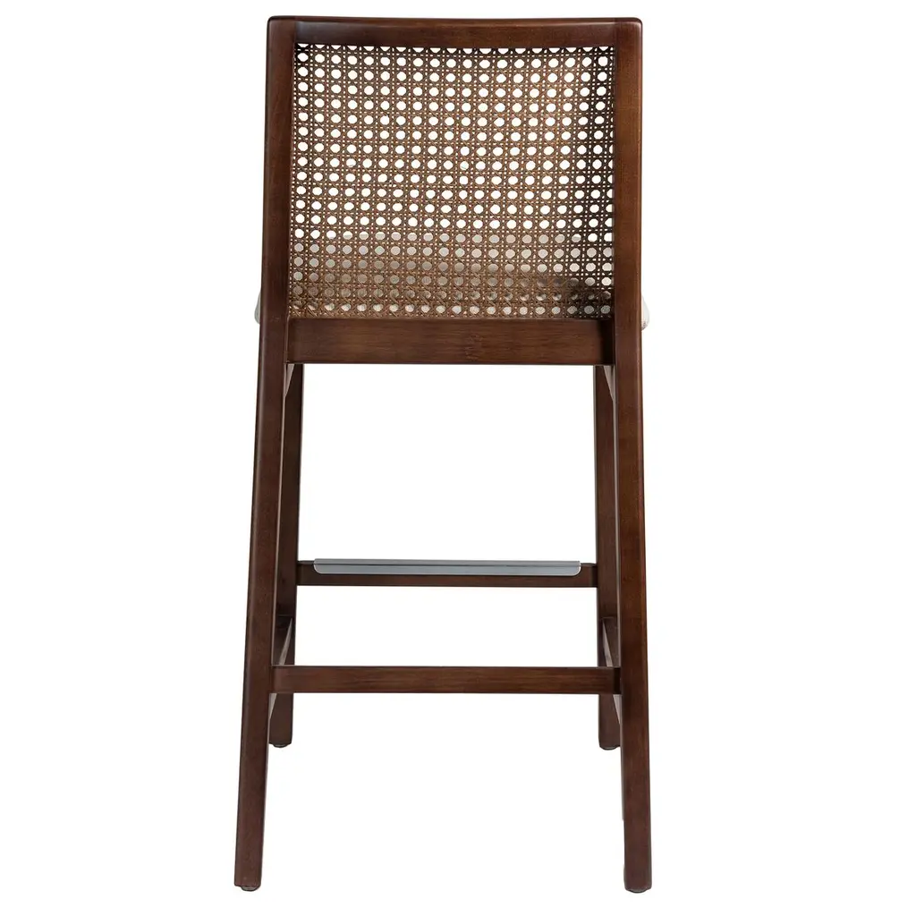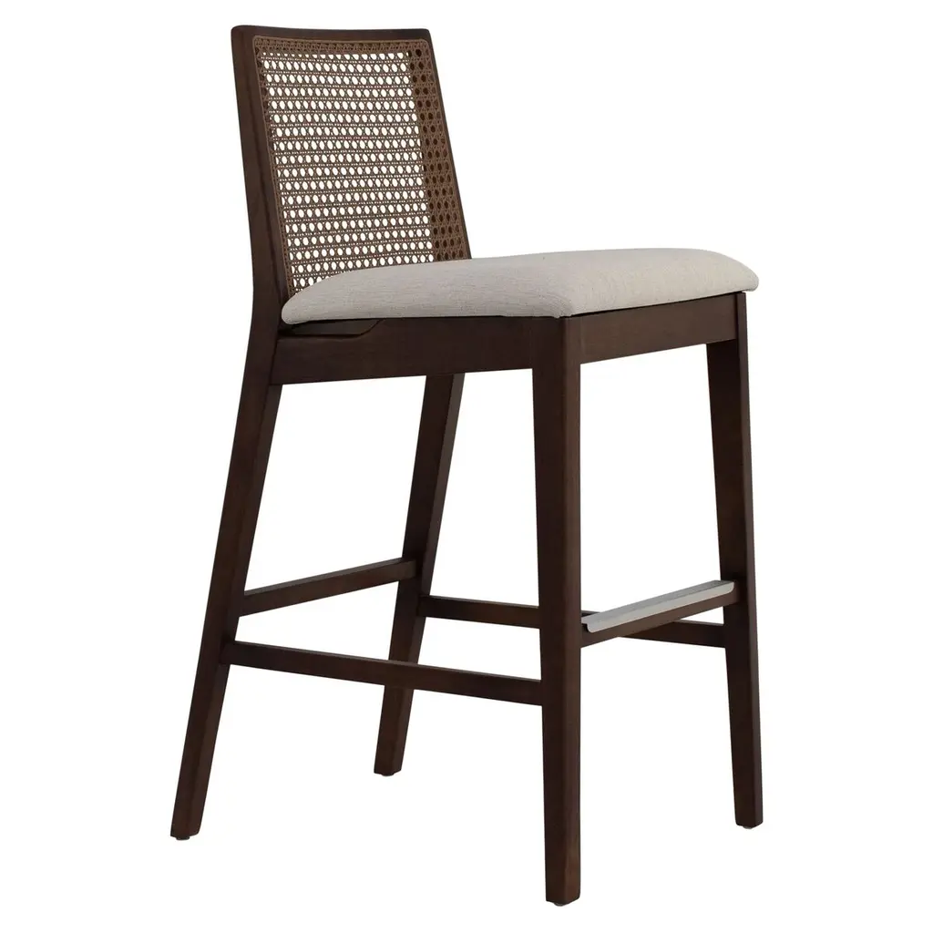 This counter stool's cane back panel and woven upholstery provide a textural contrast to the sleek frame, which is crafted of durable (and beautiful) tauari wood. The fiber-wrapped high-density foam seat cushioning ensures long-lasting comfort.
