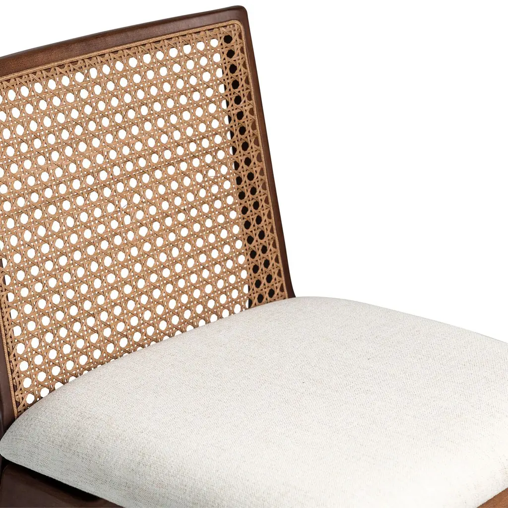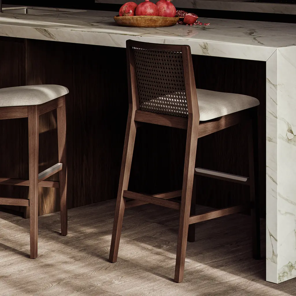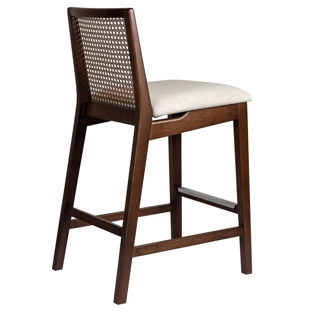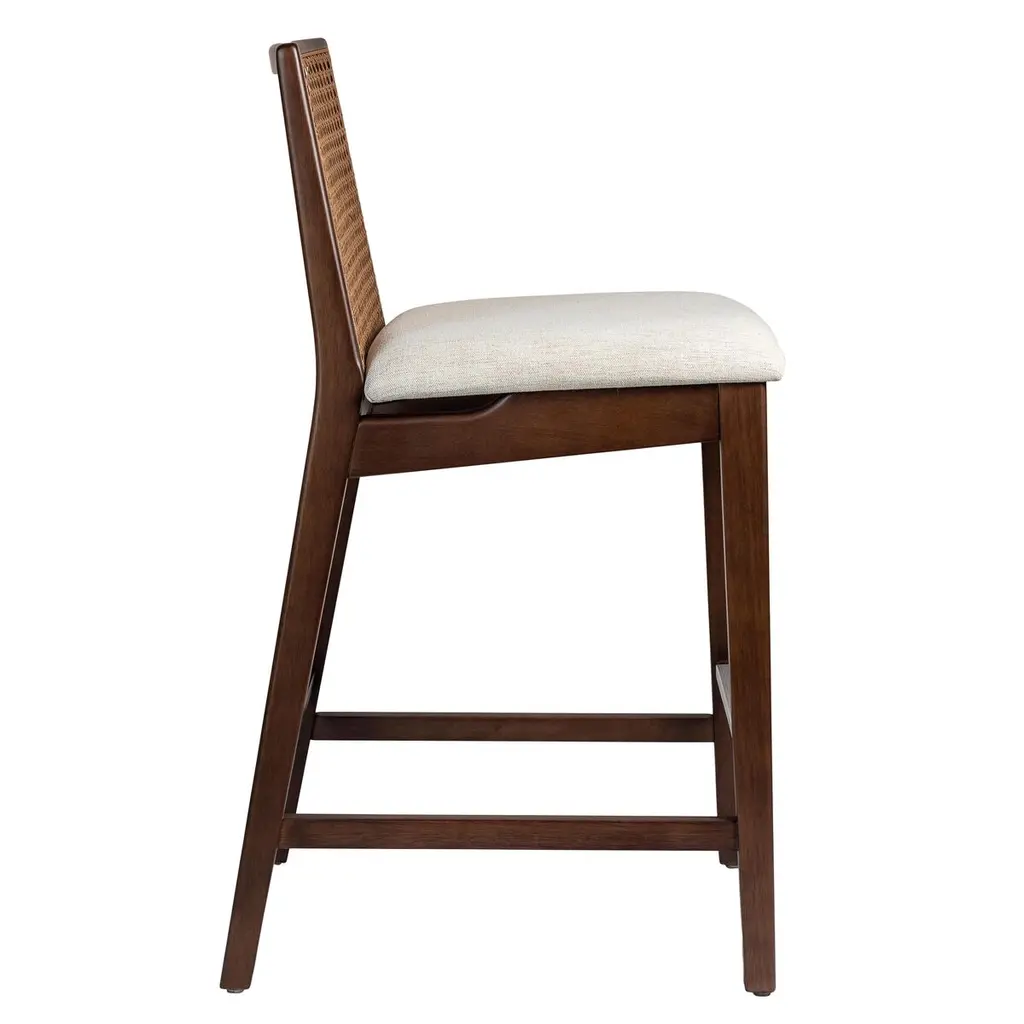 This counter stool's cane back panel and woven upholstery provide a textural contrast to the sleek frame, which is crafted of durable (and beautiful) tauari wood. The fiber-wrapped high-density foam seat cushioning ensures long-lasting comfort.